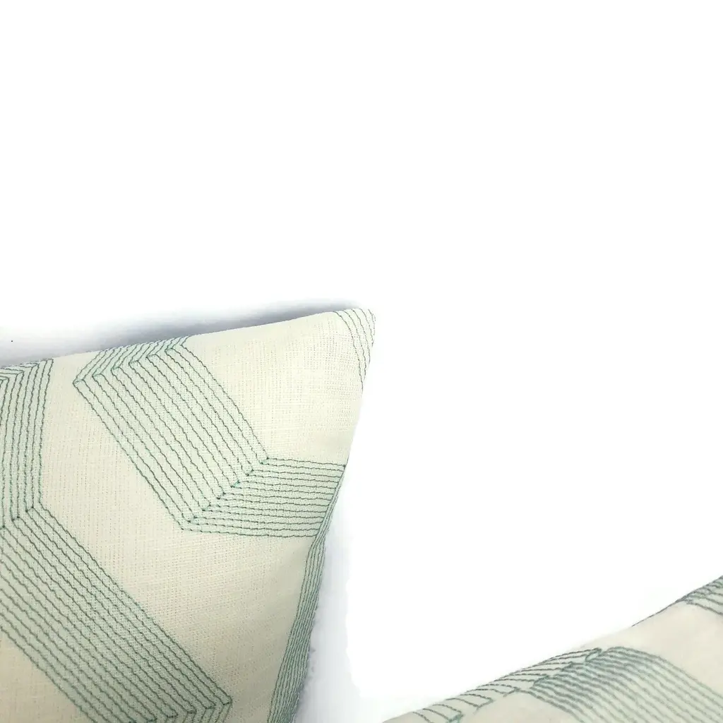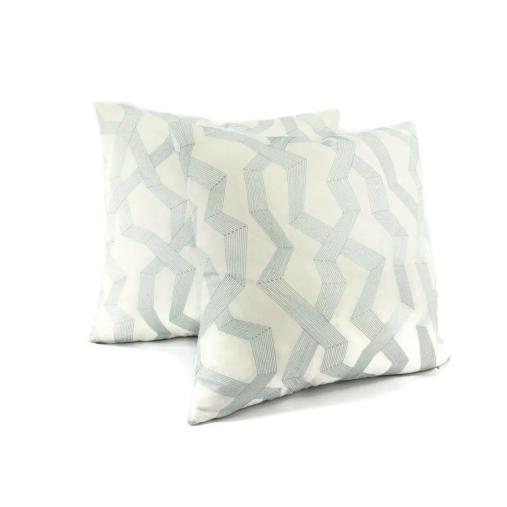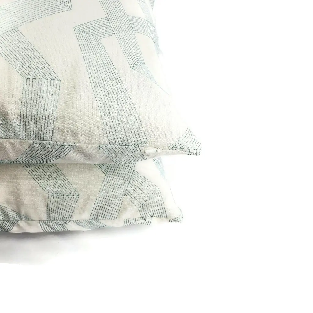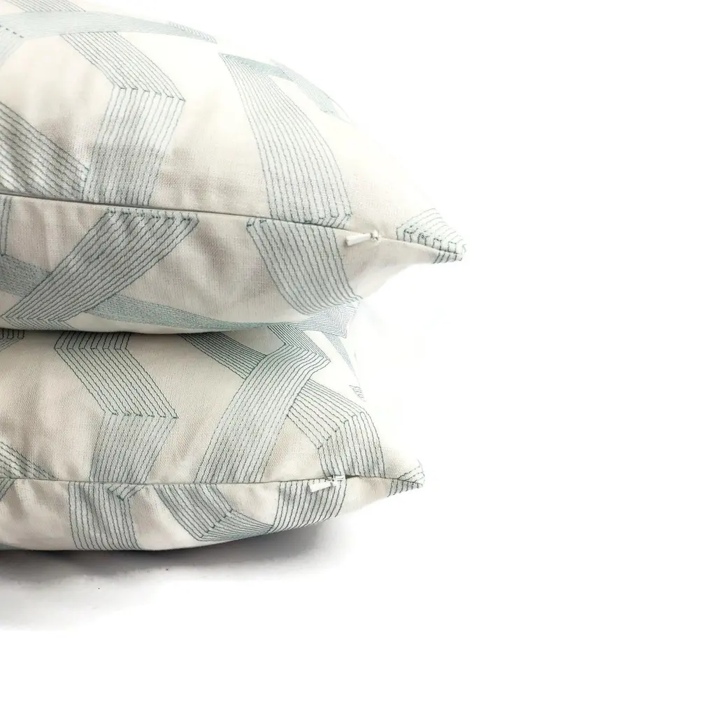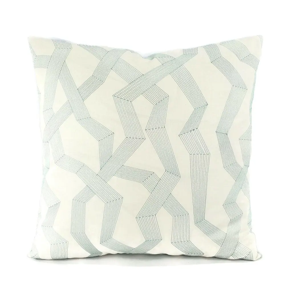 From designer, Jeffrey Alan Mark from his Waterside collection for Kravet is Soto in the color Bayside pillow cover. This pillow features aqua blue embroidered threads on a white linen/cotton blend base. A beautiful pillow that will compliment your designs. This pillow is made with an invisible zipper and surged edges. Front:/Back Soto in Bayside Size: 20" x 20" Cleaning method: Dry Clean only Note: This listing is for ONE pillow cover only. Pillow insert NOT included. Recommended pillow insert size is 22" x 22" for this cover.