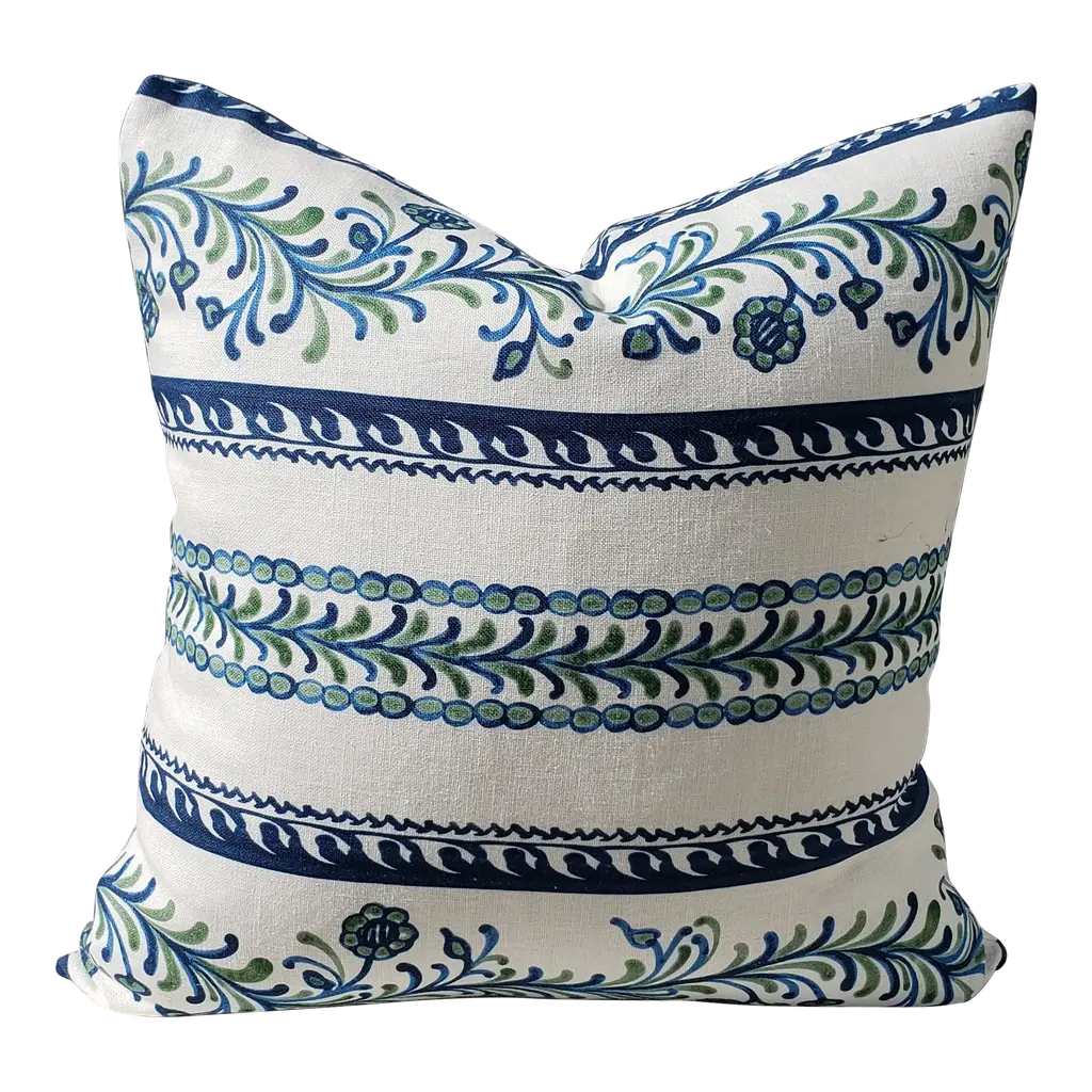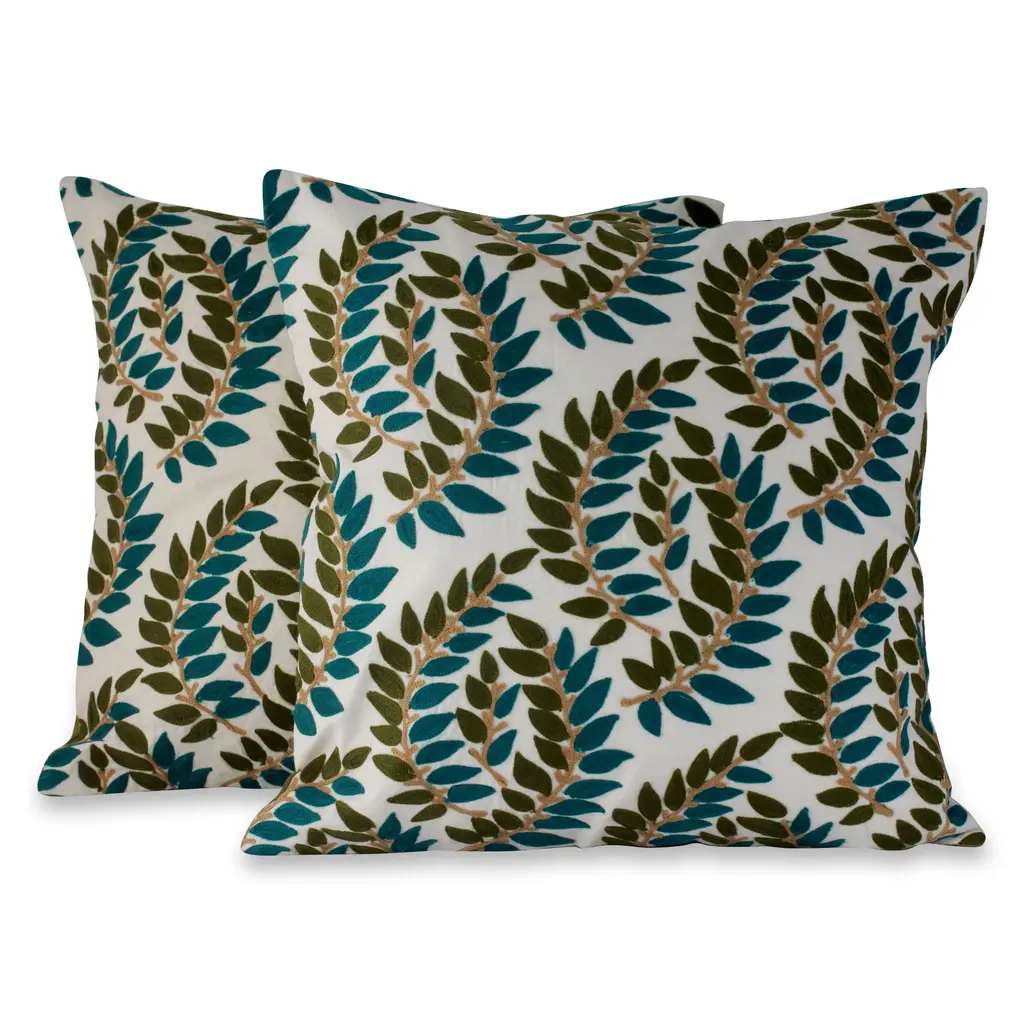 Fern-like fronds in teal and olive are scattered across this beautiful pair of square pillow covers from Seema of India. The leafy motifs are embroidered on the off-white cotton front panel; the back side of the covers is crafted from light olive green polyester. The cushion covers feature a zipper closure; cushions are not included.
