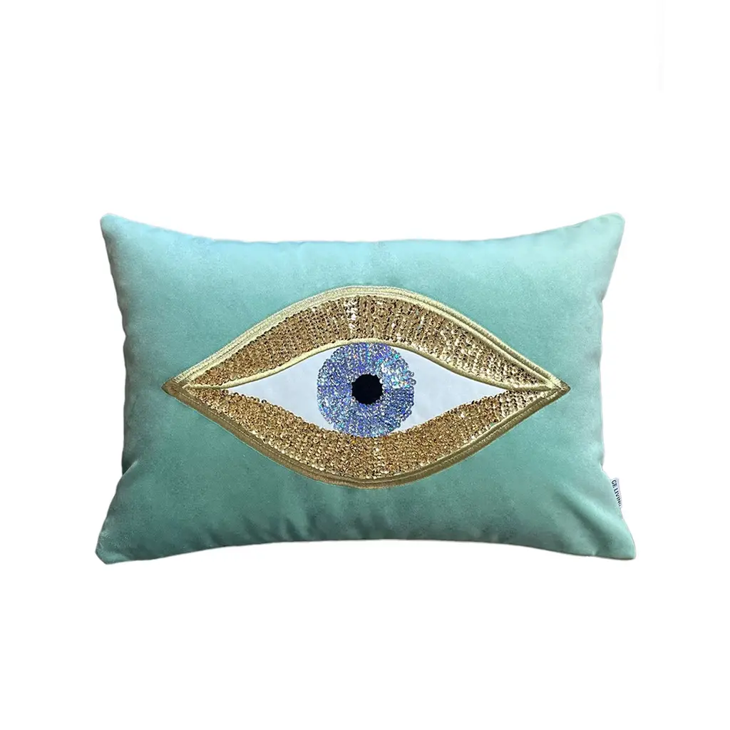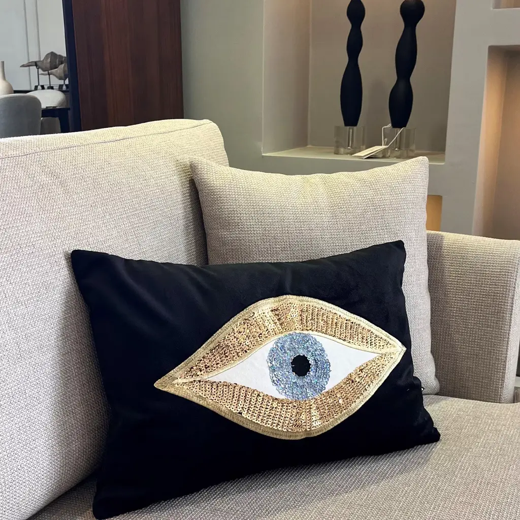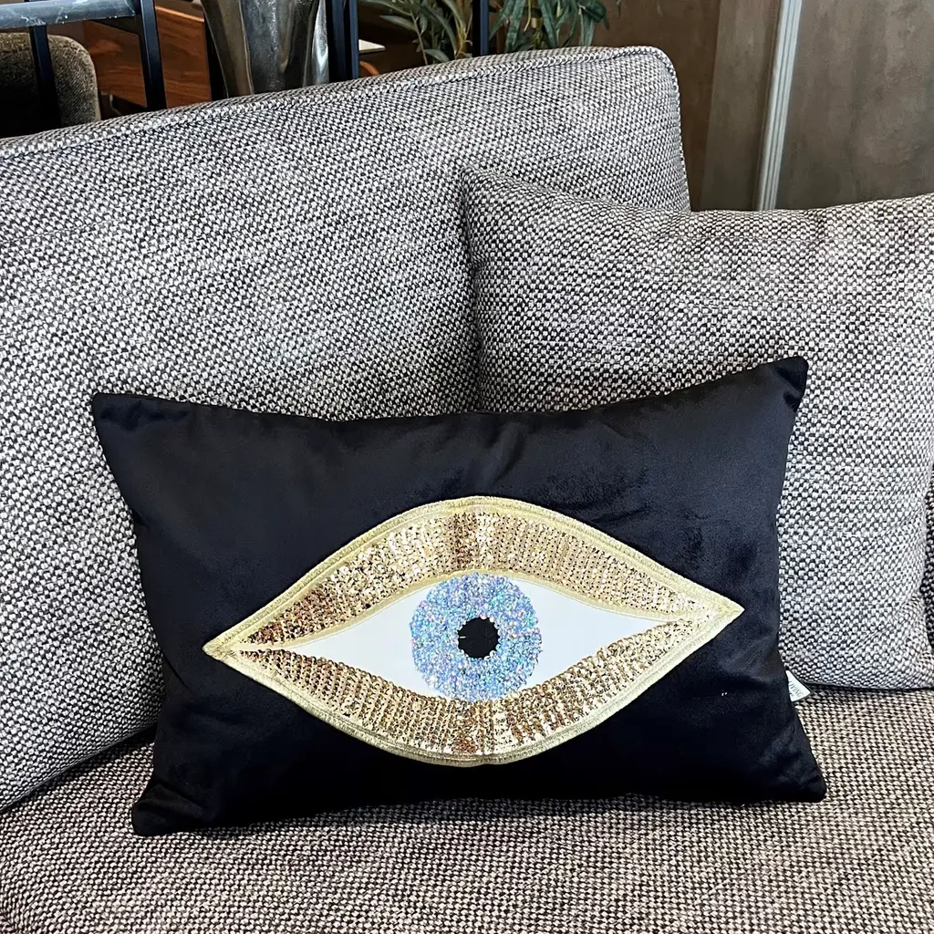 Add a touch of mystique and modern elegance to your home with this Black Velvet Evil Eye Pillow Cover. The hand-sewn sequin eye motif is more than decoration—it’s a timeless amulet, believed to protect against negativity and beady eyes while bringing peace and good energy. Crafted from soft black velvet, it makes a bold statement on sofas, beds, or accent chairs. Size: 18'' x 18'' (45x45 cm). Pillow cover only (insert not included). Gift-box ready, perfect for stylish and meaningful gifting. For a plush, full look, use an insert 1–2'' larger.