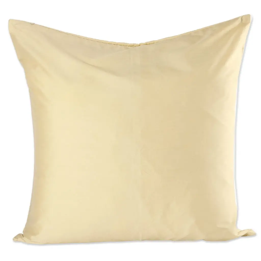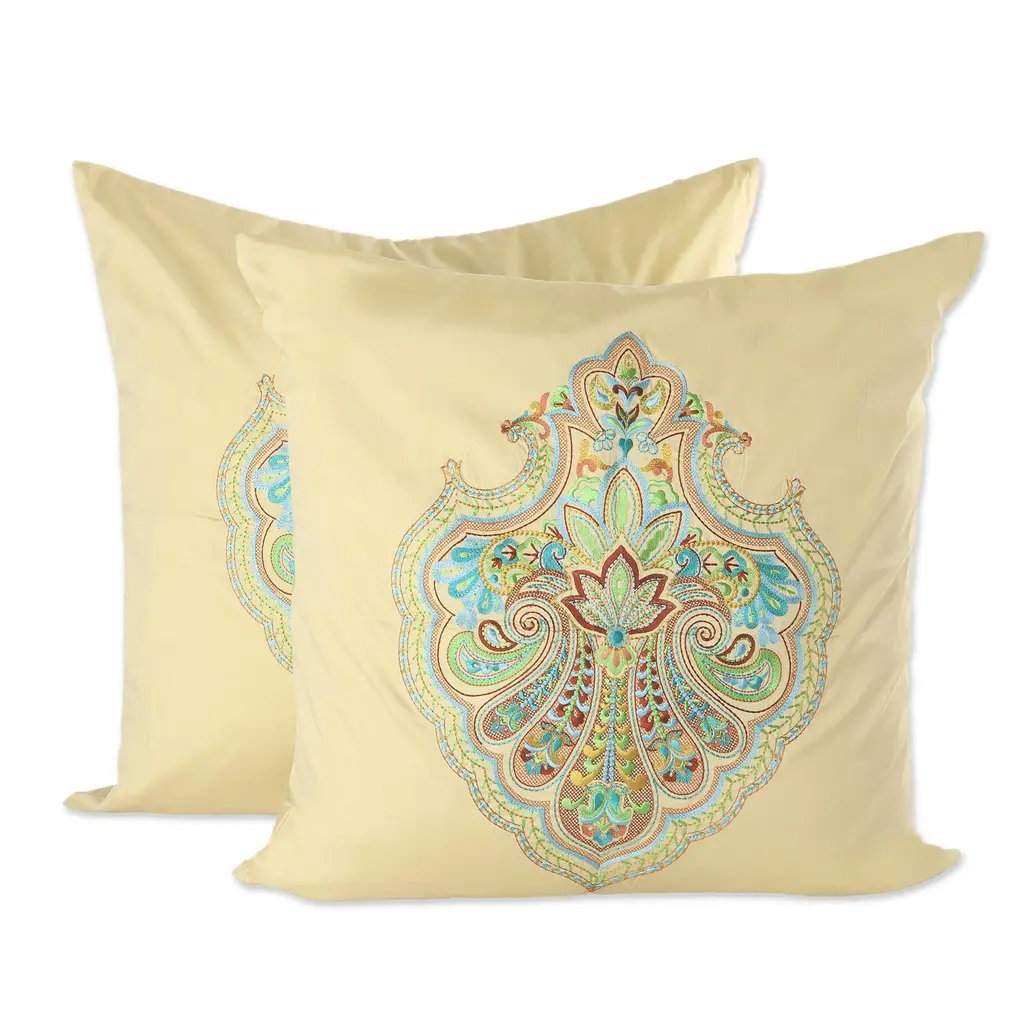 Featuring regal floral rayon embroidery in green and various colors, these cushion covers are presented by India's Asha Prabha. Local artisans craft this pair from almond-hued polyester. Each elegant cover features a concealed zipper on one side for inserting a cushion.