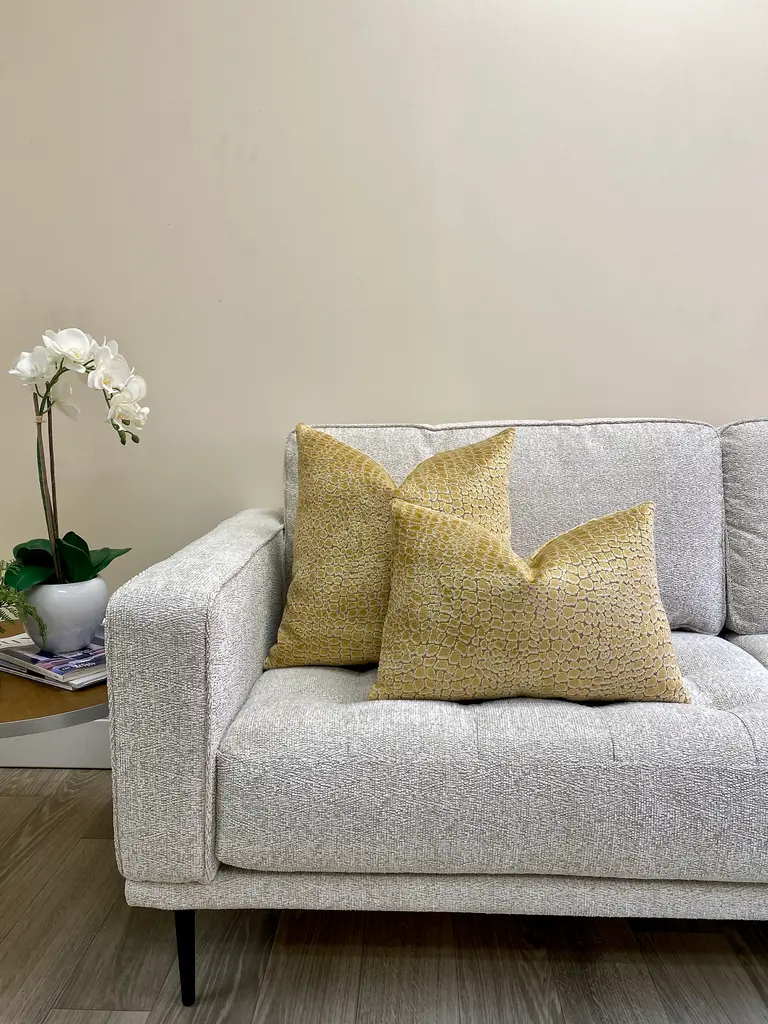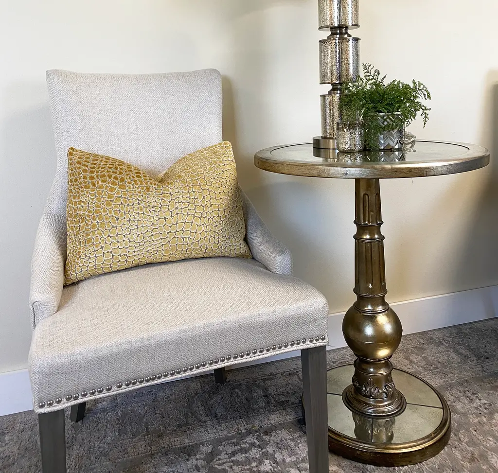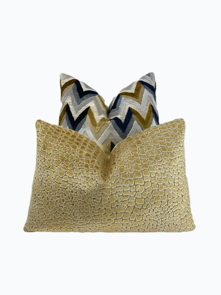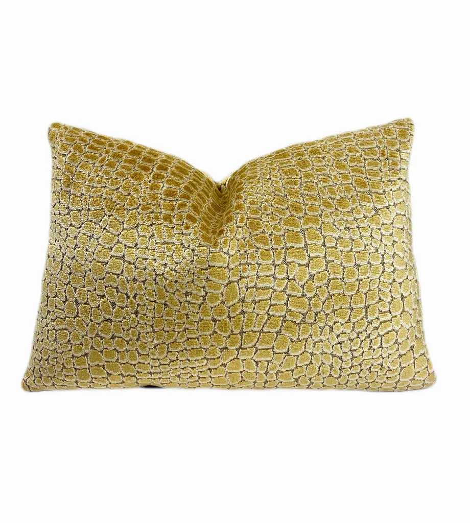 Add this luxurious pillow of gold and cream on a natural background velvet to your decor for a pop of color. This exceptionally beautiful pillow is made of durable high end designer fabric. The fabric pattern is a collection of golden velvet pebbles on a light natural background. This pillow will pop in your space. This pillow is rich and elegant. It will add just the right touch of color to illuminate your space. This handcrafted designer pillow cover has it all. It is perfect for adding texture, depth and energy to a room. It’s ideal for as a couch pillow, chair pillow, bed shams and decorative pillow. Each 14x20 inch cover is stuffed with a high quality 15x21 95x5 feather down pillow insert for a plush look. Handcrafted in the USA