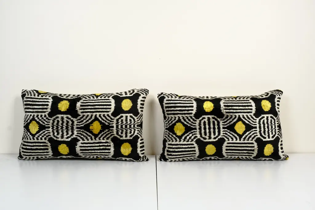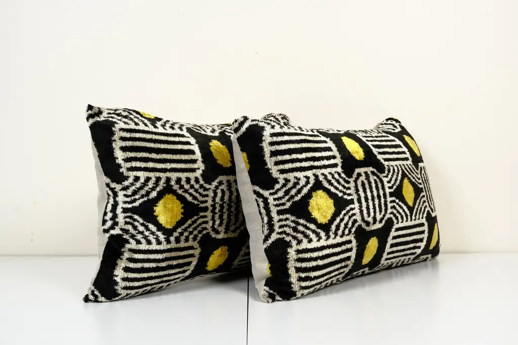 Gold Silk Ikat Velvet Pillow Cover - a Pair -Luxurious cushion cover of handloomed ikat fabric -Insert is NOT included -Color: Gold and Black -Ikat is an beautiful fabric, every pillow is unique but can also contain small imperfections; the charm of a handmade product. Dimensions: 16" x 24" / 40 x 60 Cm -Handloom 100% silk velvet fabric -Back side is cotton fabric and with hidden zipper. -Handwoven velvet pillow case only, -Hand wash 30 C or dry clean