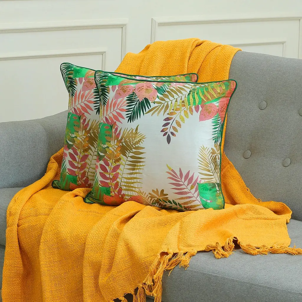 Golden Zari Embroidered Cushion Cover Pair With Leafy Print- Leafy Whispers