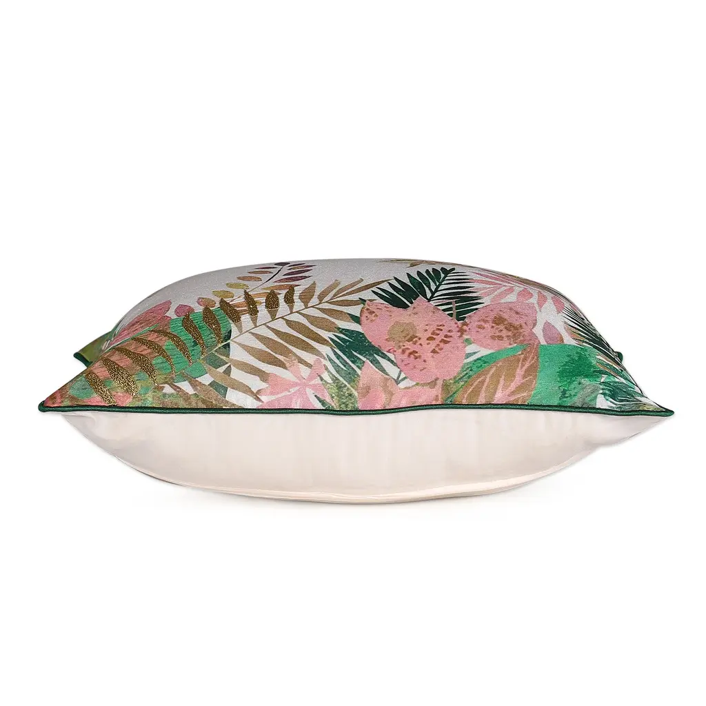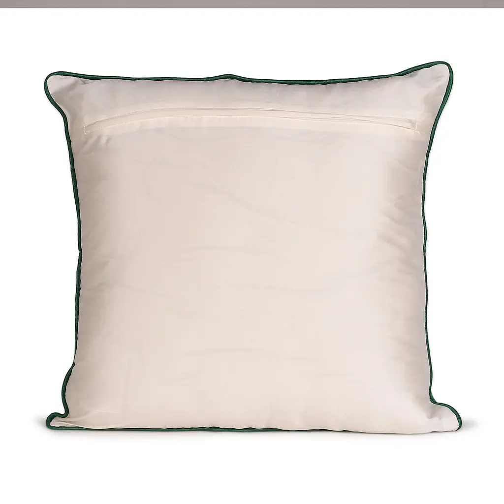 The Indian forest lets a tender whisper of beauty decorate this pair of cushion covers—crafted by Seema's talented artisan team. A leafy print and green piping decorate the design's ivory base hue, whereas golden zari embroidery adds a radiant touch. To allow for practical use, a zipper completes the back.