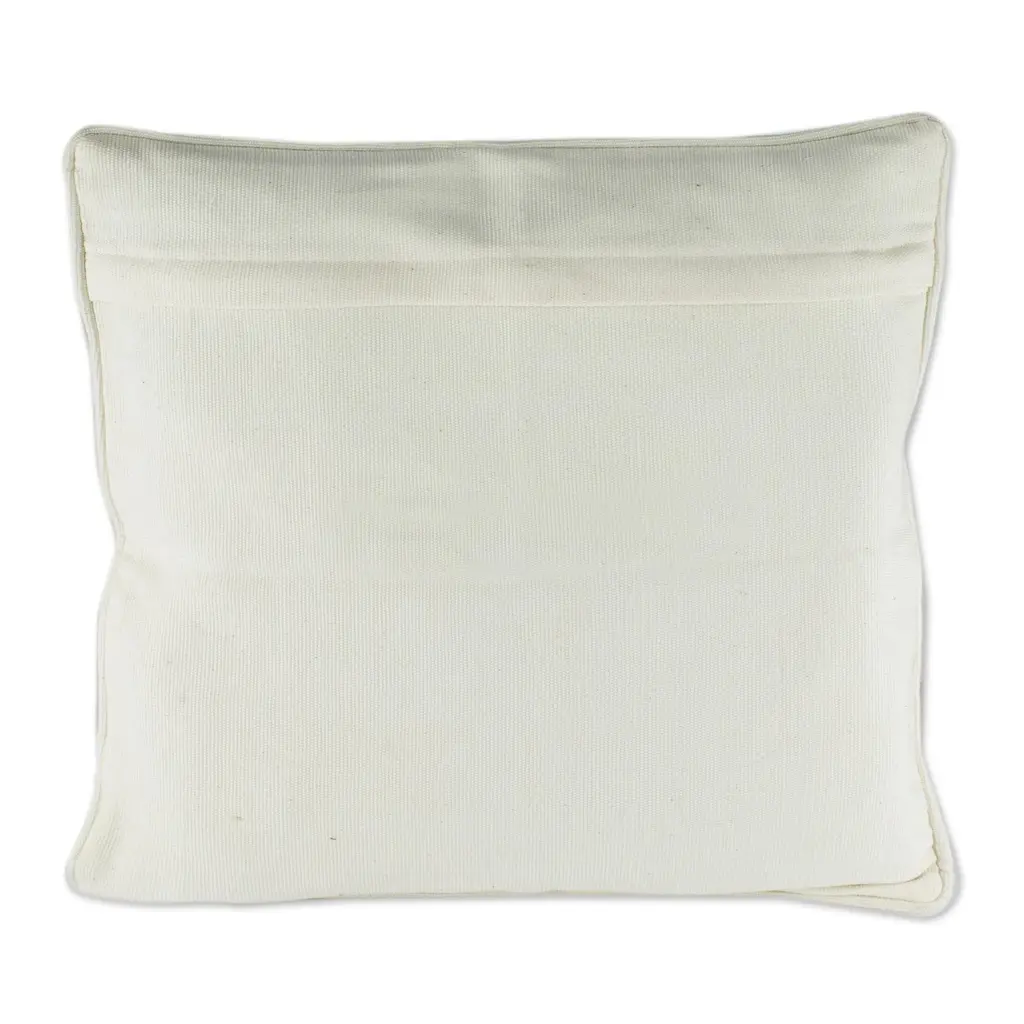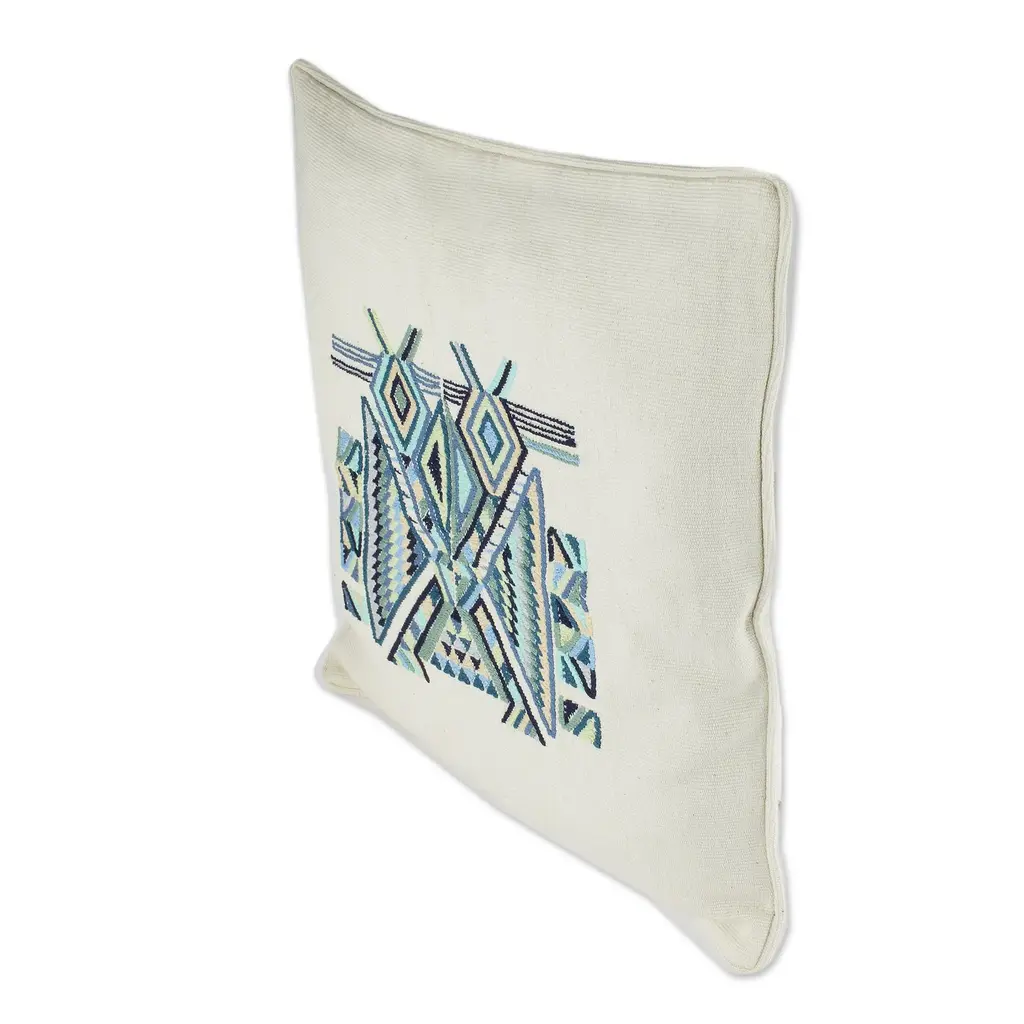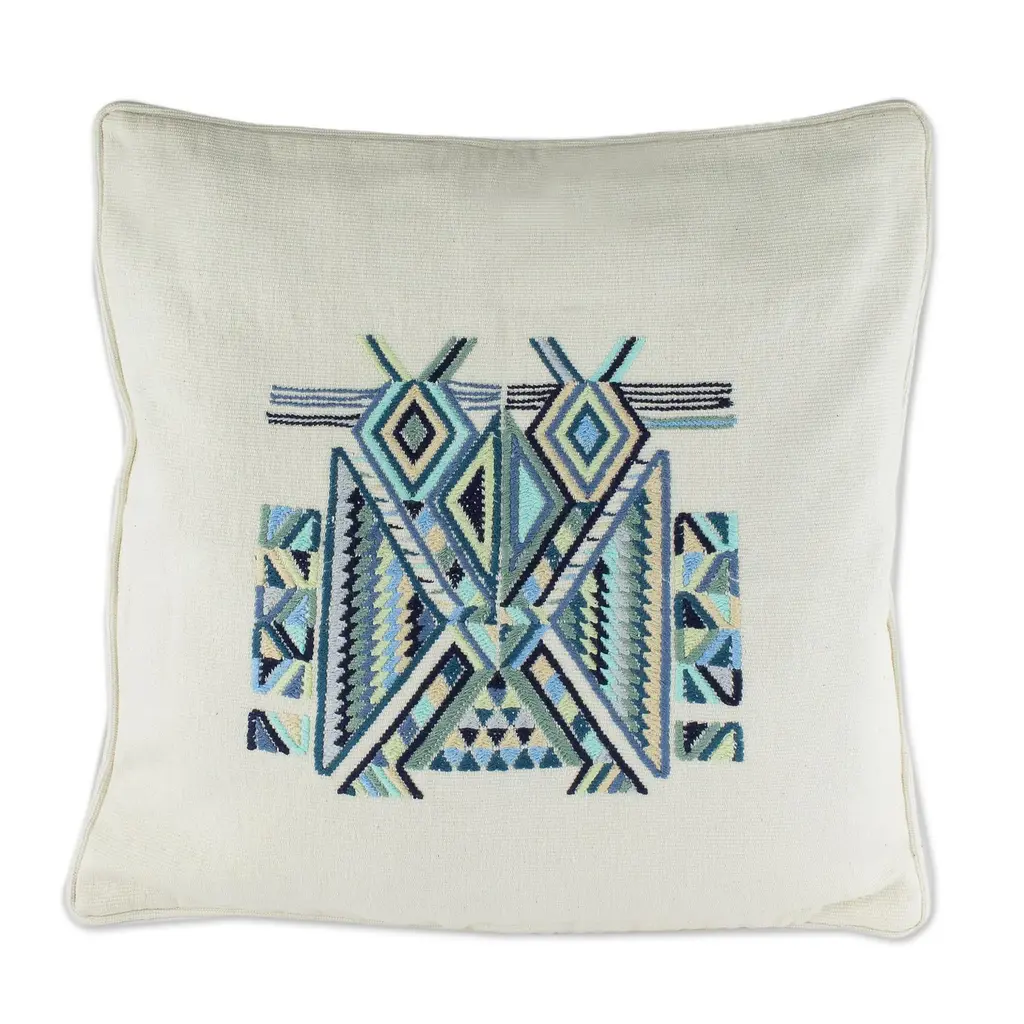 Geometric shapes come together to form a tz'ikin or bird in this gorgeous cushion cover from Women United for Artisan Development. The bird represents good fortune in Maya cosmology. Artisans weave the ivory cushion cover on a traditional loom with accents of blue, green and yellow. The plain back features a zipper opening for inserting a cushion.