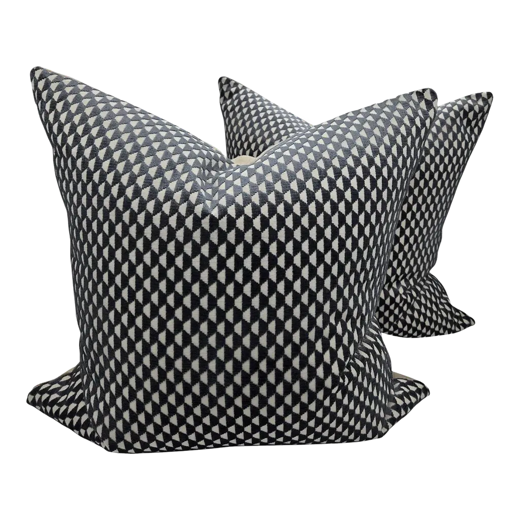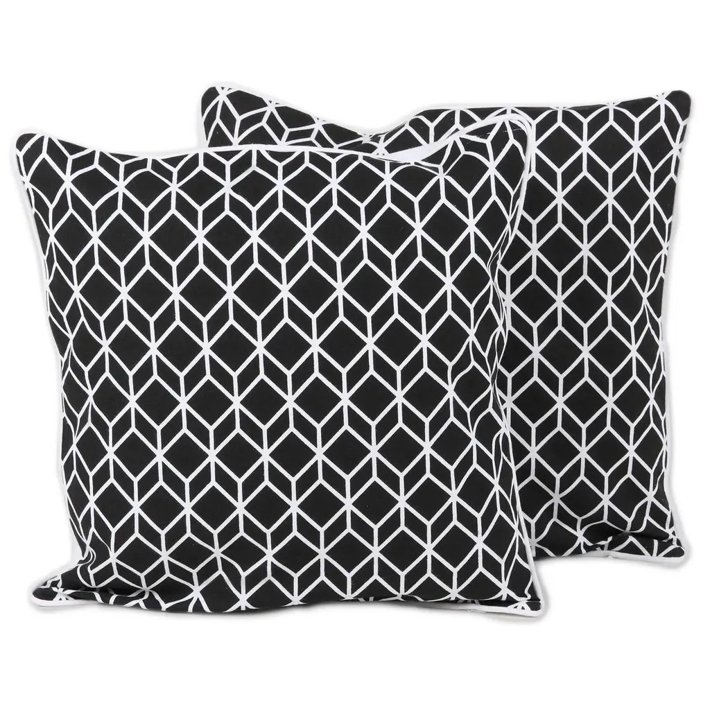 India's Navya Khanna designs this bold pair of screen-printed cotton cushion covers. She selects a geometric-pattern of white cubes over a black background. The reverse side is solid antique-white and the pair features a zipper closure at the bottom for inserting cushions with ease.