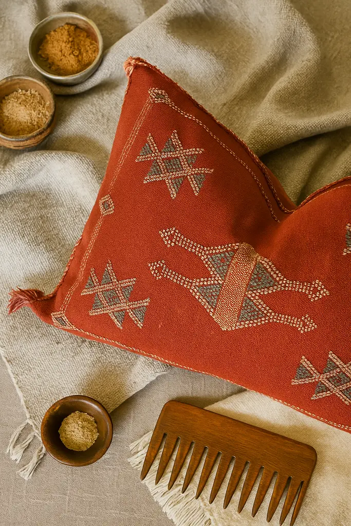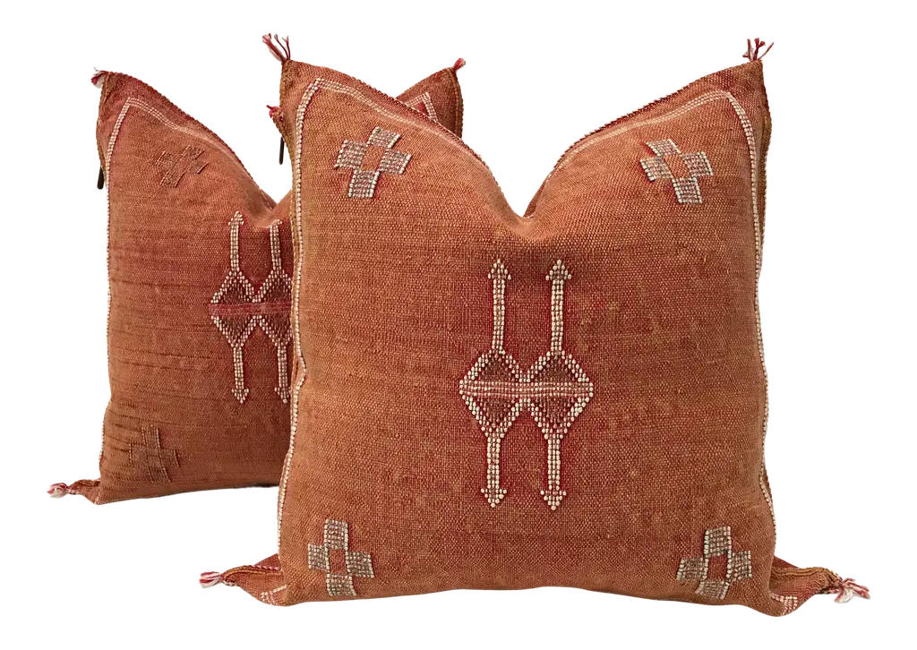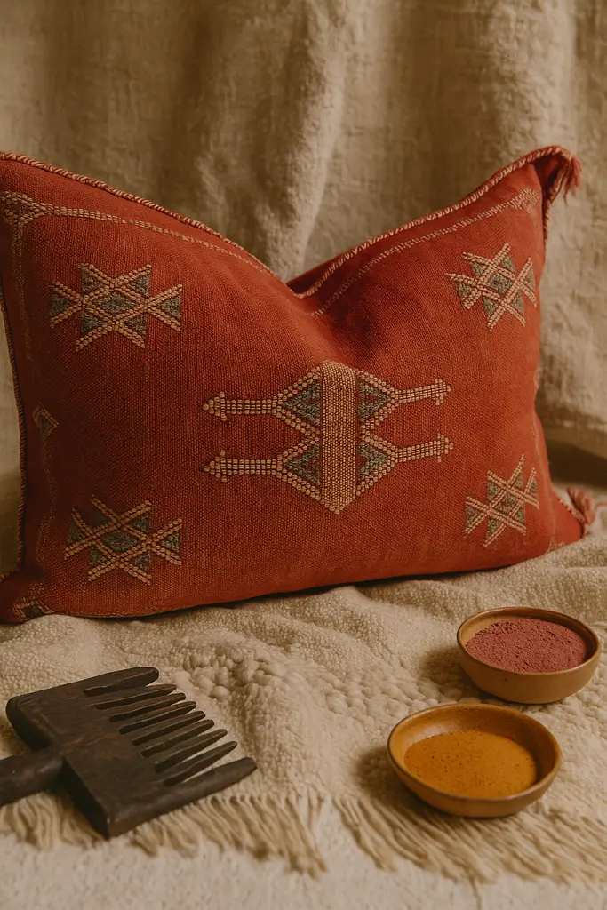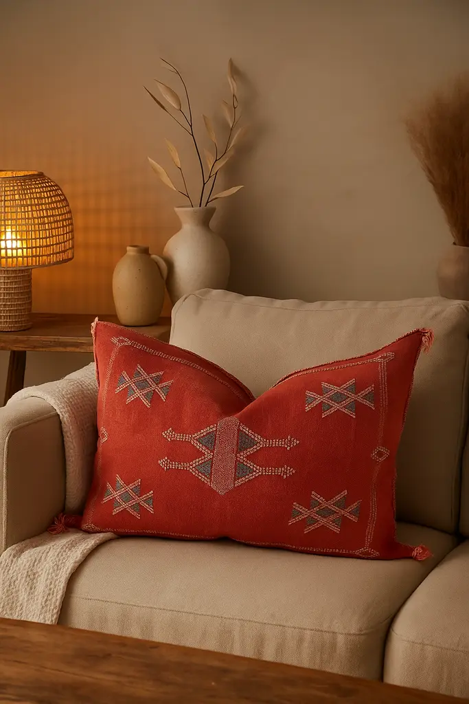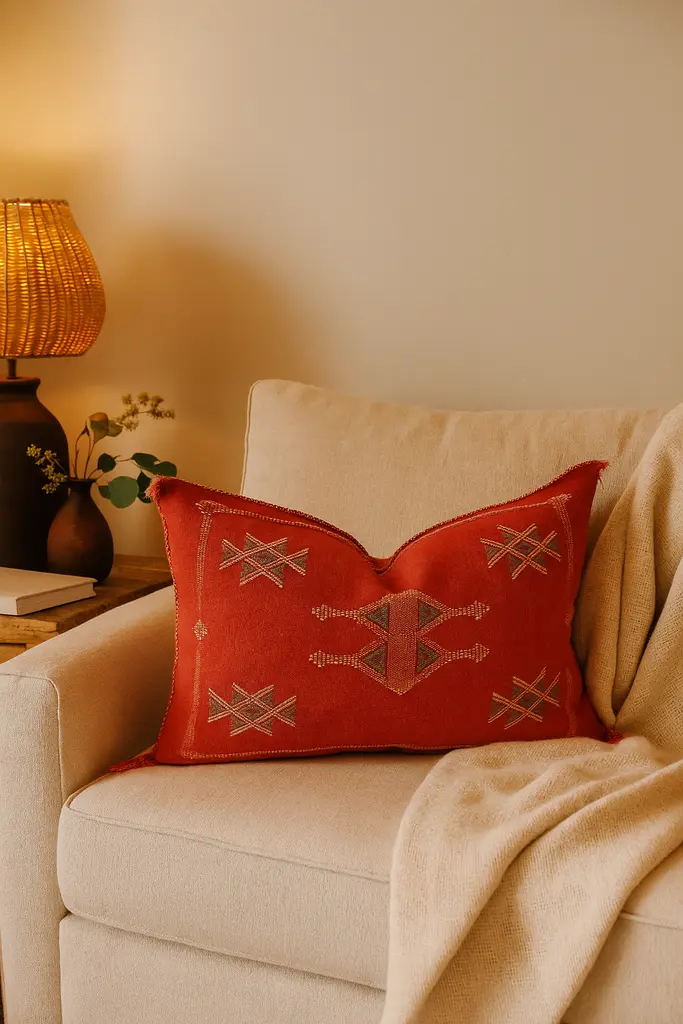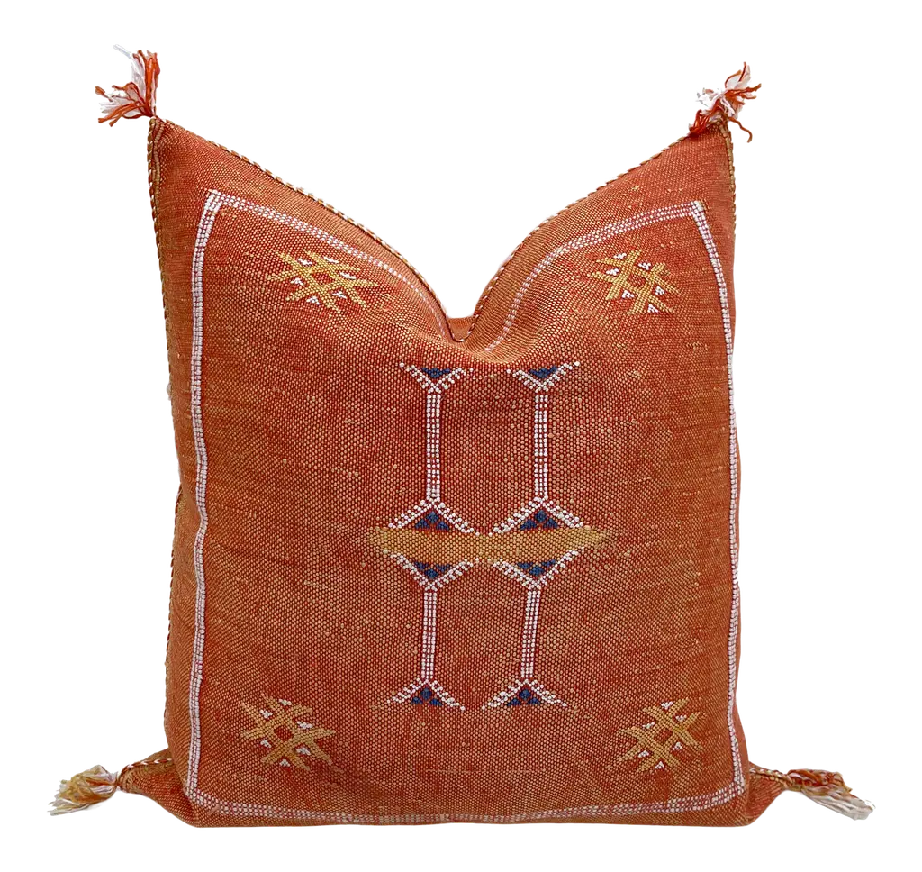 This handmade Moroccan lumbar pillow cover is crafted from cactus silk and features traditional Berber motifs, bringing artisanal charm and bold color to any space. • Origin: Morocco • Year Made: 2025 • Materials: 100% cactus silk (Sabra) • Color: Vibrant red with hand-embroidered golden Berber symbols • Features: – Handwoven on traditional wooden looms in the Atlas Mountains – Detailed Berber embroidery representing protection and prosperity – Rectangular lumbar shape, ideal for layering on beds or sofas – Zipper closure on the bottom for easy insert removal – Pillow insert not included (cover only) • Style: Bohemian, Ethnic, Global, Artisan • Condition: New – no imperfections. Natural variations in texture and embroidery are inherent to handmade cactus silk • Dimensions (in): W 23″ × H 15″ • Storage & Handling: Stored in a clean, smoke-free, pet-free environment Each piece is carefully hand-dyed using natural plant-based dyes, then sun-bleached for a faded finish unique to Moroccan craftsmanship. Because of its artisanal nature, every pillow cover is slightly different, making yours one-of-a-kind. Add warmth, texture, and heritage to your home with this authentic handmade accent.