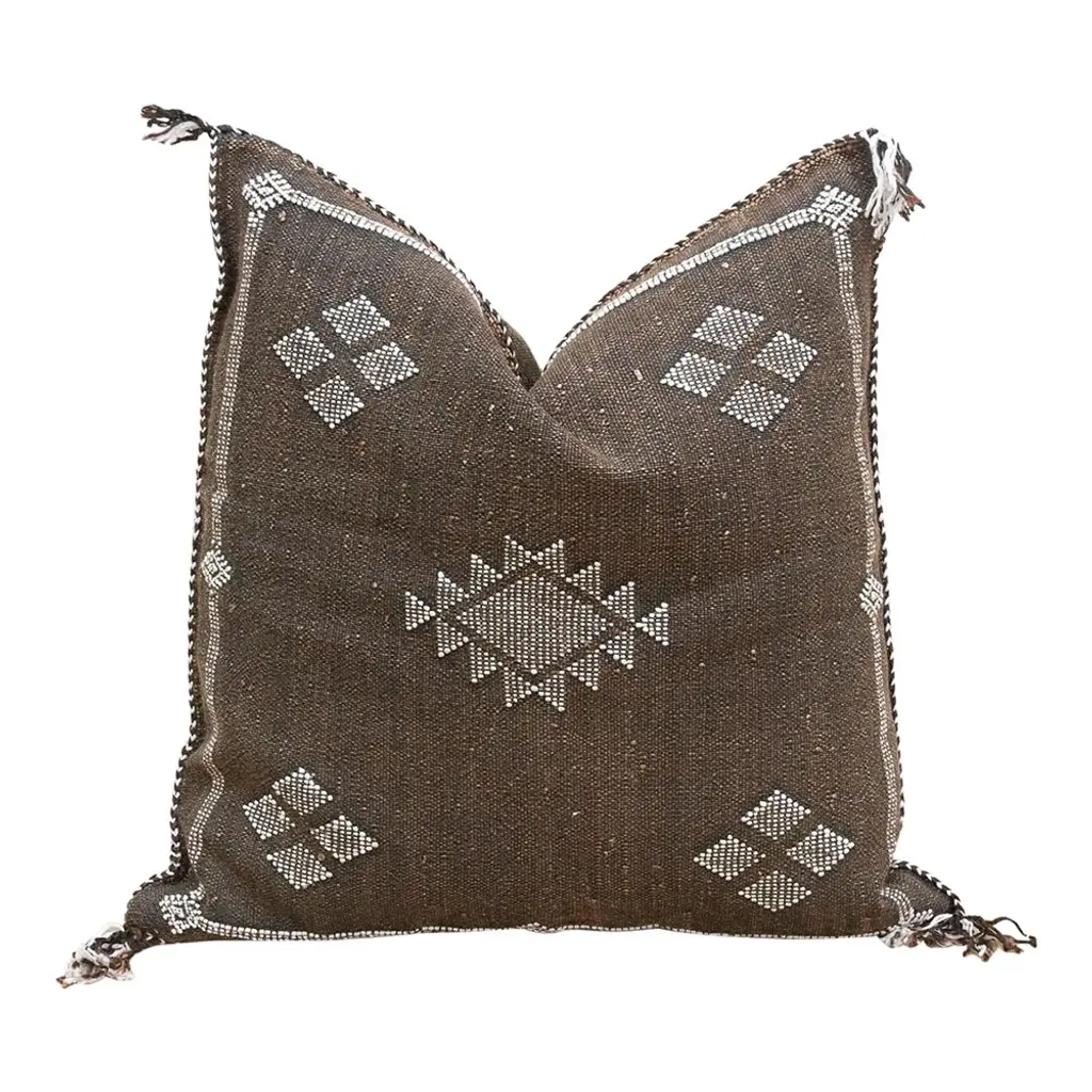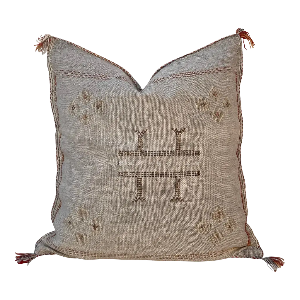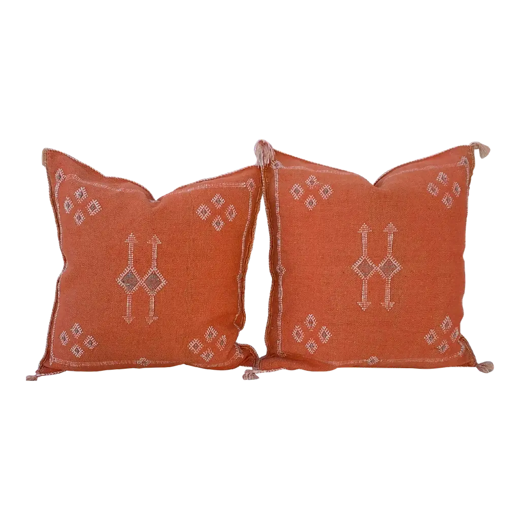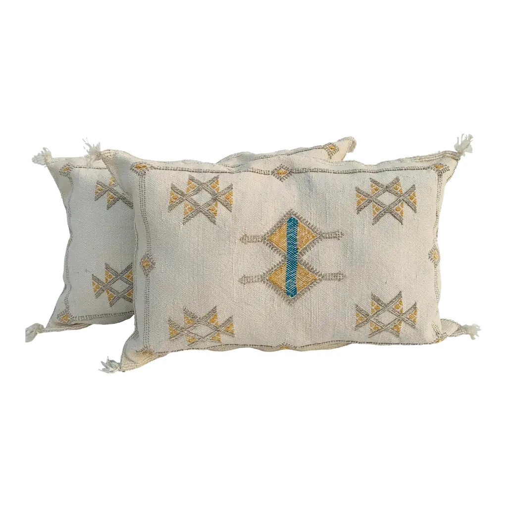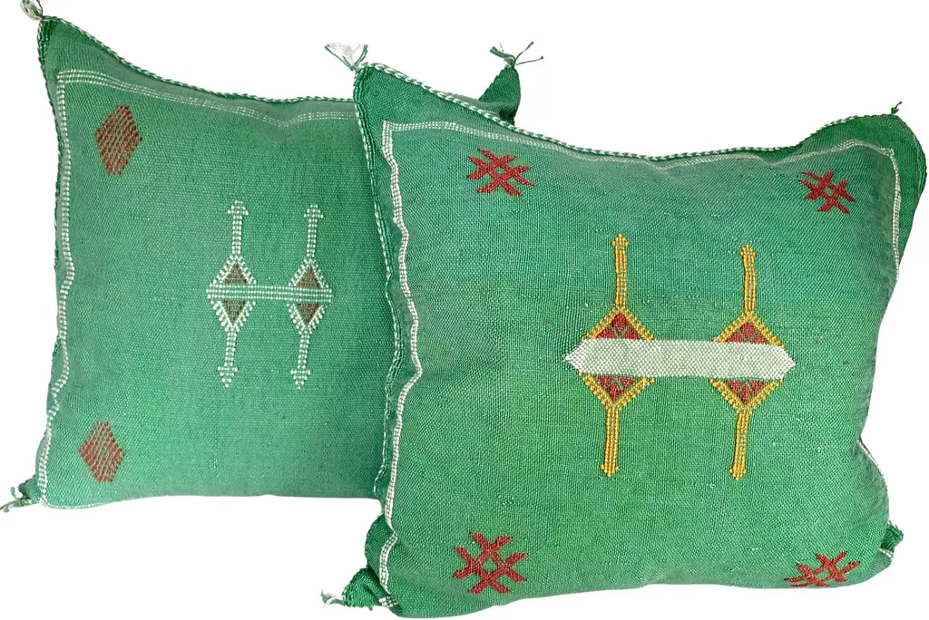 This handmade Moroccan lumbar pillow cover is crafted from cactus silk and features traditional Berber motifs, bringing artisanal charm and bold color to any space. • Origin: Morocco • Year Made: 2025 • Materials: 100% cactus silk (Sabra) • Color: Vibrant red with hand-embroidered golden Berber symbols • Features: – Handwoven on traditional wooden looms in the Atlas Mountains – Detailed Berber embroidery representing protection and prosperity – Rectangular lumbar shape, ideal for layering on beds or sofas – Zipper closure on the bottom for easy insert removal – Pillow insert not included (cover only) • Style: Bohemian, Ethnic, Global, Artisan • Condition: New – no imperfections. Natural variations in texture and embroidery are inherent to handmade cactus silk • Dimensions (in): W 23″ × H 15″ • Storage & Handling: Stored in a clean, smoke-free, pet-free environment Each piece is carefully hand-dyed using natural plant-based dyes, then sun-bleached for a faded finish unique to Moroccan craftsmanship. Because of its artisanal nature, every pillow cover is slightly different, making yours one-of-a-kind. Add warmth, texture, and heritage to your home with this authentic handmade accent.