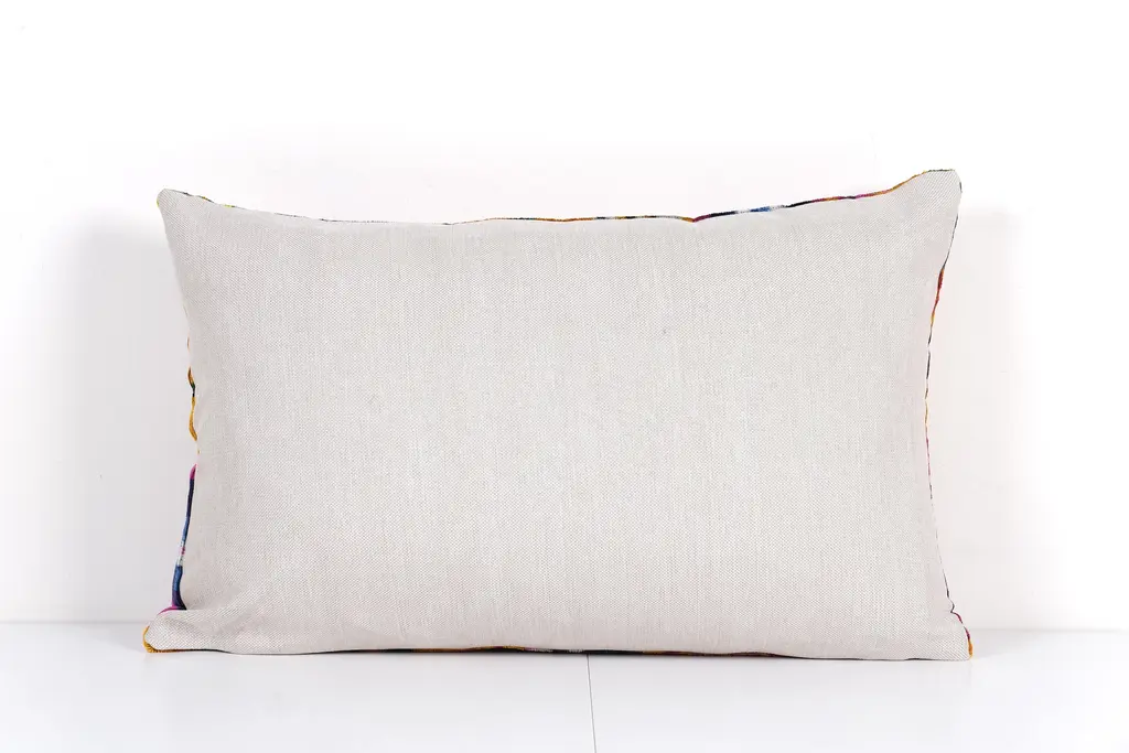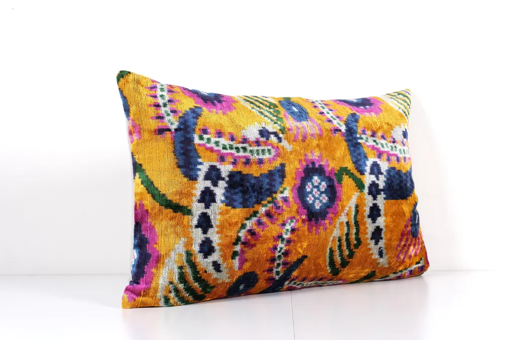 Ikat Velvet and Silk Pillow Cover - Orange and Blue Lumbar Cushion Cover 16'' X 24'' -Luxurious cushion cover of handloomed ikat fabric -Insert is NOT included -Color: Orange and Blue -Ikat is an beautiful fabric, every pillow is unique but can also contain small imperfections; the charm of a handmade product. Dimensions: 16ʺW(40 Cm) × 6.0ʺD(15 Cm) × 24ʺH( 60 Cm) approx Warning: Since ikat is a handmade fabric, the width and length of the throw pillow can be a few inches smaller or larger. -Handloom 80% silk velvet 20% cotton -Back side is cotton fabric and with hidden zipper. -Handwoven velvet pillow case only, -Hand wash 30 C or dry clean -Colors may be slightly different in reality from those shown on the photos, due to the nature of photographing and device monitor settings.