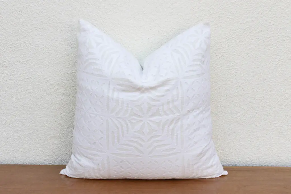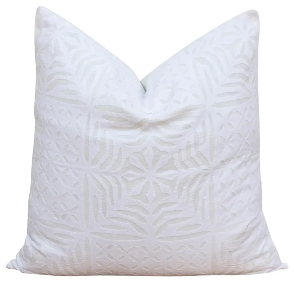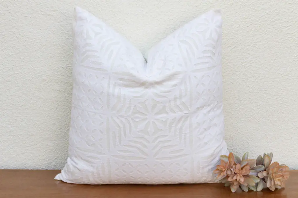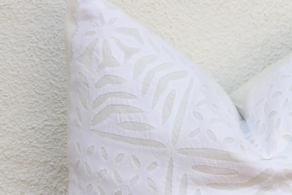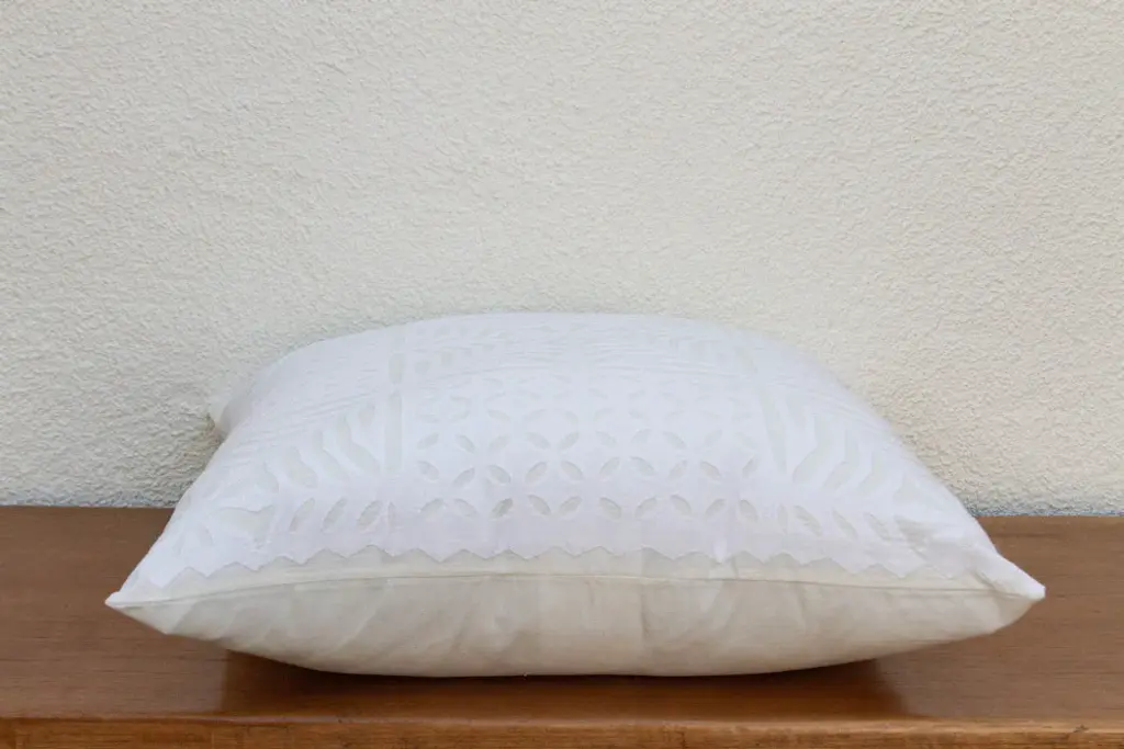 This decorative pillow cover features beautiful array of patterns, with hand crafted appliqué cut work, giving it a timeless appeal. Initially, this ancient Indian technique called appliqué was used to repair and adorn worn-out clothes, making them functional and aesthetically pleasing. This large artisanal pillow cover is made from breathable cotton. This pillow has a cotton backing with a hidden zipper. Insert sold separately.
