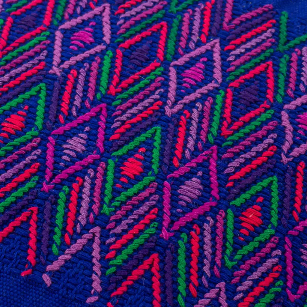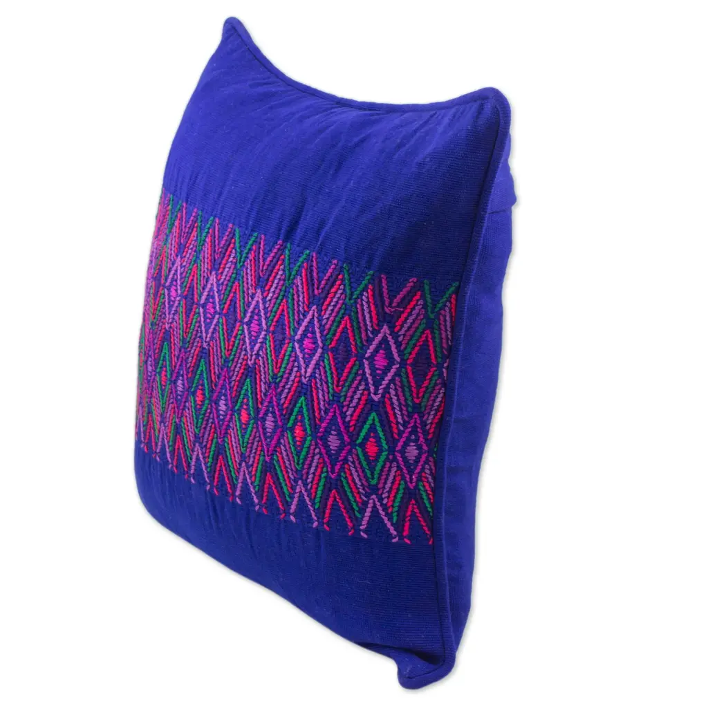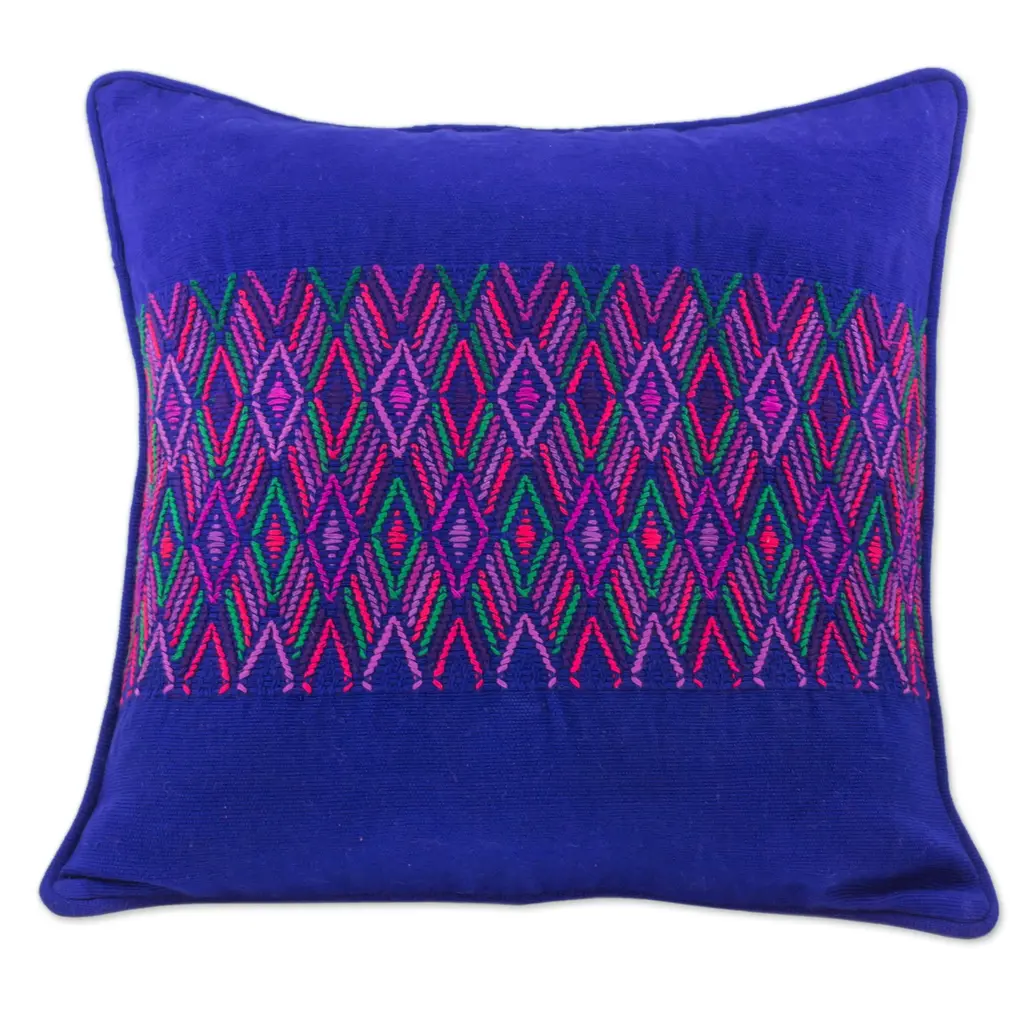 "Many of us at Women United for Artisan Development live in Qetzaltenango and we're known for our preference for bright colors, which we proudly share with you through this cushion cover," the Guatemalan artisans explain. They weave the cotton cushion cover in a rich indigo hue featuring a multicolor frieze of Maya inspiration. They border the square cover with cording and include a zipper closure on the back.