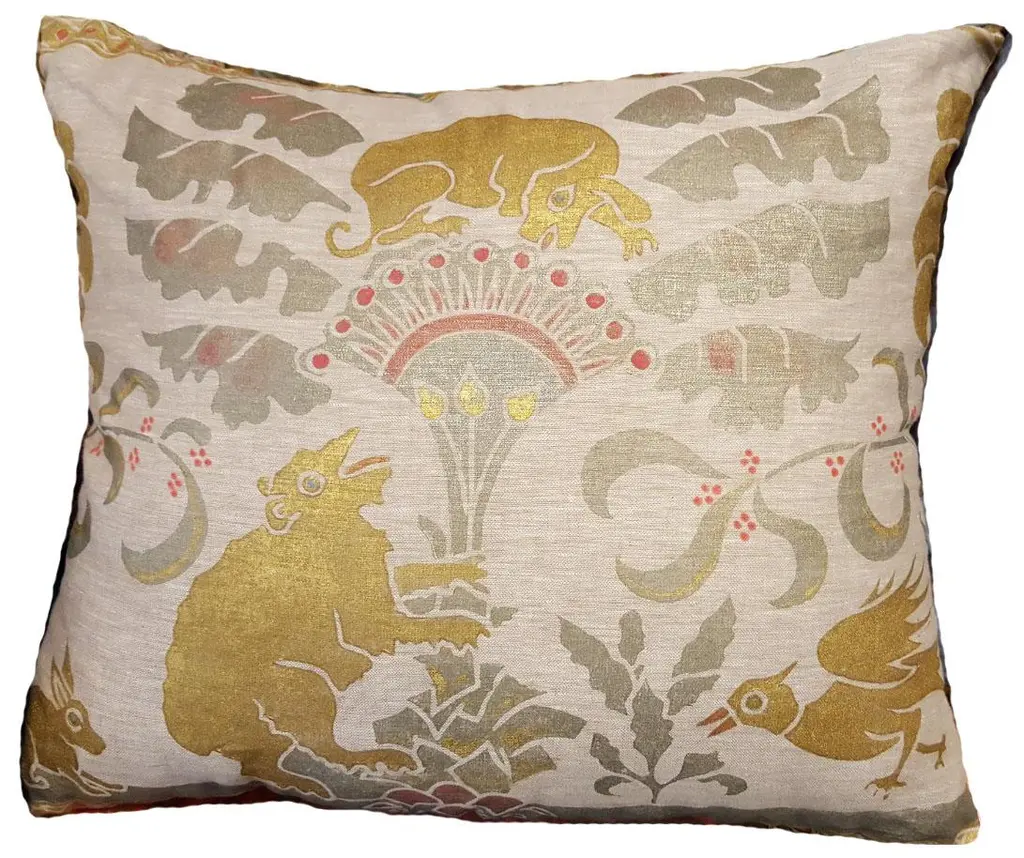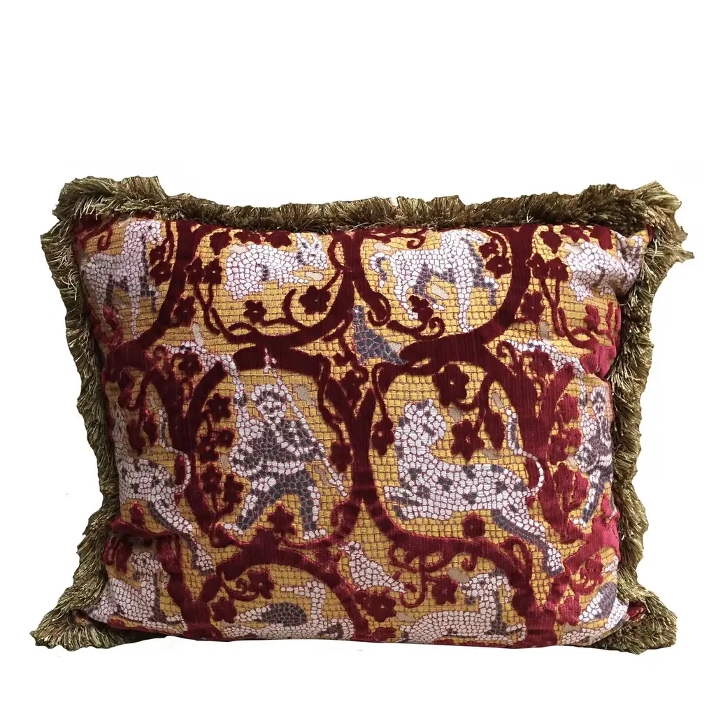 Via Venezia Textiles" extravagant pieces reflect a brilliant infusion of hand-dyed and hand-painted colors and designs that come crashing through every piece with old world and modern charm, while cultivating chic connoisseurship based on ancient motifs and architectural designs from around the world. Via Venezia Textiles features hand-dyed silk velvets and linens that have been created using illustrated wooden blocks, which in turn have been carved and painted entirely by hand to adorn pillows and other decorative linens. The final result is a one-of-a-kind masterpiece of Venetian artistry that is fit for a palace, creating a style like none other for each of its collectors. The studio will come as close as possible to the requested size and color. Any variation will be due to the custom nature of the paint mixture, size of the blocks, and to avoid any compromise in the design. Pillows are made with a zippered closure and are shipped flat. We will gladly recommend insert manufacturers.
