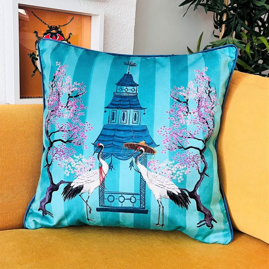 Japanese Crane Pattern Throw Pillow Cover - Turquoise Velvet Feng Shui Home Decor