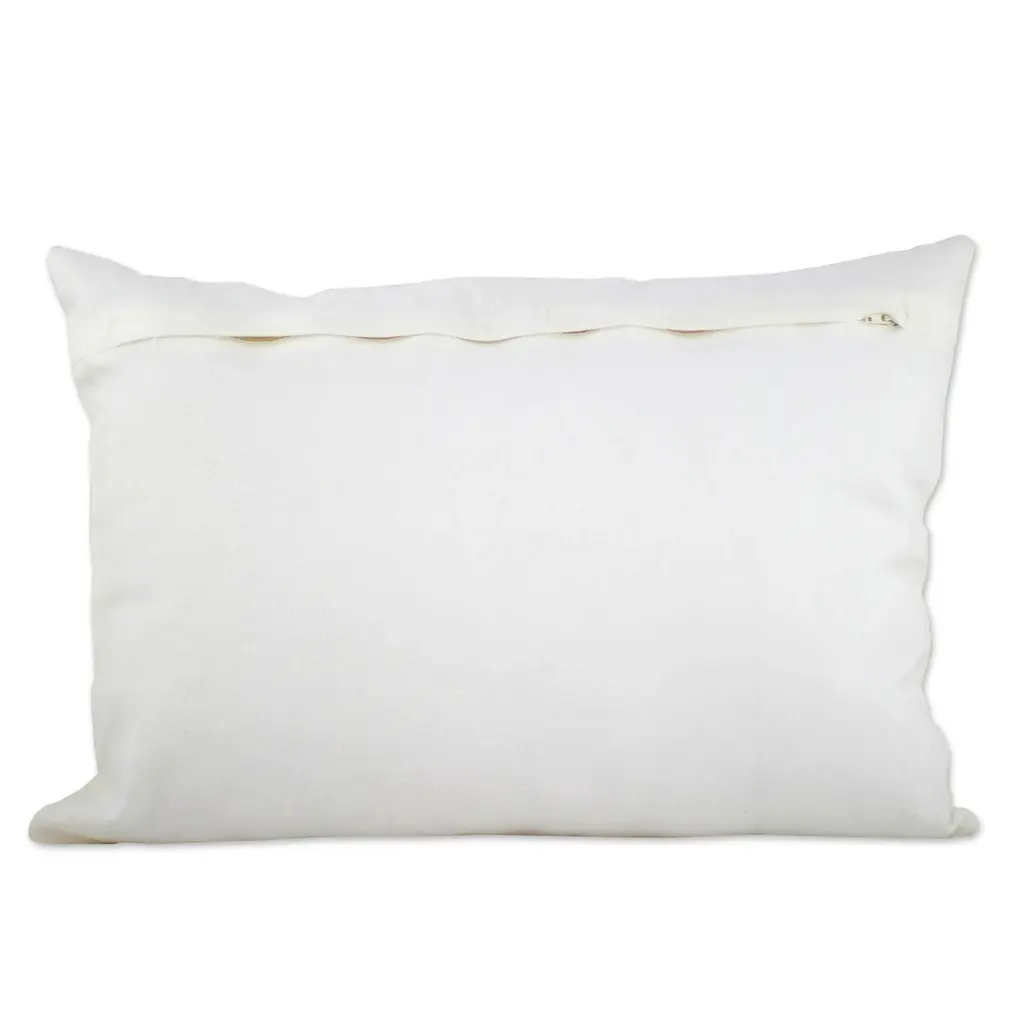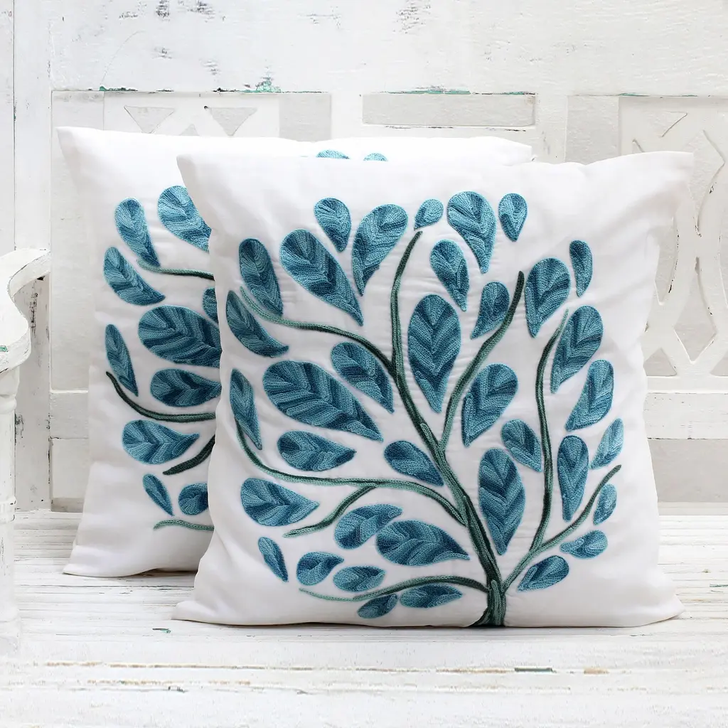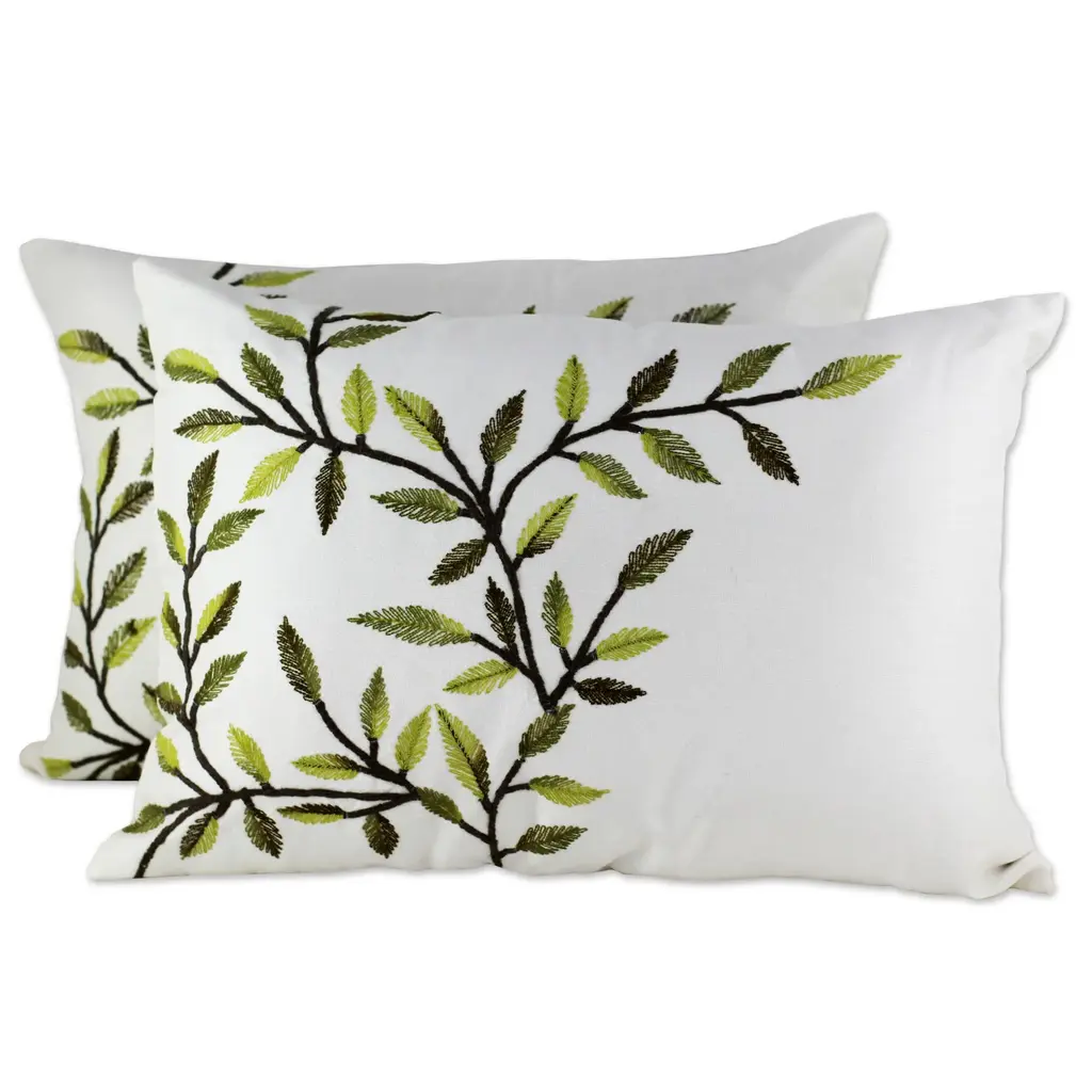 Indian artisan Seema designs these stylish, embroidered cushion covers for the home. This pair features twisting leafy vines in hues of green. Each ivory polyester cushion cover is equipped with a back zippered closure.
