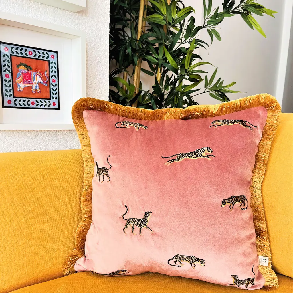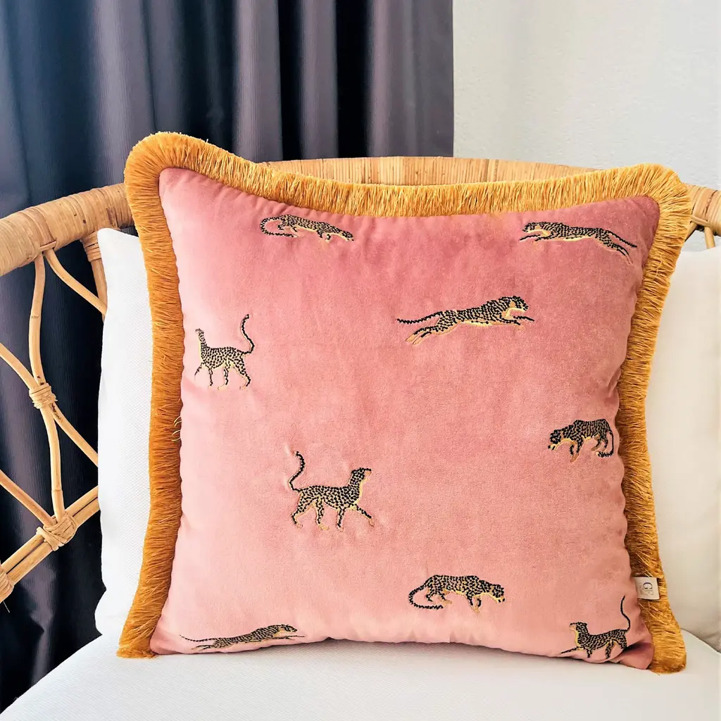 Artisan Leopard DesignThis decorative pillow features a stunning leopard pattern on luxurious pink velvet fabric, creating a bold and unique accent for any space.Transform Your SpacePerfect for boho interiors, modern living rooms, or cozy bedrooms, this Leopard Pattern Pillow Cover adds charm, vibrancy, and positive energy to your home. It’s a stylish statement piece for your sofa, chair, or bed. Premium MaterialsCrafted from soft pink velvet, this cushion cover is accented with elegant copper tassels, adding a sophisticated touch. The fabric is the same on both sides, ensuring a cohesive and polished look.