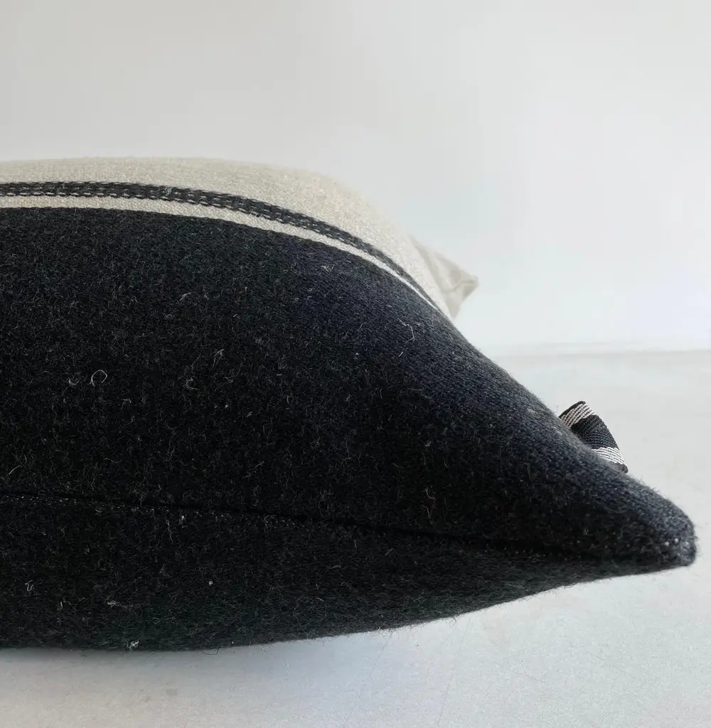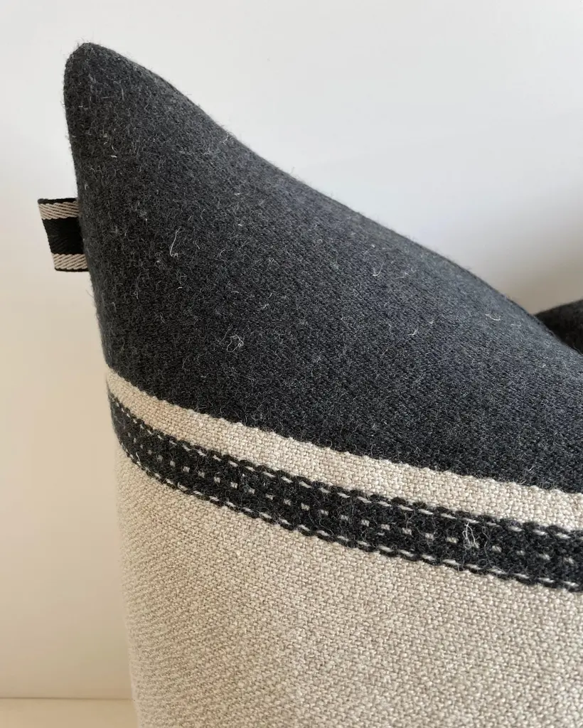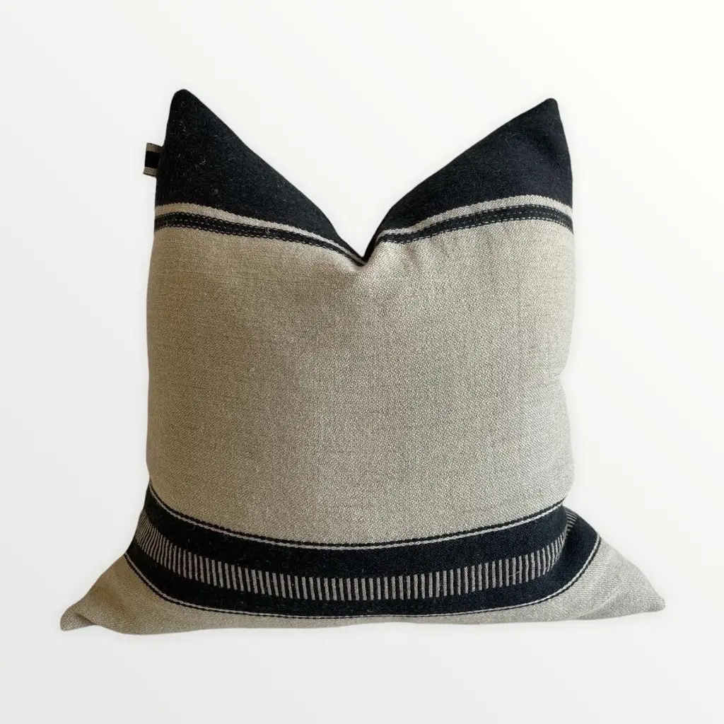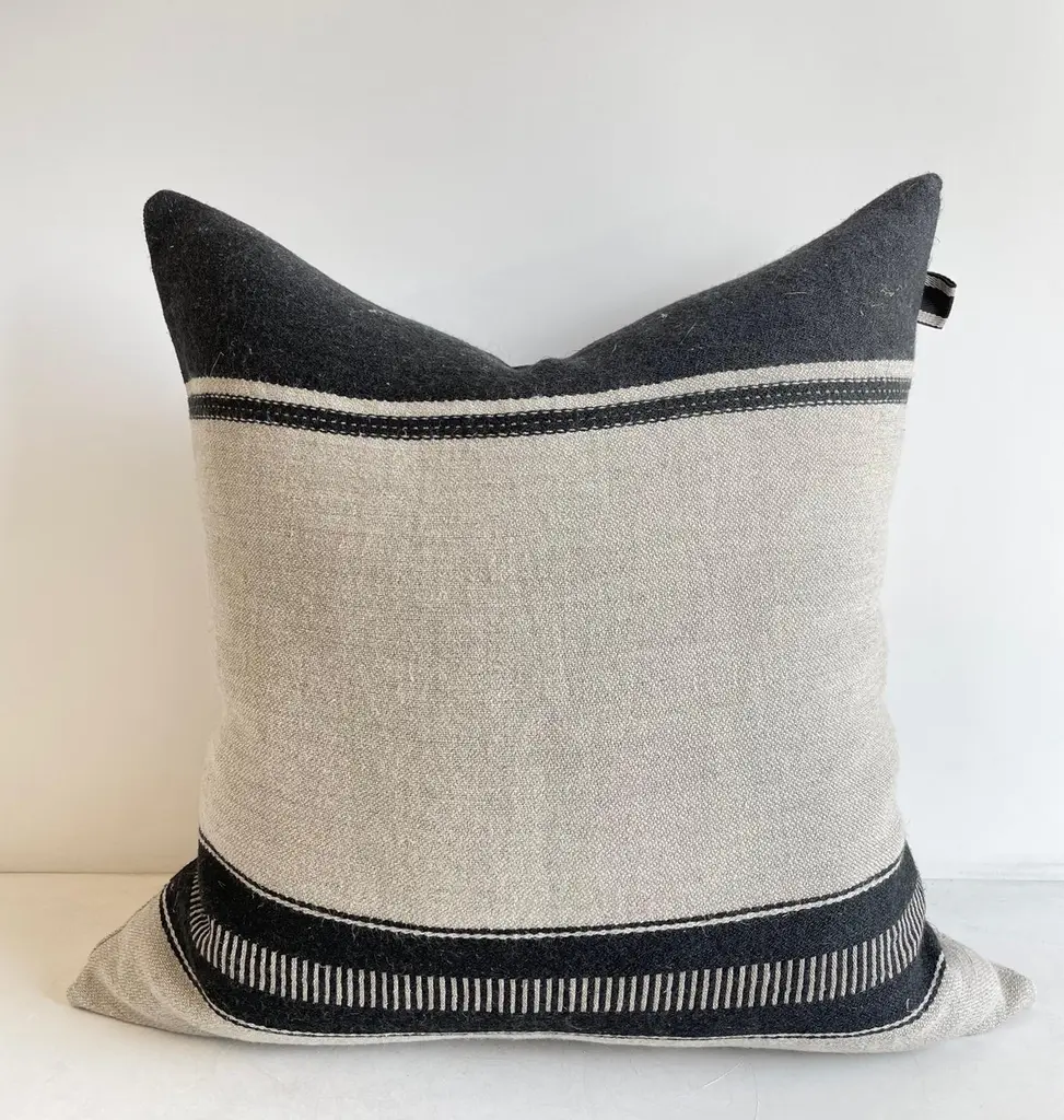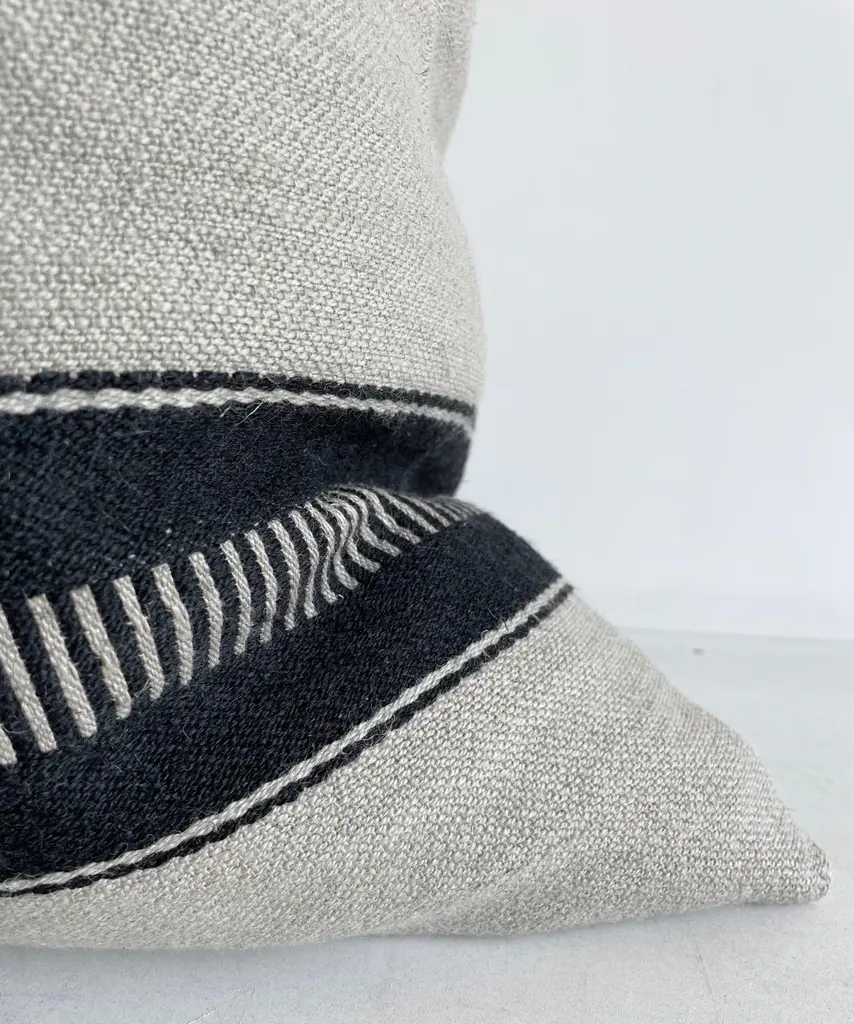 Black and natural linen and wool This is an artisanal product, made of unique linen and wool yarns, therefore variations in the fabric are normal and to be expected.Cover only, please inquire with us to purchase with an insert.Size: 24” x 24”Wash instructions:Please wash at max. 30°C/86°F on a wool or hand wash program. Unfold the coverlets completely before washing and do not overload the machine. Use a mild soap and avoid chlorine bleach. If possible, line dry, it's best for linen and the environment. Should you choose to iron the product, for best results, do so with steam on slightly damp linen.