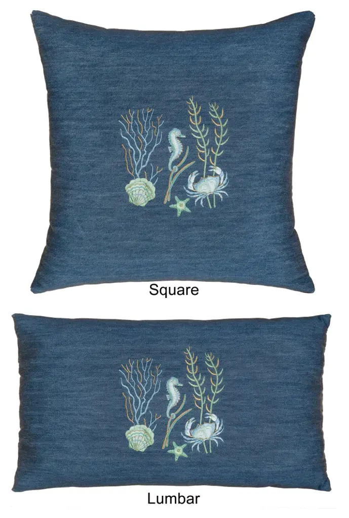 Add a coastal touch to your seating area with the AARON DENIM embroidered pillow cover. Hand crafted in USA, this pillow cover is made of indigo dyed denim in 100% cotton for durability and softness. It features an invisible zipper for ease of cleaning. The AARON DENIM pillow cover will give your decor a tranquil aquatic look.- Sea life embroidered motif on 100% Cotton Denim face- 100% Cotton Canvas back- Hidden zipper closure- Color: Denim Blue- Sizes available: Square 18"H x 18"W & Lumbar 13"H x 21"W- Dry Clean only- Handmade in USA