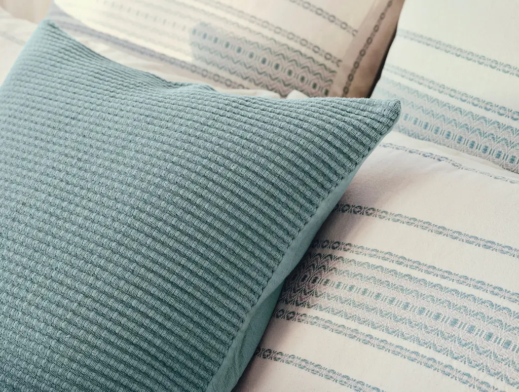 Like the textures and layers found in modern architecture, this design uses intertwined yarns in two subtle colors (Alpine White is monochrome) to blend into a solid hue with depth and dimension. The heavyweight, textural front is backed with our crinkled Sonoma fabric in a matching solid.