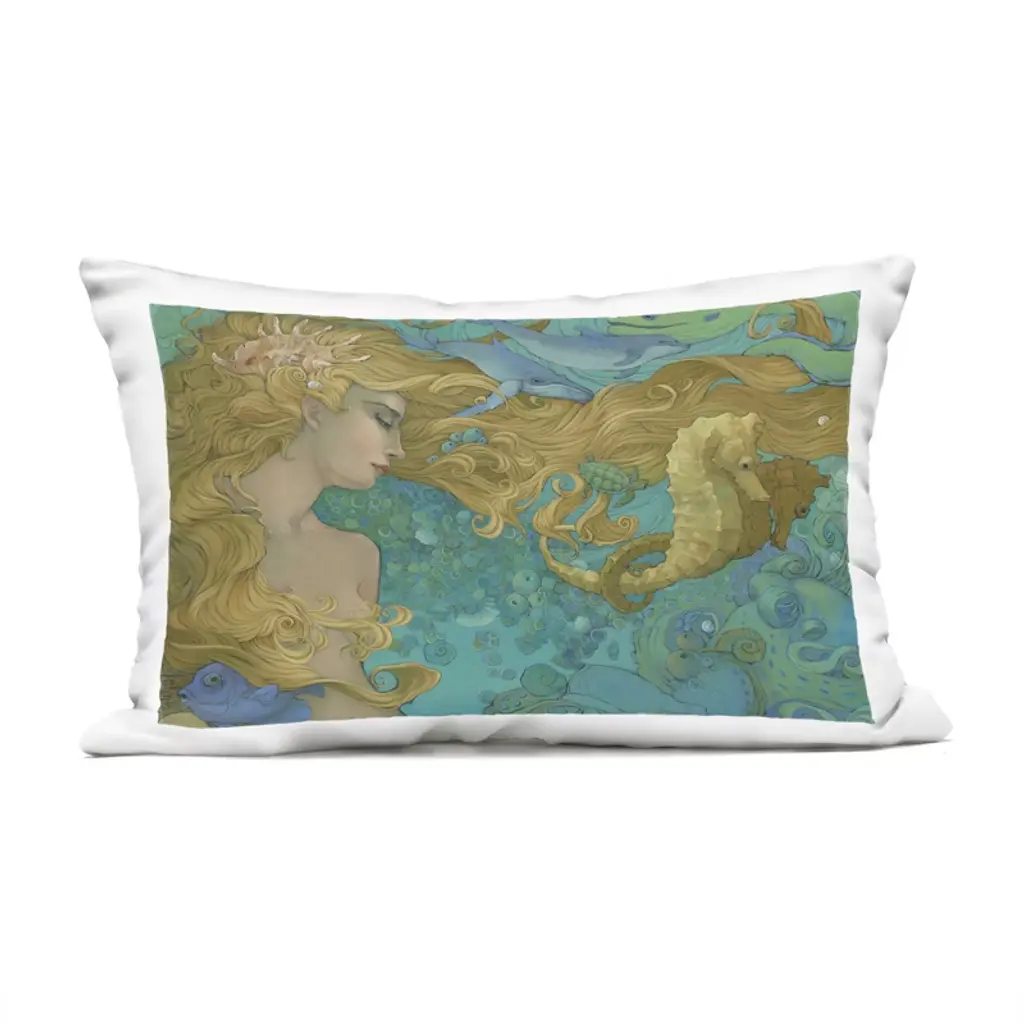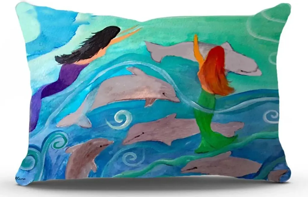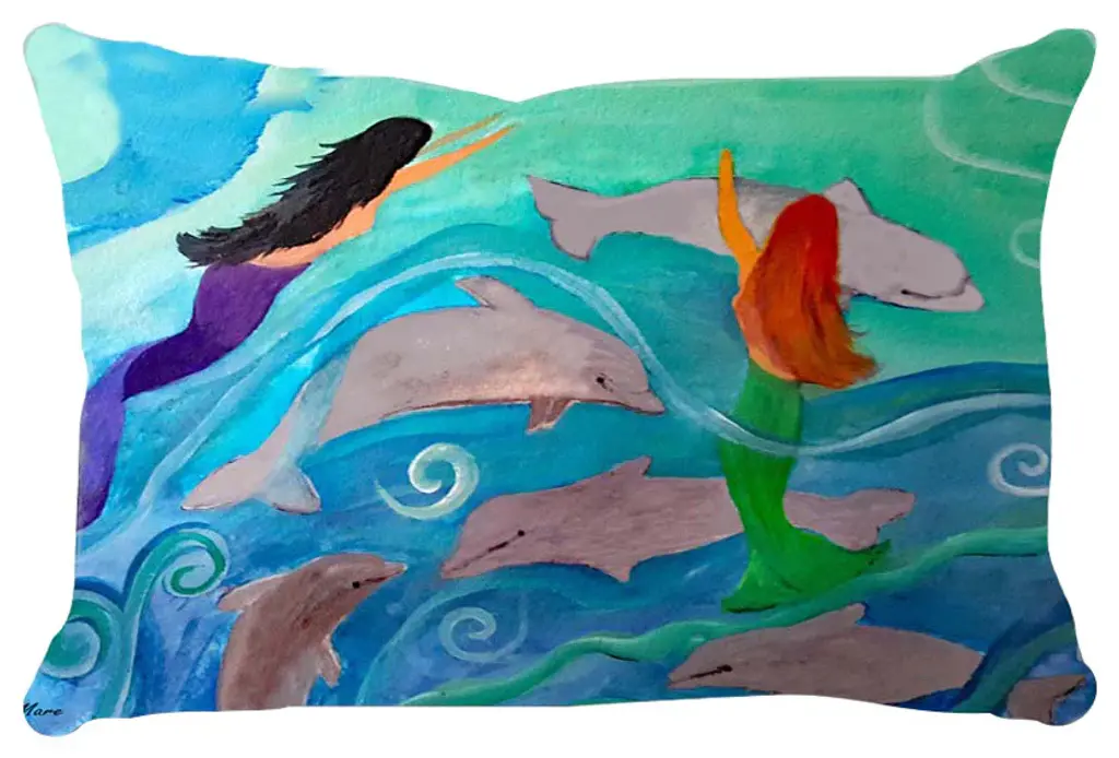 Mermaid Art Lumbar Throw Pillows From Art, Mermaids Swim With Dolphins