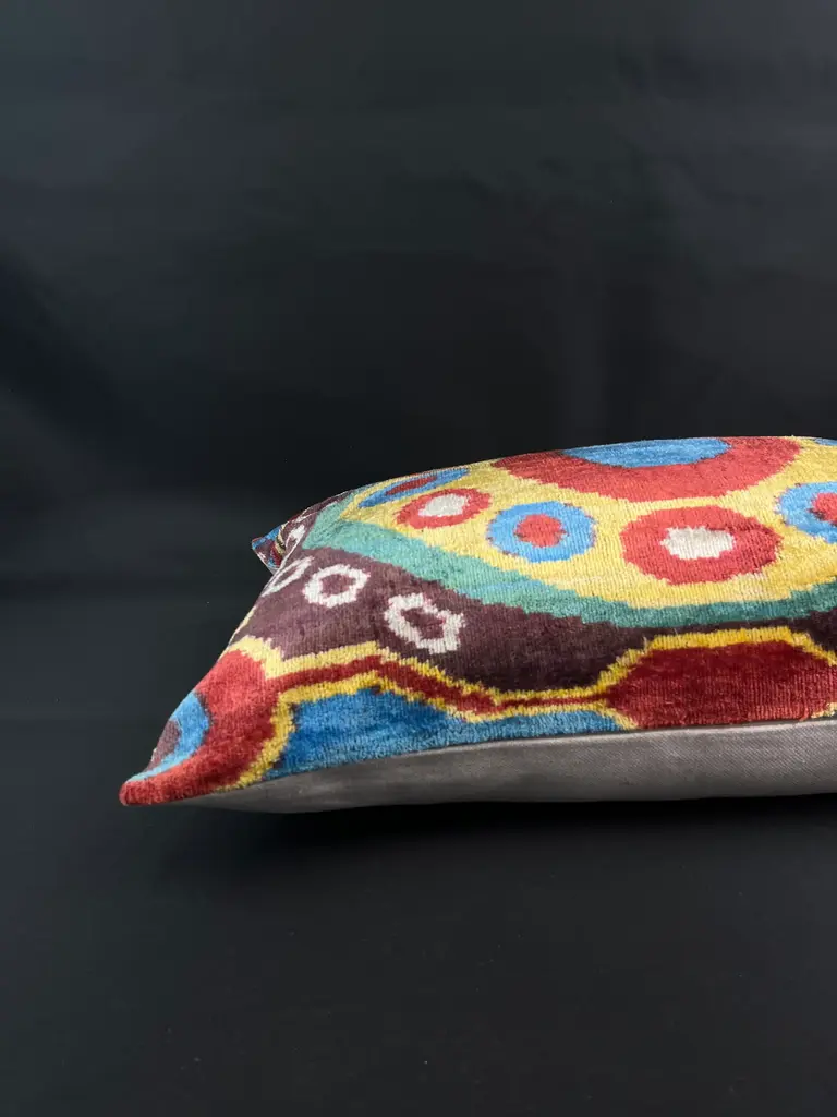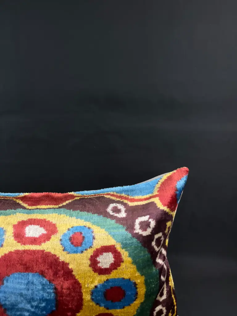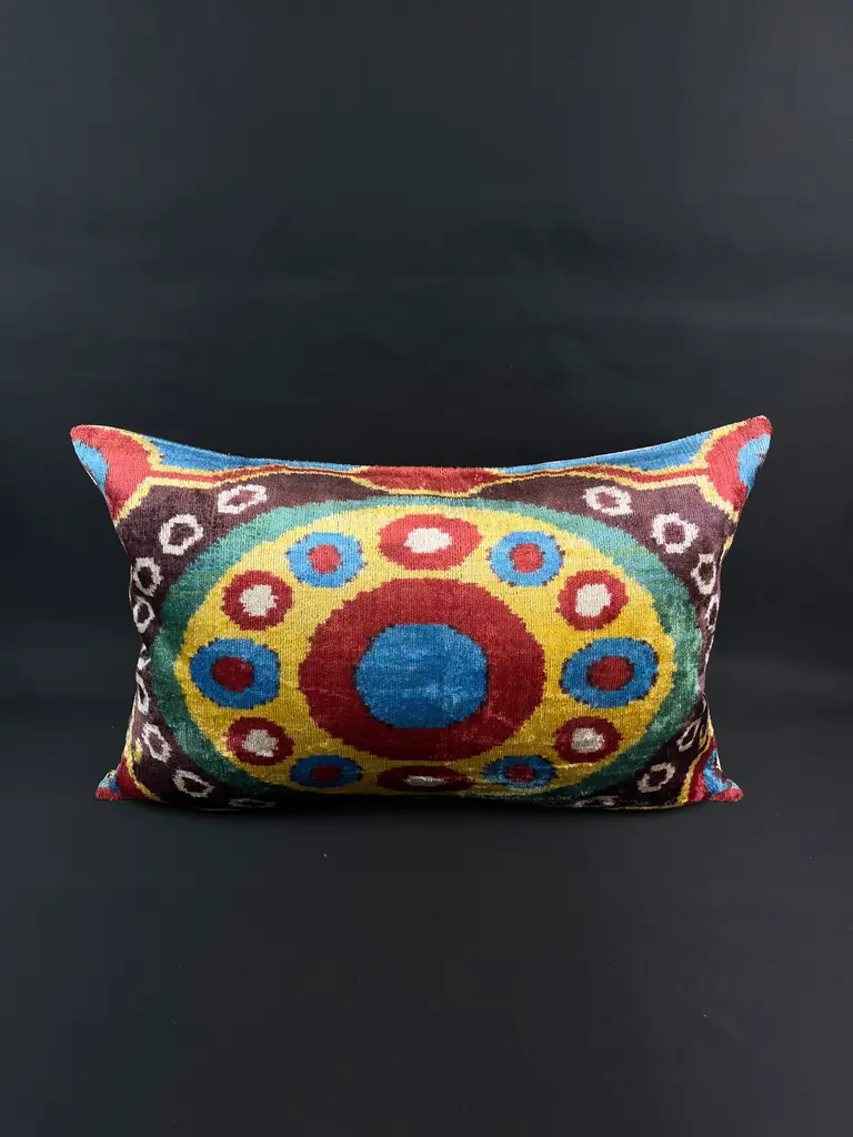 Introducing a stunning Turkish velvet ikat pillowcase, expertly handwoven from the finest silk and adorned with vibrant hand-dyed patterns. This exquisite pillowcase is a true work of art, crafted by skilled artisans using traditional techniques passed down through generations. The luxurious velvet fabric of the pillowcase is incredibly soft to the touch and adds a touch of opulence to any room. The richly hued colors and bold patterns are the result of a meticulous dyeing process, where the silk threads are tied and dyed before being woven into the fabric. The resulting ikat design is a mesmerizing display of artistry and craftsmanship, showcasing the beauty of Turkish textile traditions. The pillowcase measures 16" x 24" and features a 100% cotton back and convenient hidden zipper closure for easy removal and cleaning. This versatile accessory can be used to add a pop of color and texture to any room. Whether you're looking to update your living room, bedroom, or home office, this ikat pillowcase is sure to make a statement. Each pillowcase is handmade with care, ensuring that no two are exactly alike. The attention to detail and dedication to craftsmanship is evident in every stitch, making this pillowcase a timeless piece that will be treasured for years to come. Don't miss out on the chance to add this exquisite Turkish velvet ikat pillowcase to your home decor collection. Order now and experience the unparalleled beauty and quality of a truly handmade work of art. PILLOW INSERT IS NOT INCLUDED We try to show the unique colors of each fabric as accurately as possible. Parts of the pillow cover may have minor defects because they are hand dyed and handmade. We include detailed photos to show various aspects of the products. Please note that colors may vary slightly on different computer monitors and settings.