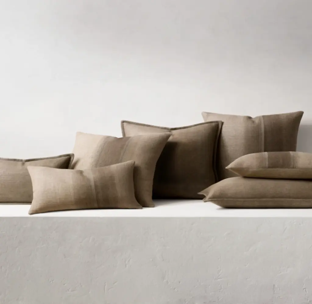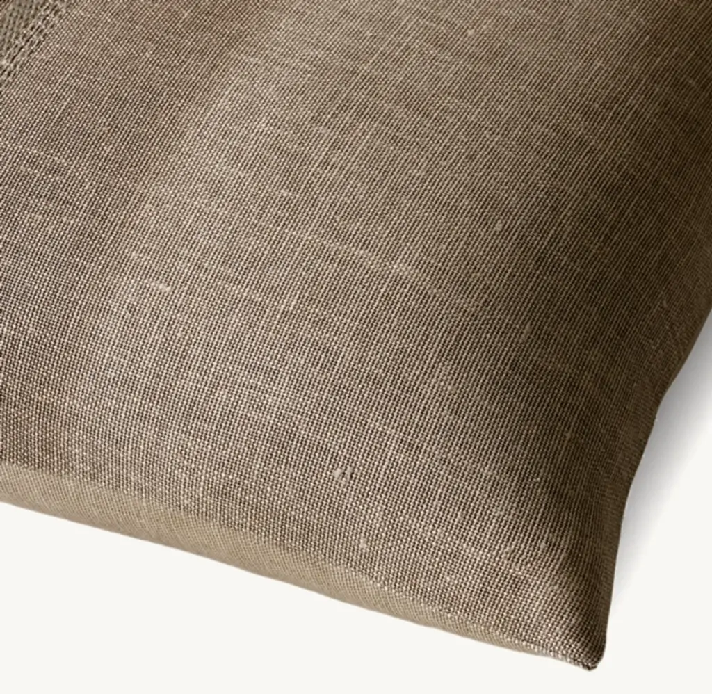 Artisans screen-print our pillows by hand, creating contemporary designs in ombré shading that vary subtly with the technique of the maker. Embroidered stitching enhances the linen's natural spools and lends a patina of tonal texture that is unique to each piece.