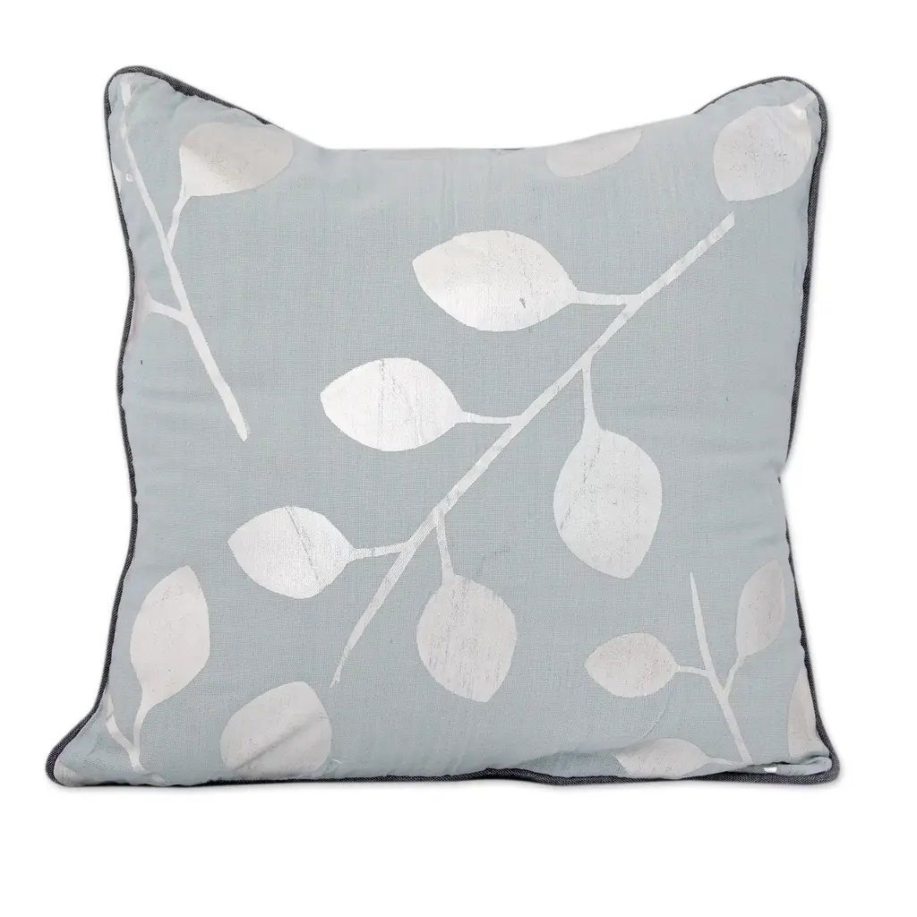Silvery leaves drift across pale blue cotton in a design of dreamy glamour. From Seema, this handcrafted pair of cushion covers features silver foil printing. Darker blue cording defines the edges and a combination of blue and ivory threads forms the solid color cotton back.
