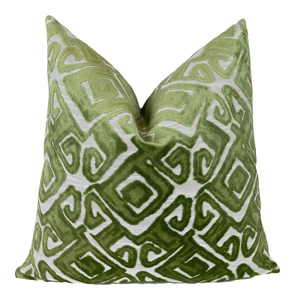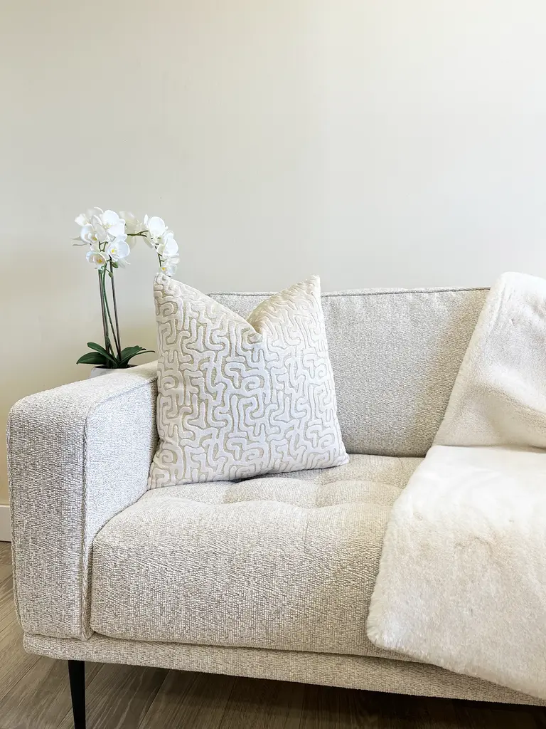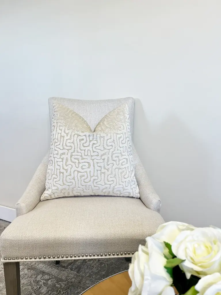 This luxurious abstract pillow adds elegance and style to any decor. This throw pillow cover is made of the finest designer cut pearl white velvet fabric on a cream velvet background. Pearl white is a warm creamy white. This color is particularly rich in this lovely textured cut velvet pillow cover. The pattern is an abstract thick cut velvet on low pile creamy velvet background. Essentially, it's luxe on luxe. It's also the perfect finishing touch to a well designed room. This handcrafted designer pillow cover has it all. It is perfect for adding texture, depth and sophistication to a space. Our pillow covers are tapered at the corners to avoid pointy dog ears. When stuff they will be perfectly square. Handmade in the US. Fabric: Velvet Stuffing: 95/5 Feather Down Insert Care: Dry Clean Closure: Nylon zipper closure Made to order Will ship within 5 business days