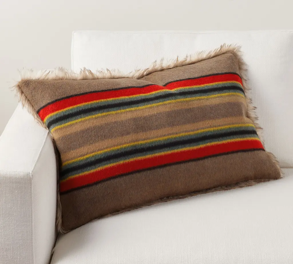Two iconic American brands, one limited-edition collection, celebrating the comforts of home. Dating back to the frontier trading posts of the Pacific Northwest, Pendleton’s heritage Yakima stripe design served as inspiration for this snuggly-soft and machine-washable lumbar pillow cover. Backed with our plush faux fur, it’s the ultimate companion for fireside chats and early-morning cups of coffee.