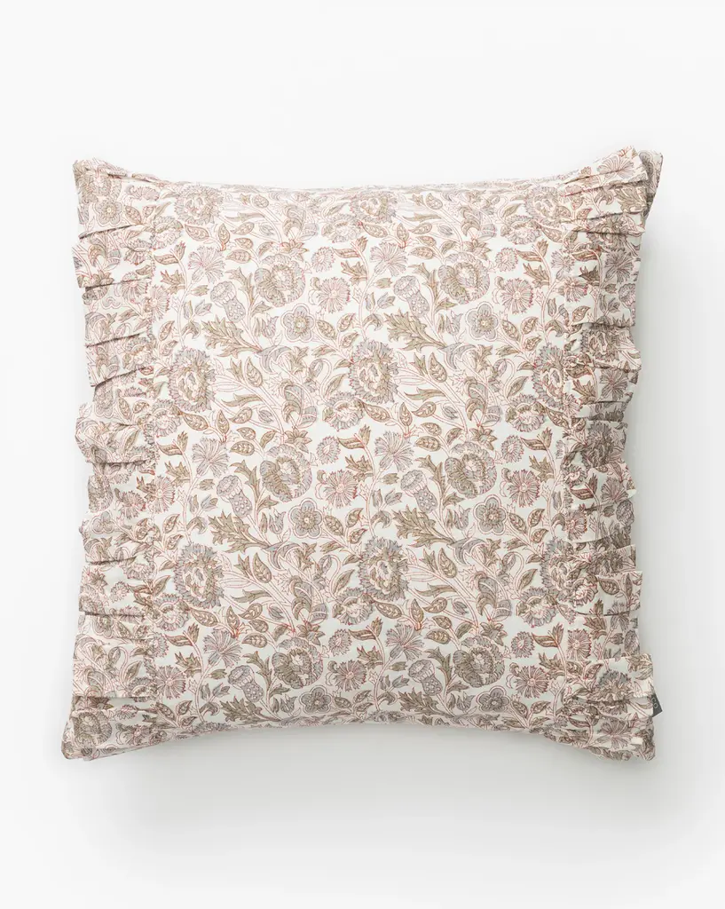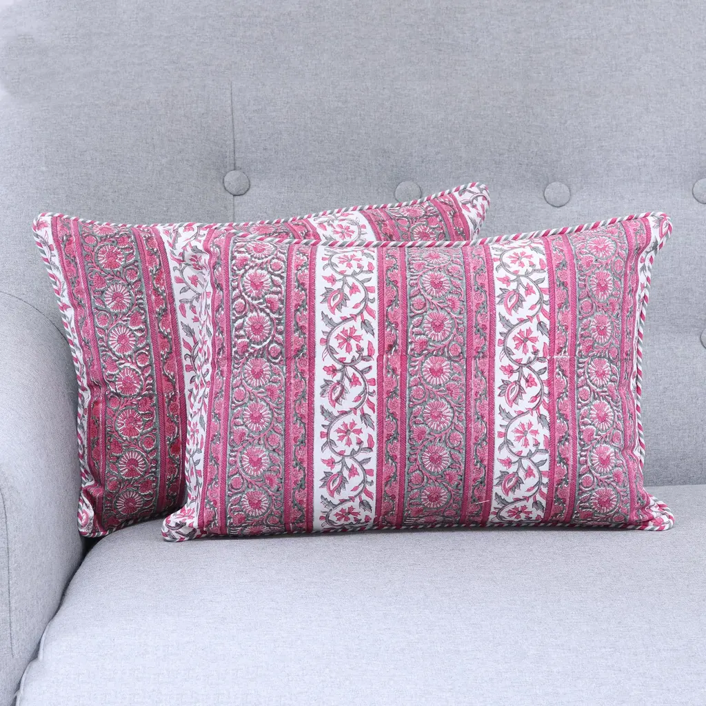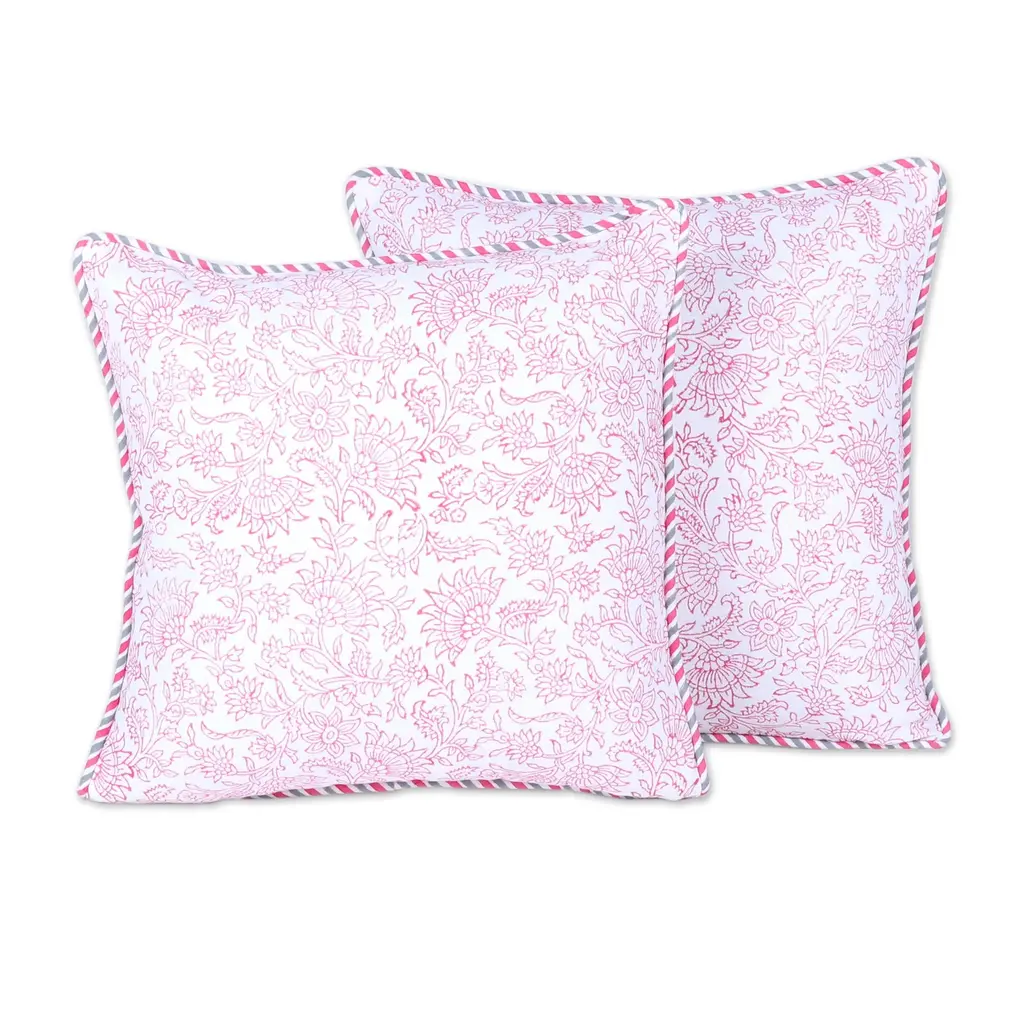 Navya Khanna brings to life the luxurious gardens of the Mughal empire with her "Pink Garden" collection. This pair of cotton cushion covers is covered with floral motifs in warm, deep rose. They are created with India's ancient block print technique. Cotton cording defines the edges, while the reverse side is solid white.