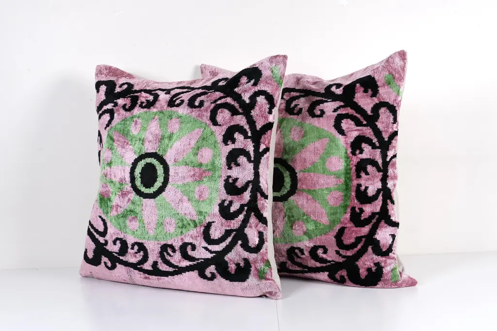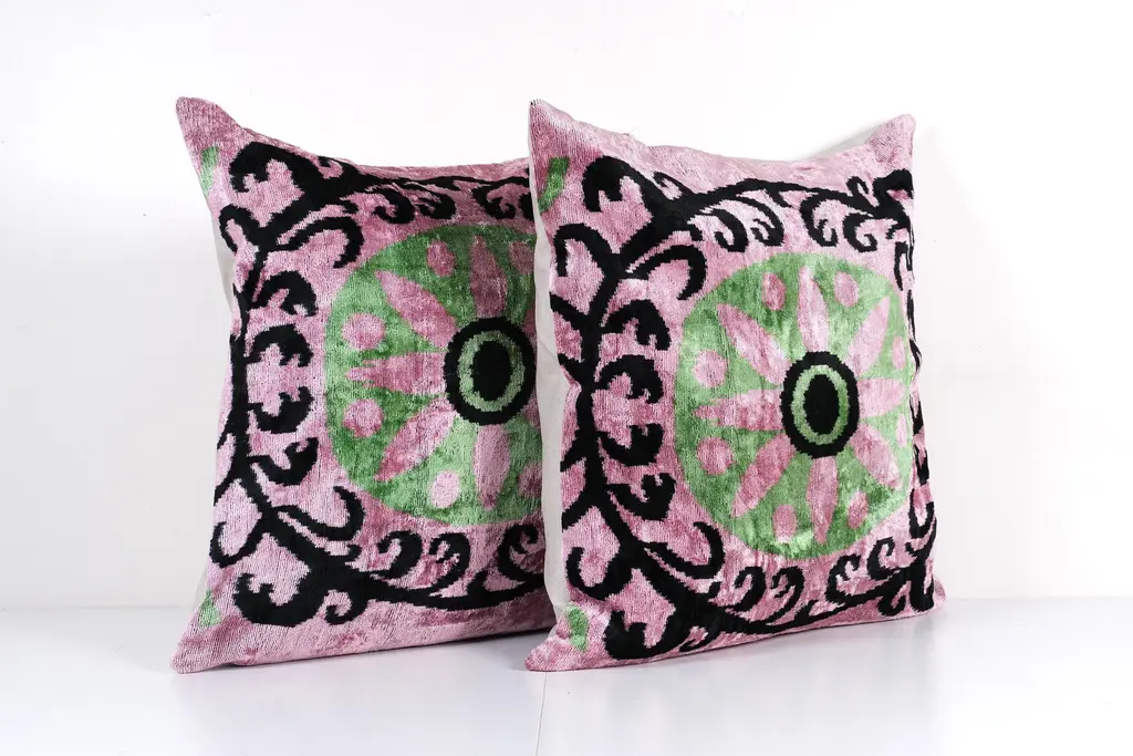 Pink Velvet Pillow Cover - Pair Ikat Floral Design For Elegant Spaces 24'' X 24''