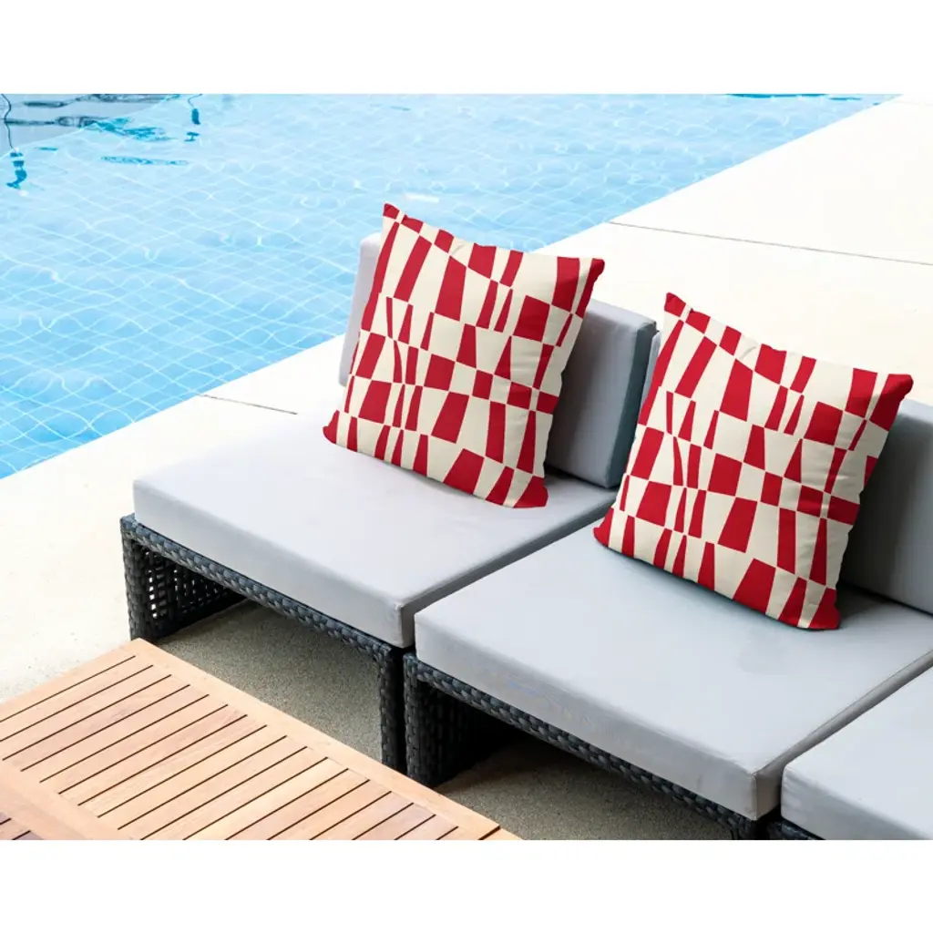 Spruce up your outdoor or indoor space with this indoor/outdoor throw pillow that features checkered abstract patterns. This throw pillow is uniquely custom designed and made in the USA from imported materials, it is crafted from durable and soft spun polyester and it is sewn closed around an included polyester insert. Due to the many variations in monitors and browsers, the color of products may appear different on different monitors.Pillows have a +/- tolerance level of 0.5" for both the Width and Length. To measure correctly, use a flexible tape measure, without squishing the pillow and measure from side seam to side seam.