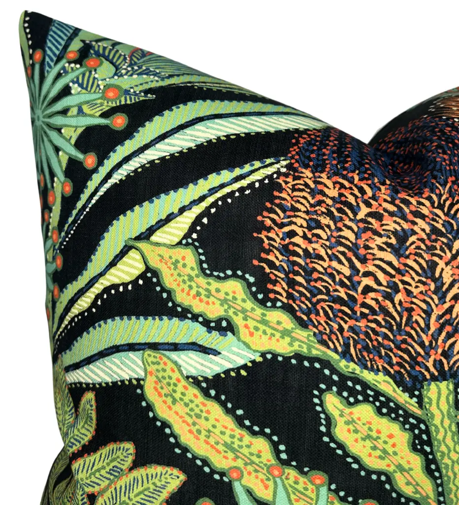 Protea Floral Pillow Cover ⭐️ Ships Within 2 Days On the Front: Floral Printed Fabric On the Back: Ivory or Black Performance Fabric Indoor Outdoor Pillow All pillow covers are sewn professionally, over-locked with finished edges to prevent fraying and has invisible zipper enclosures. This provides long lasting, durable covers that will stay straight and beautiful over time, which makes for a clean professional look.