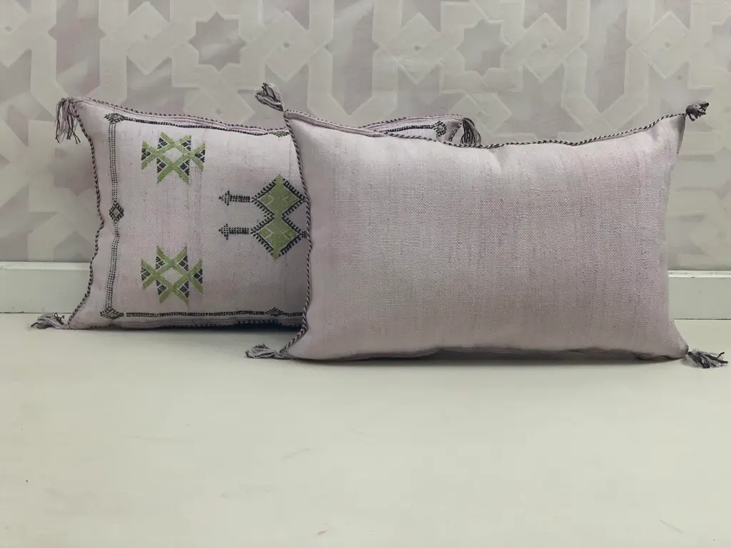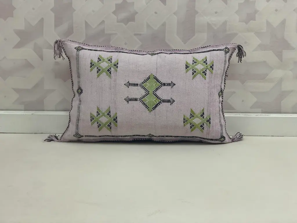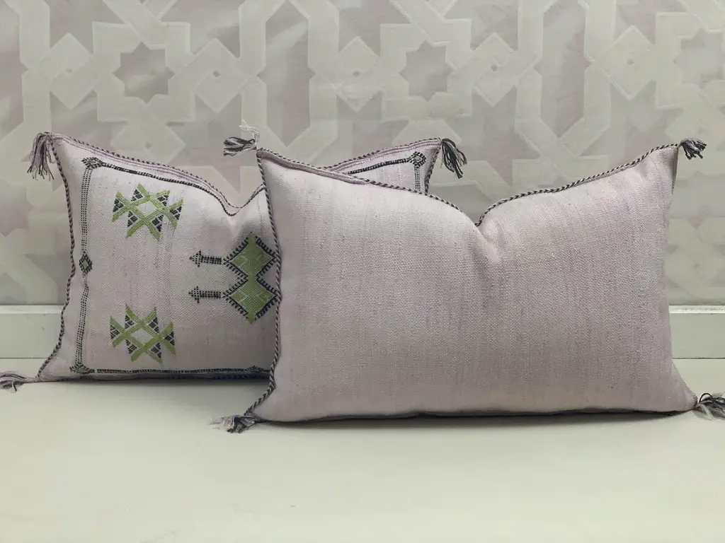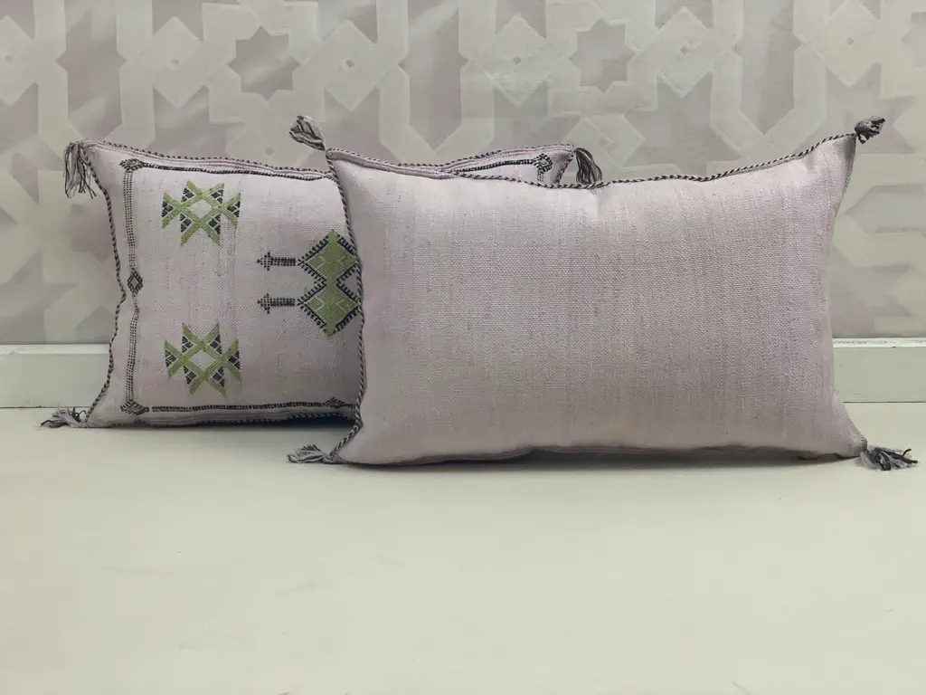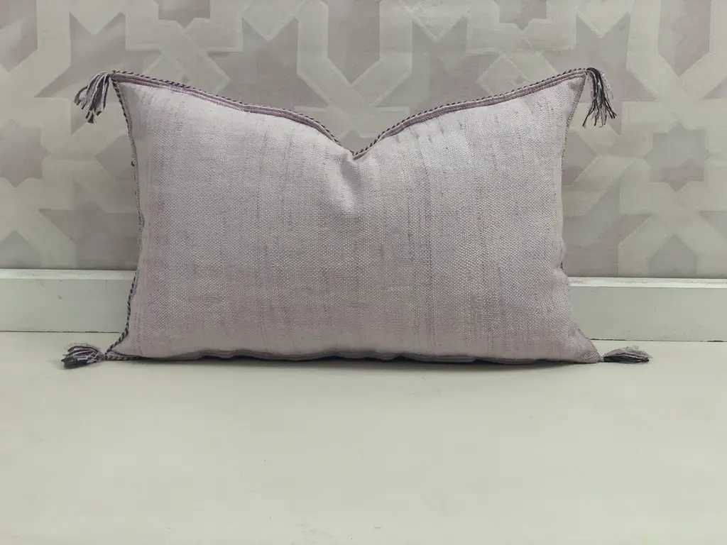 Decorative pillow cover Note Please note that these pillows are made by hand, so they may differ slightly from each other in decoration, shades or color. As each pillow is hand woven and hand dyed, there will be natural slight variations in size and braided color from the image shown. Bringing a little sunshine ☀️ your way today! Local villagers harvest the leaves of the Sabra Cactus plant for the filaments within, and loom the textural canvas into patterns of ancient motifs! Great story! This cactus silk pillow was handwoven from silk from the sabra cactus plant. Each pillow is unique with their berber symbols and are one of a kind. ——— ITEM DETAILS ——— Place of Origin: Morocco State: Excellent / New Color: purple - You will receive the same pillow color as shown in the product description! Origin : Moroccan Atlas Mountains Berber tribe Size: Approx. 13" x 20" (33 x 50 cm) (+/- 2 inch due to the handmade nature of the item). Price is not including the pillow inside Features: Moroccan cactus pillow handcrafted by local Berber artisans This patterned pillow is a unique piece of art. - 100% handmade and handwoven. - This pillow is Moroccan made, handcrafted from Aloe Vera silk, commonly known as vegetable silk, Sabra silk. - No chemicals were used in the weaving process. - Zipper on one side. - Mixed inscriptions at the front. - Please note: Handmade items are not factory made. These pillows may have minor imperfections this adds to their vintage or handmade charm. - This is a 100% handmade sabra pillow. Washing Instructions: Dry Clean Only, Avoid Contact With Water. Product advantages: When you buy a natural, handcrafted product, you will be contributing to the preservation of the environment, How to stuff: Product is shipped unstuffed. Can be stuffed using an economical way by using old clothing or bedding material such as comforters and blankets. For a firmer support, a foam insert can be used. We use TWO memory foam pillows to create a firm top and a comforter. Our products are handcrafted by artisans using traditional techniques. while each piece is created by an expert in their craft, handmade and vintage items are perfectly imperfect. there may be minor imperfections such as fading colors, loose threads, or wear. we believe these characteristics are all part of the story behind the product and the artisan that crafted it, making it truly unique. we hope you do too! ✈️✈️✈️ Shipping ✈️✈️✈️ FREE shipping in the WHOLE WORLD. Buyers are responsible for any Customs or Duty fees incurred. Shipping methods : DHL Express “Door to Door” for your convenience 2-5 Business days after handling time anywhere in the WHOLE WORLD, our shipments are secure and insured for lost; a tracking number will be provided to track your package. Please ask ALL questions before buying! ❓❓❓ ARE FLOOR CUSHIONS CLEANED? Yes, all floor cushions are carefully cleaned before they are shipped off to their new owners. ⭐️⭐️Note ⭐️⭐️ Note: We have done our best to capture precise colors, but know that the colors may vary based on the display screen and lighting (natural vs low lighting). If you would like any inquiries, please do not hesitate. I can send more pictures to you if you want to have another better idea of the look,