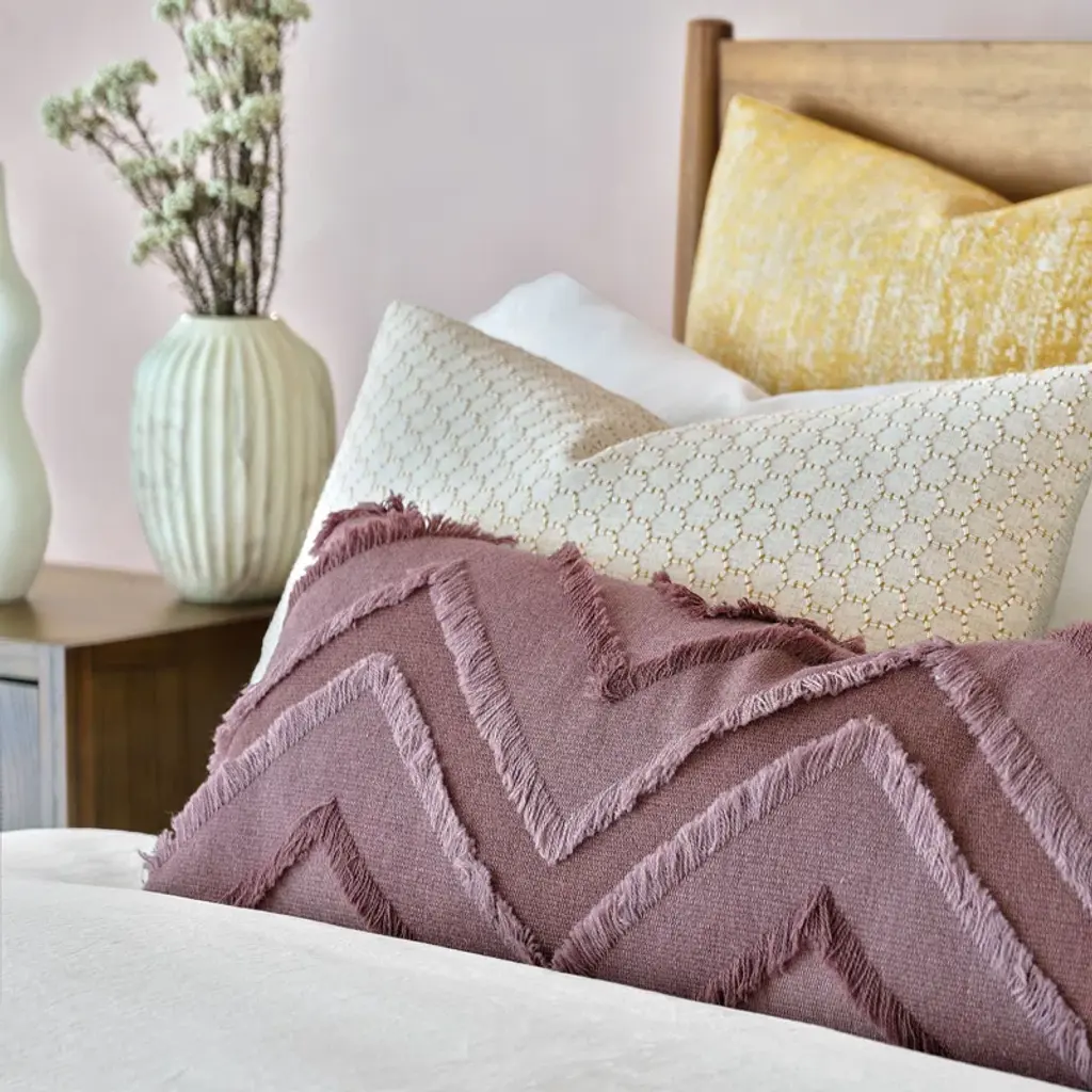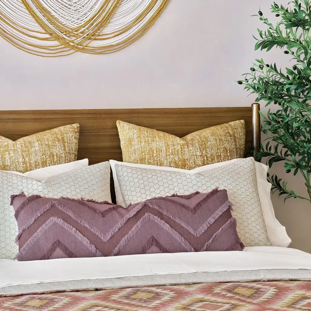 Explore desert hues with Reinhart, a feminine take on southwestern style. Accented with honeycomb embroidered shams and a chevron fringed bolster, the mauve Aztec-inspired duvet creates an inviting oasis. Earth tones such as blush and mustard pair together to bring the desert sunsets home.
