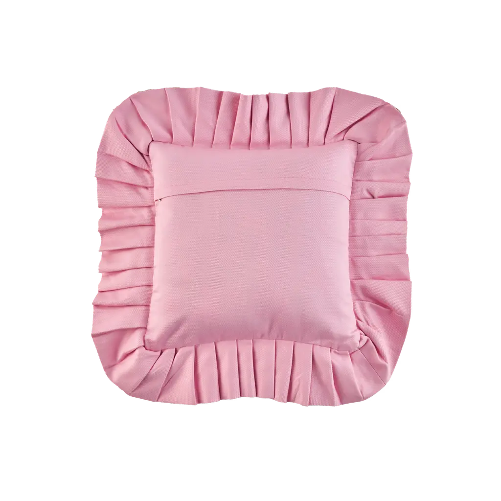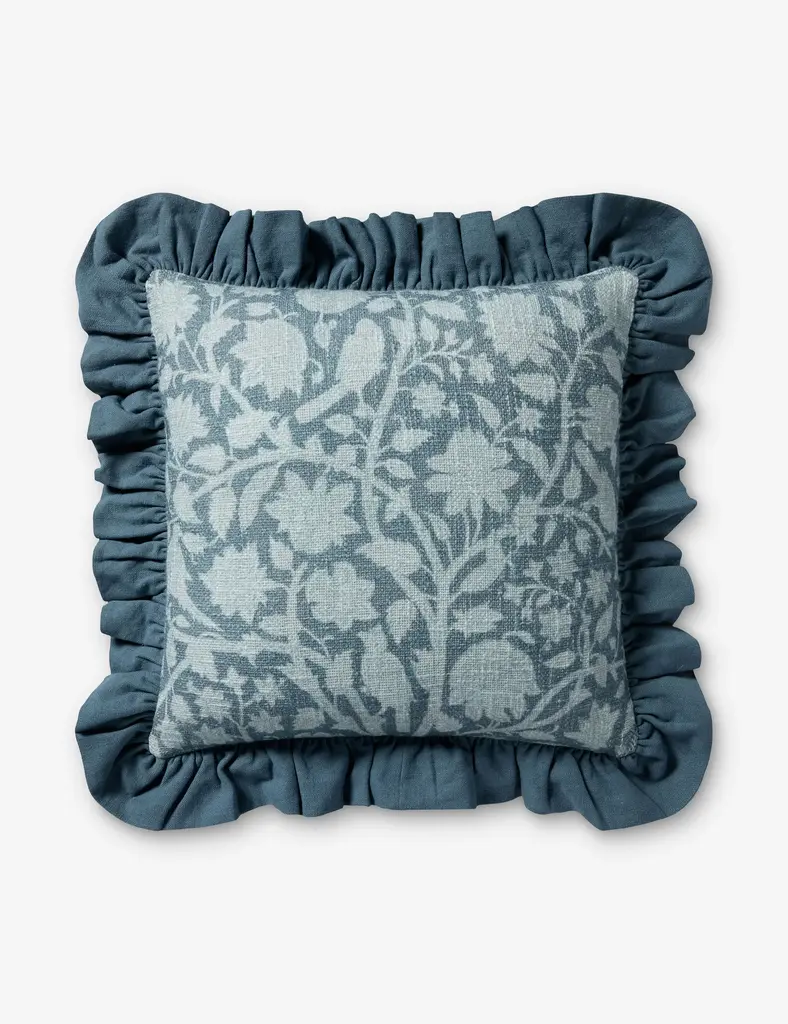 A throw pillow with a bold floral print on moss green with a romantic ruffle in baby pink. Adds a gorgeous pop of color to your sofa or bed or daybed, with a uni colored back. Pair it with the square throw pillow in the same print, or use the version in golden orange.Made from 100% Organic Cotton and printed with low impact dyes. Size: Body 14" x 14" / 35 x 35 cm, Ruffle 3" / 8cmComes without a filler.