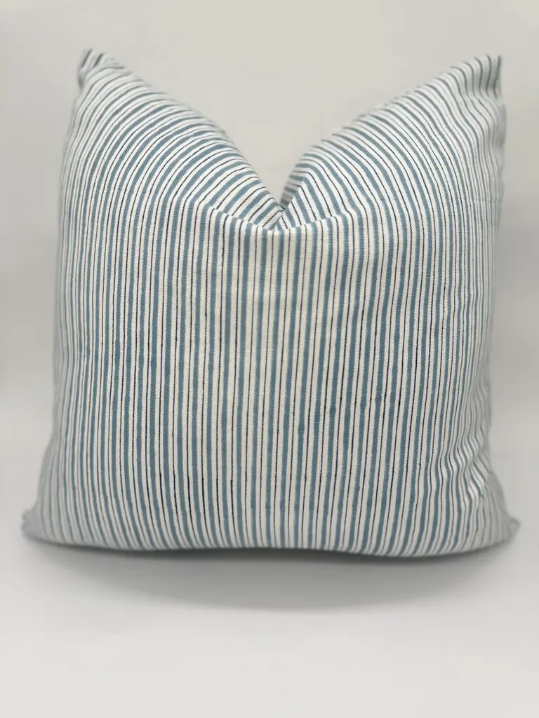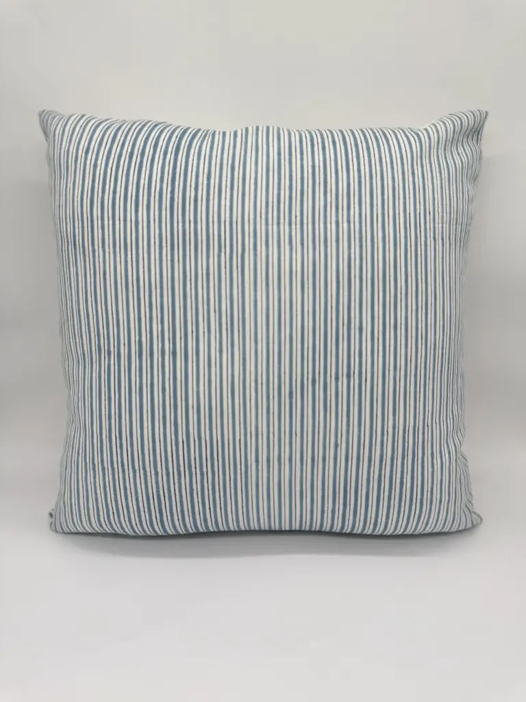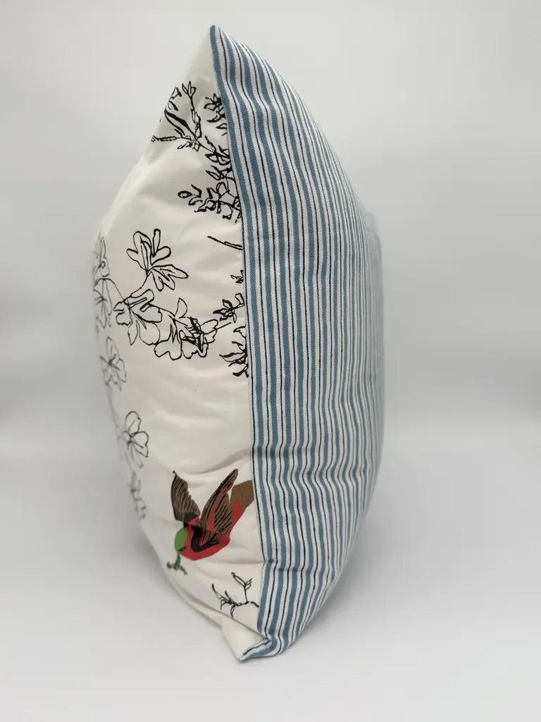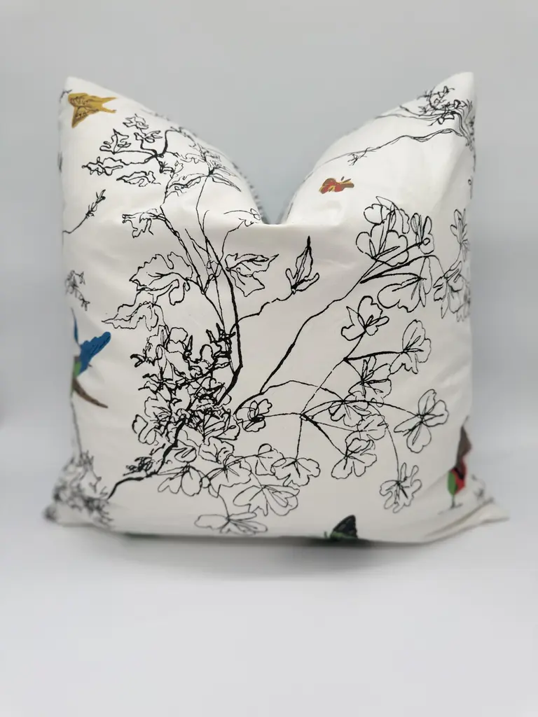 This throw pillow cover features a sophisticated and whimsical design, perfect for adding a touch of elegance and nature-inspired charm to your living space. The front of the pillow showcases a delicate black line-drawing of blossoming branches interspersed with vividly embroidered birds and butterflies in vibrant hues such as red, green, and blue. These elements provide a beautiful contrast against the crisp white background, adding both depth and a pop of color. The back side of the pillow cover reveals a stylish surprise: a panel of vertical blue and white stripes that adds a classic, tailored look and complements the organic front design. The combination of botanical sketches and colorful embroidered fauna with a striped side panel gives the pillow a modern eclectic appeal, ideal for both contemporary and traditional interiors. 100% Cotton 20" x 20" Invisible zipper for a clean tailored finish Knife edge construction creates crisp tailored shape Due To Variations In Screens, We Cannot Guarantee That The Colors Shown Here Are A True Representative Of Our Products. To Achieve An Overstuffed Look, We Recommend Pillow Inserts That Are Two Inches Larger Than The Pillow Cover.