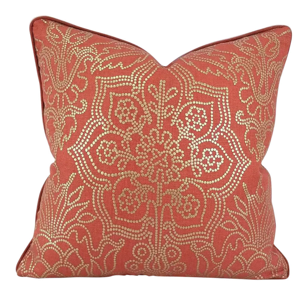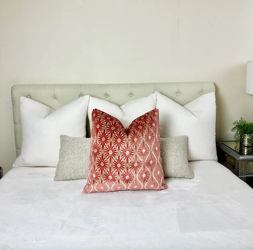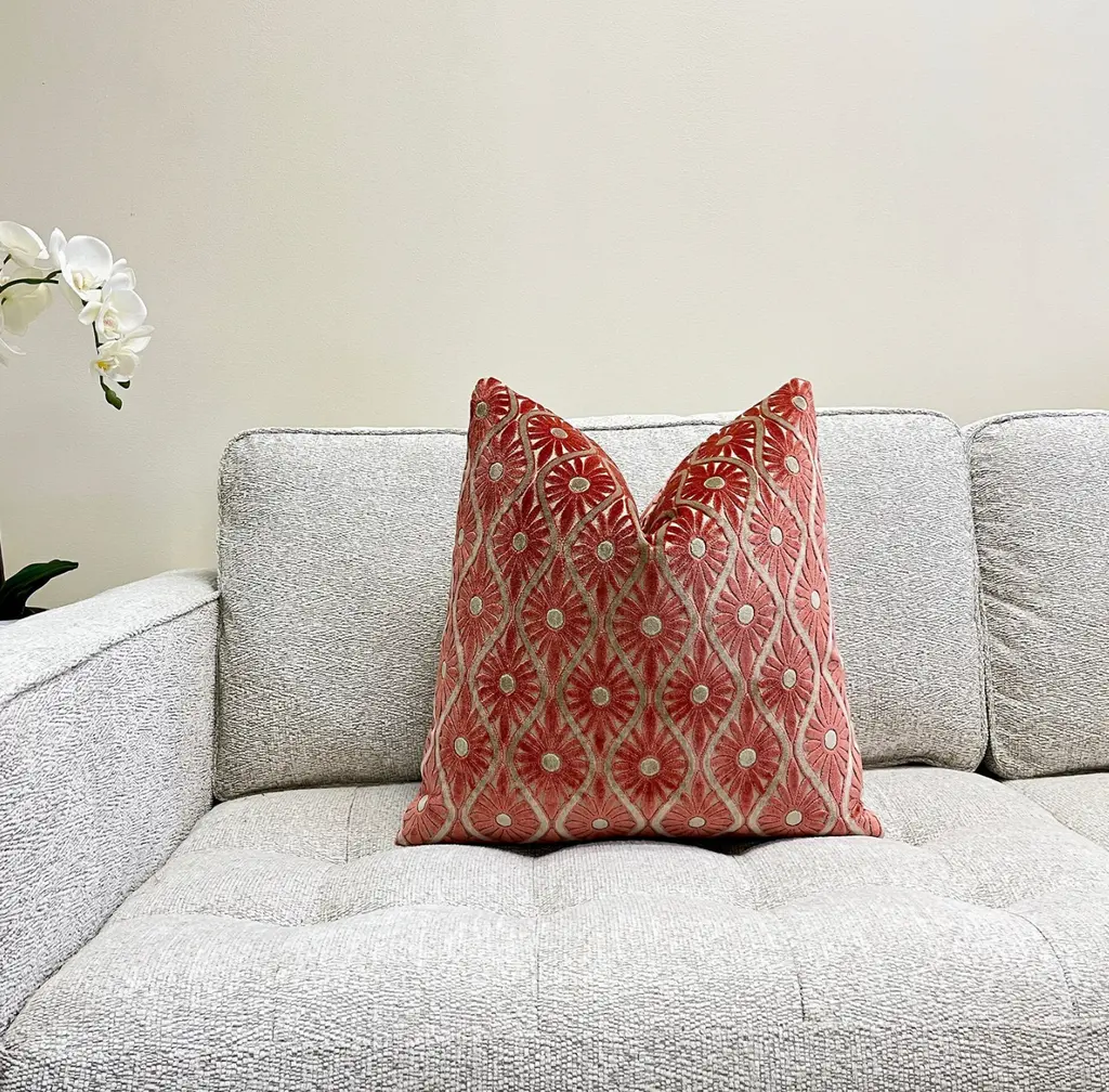 The spiced coral velvet throw pillow is a stunning addition to any home. The red-orange shade of the fabric adds a warm and inviting touch to any room. The jacquard design of the pile coral velvet for the flower petals, bordered with beige, is an intricate pattern that is sure to catch the eye of any guest. Not only is this decorative pillow cover beautiful, but it is also incredibly soft and comfortable. The velvet material is plush and luxurious. It truly must be seen to fully appreciate it. Whether you're looking to add a pop of color to your living room or bedroom, this spiced coral velvet throw pillow cover is the perfect choice. Made in the US. This pillow comes stuffed with a Feather down insert. Fabric: Velvet Stuffing: 95/5 Feather Down Insert Care: Dry Clean Closure: Nylon zipper closure Made to order Will ship within 5 business days