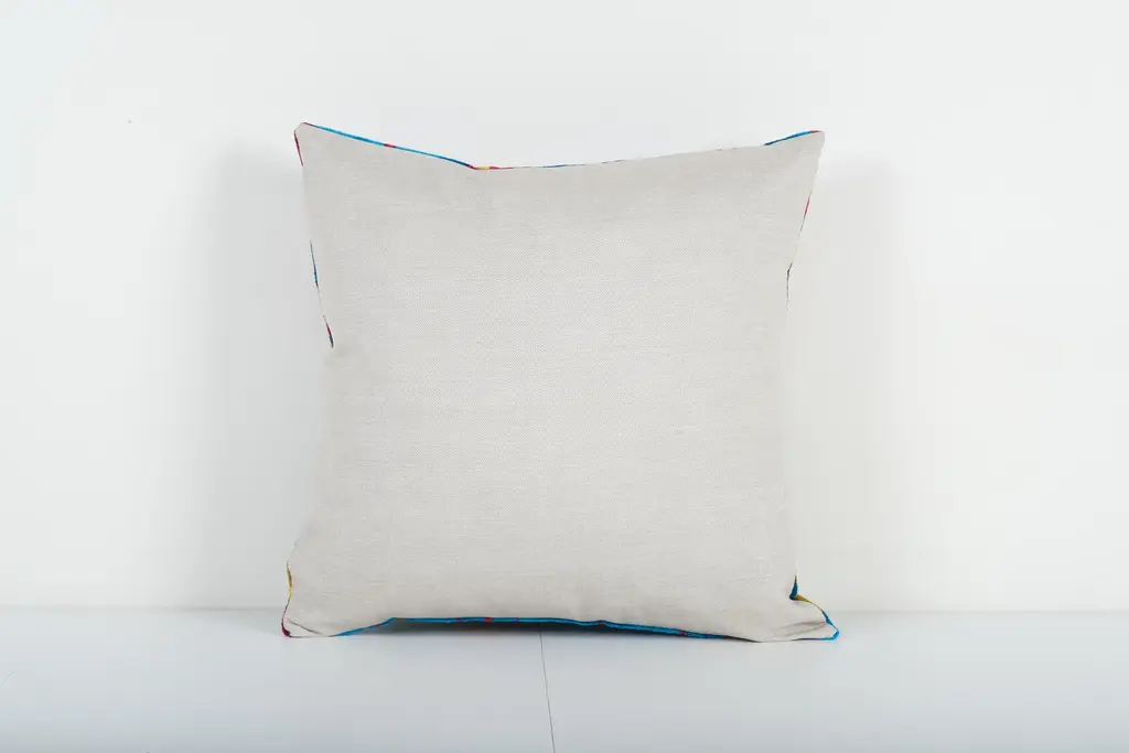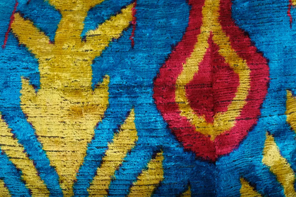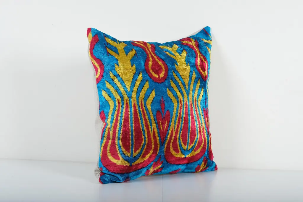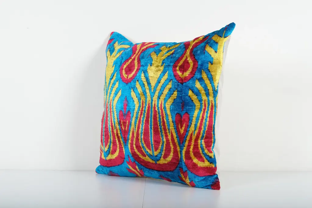 Decorative Throw Velvet Ikat Pillow -Luxurious cushion cover of handloomed ikat fabric -Insert is NOT included -Color: Blue Yellow and Red -Ikat is an beautiful fabric, every pillow is unique but can also contain small imperfections; the charm of a handmade product. Dimensions: 20ʺW(50 Cm) × 6.0ʺD(15 Cm) × 20''( 50 Cm) approx Warning: Since ikat is a handmade fabric, the width and length of the throw pillow can be a few inches smaller or larger. -Handloom 80% silk velvet 20% cotton -Back side is cotton fabric and with hidden zipper. -Handwoven velvet pillow case only, -Hand wash 30 C or dry clean -Colors may be slightly different in reality from those shown on the photos, due to the nature of photographing and device monitor settings. -Custom duties may apply.