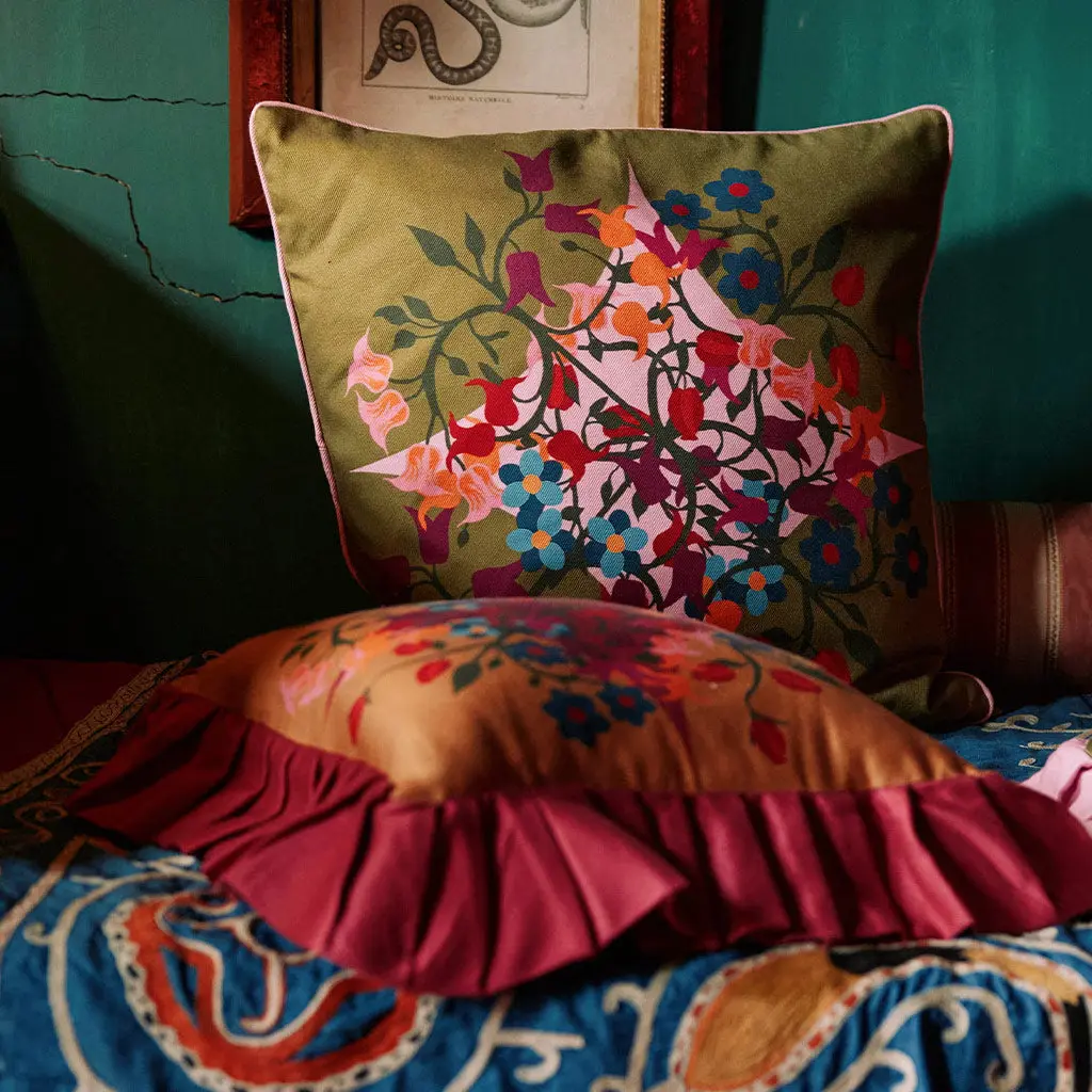 A square throw pillow with a bold floral print on moss green and baby pink. Adds a gorgeous pop of color to your sofa or bed or daybed, with a uni colored back. Pair it with the ruffled throw pillow in the same print, or use the version in golden orange.Made from 100% Organic Cotton and printed with low impact dyes. Size: 20"x20" / 50x50cmComes without a filler.