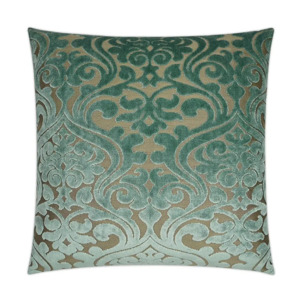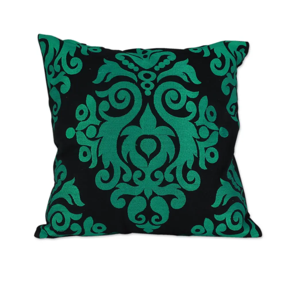 By Asha Prabha, this design contrasts teal and black to exalt their bold beauty. The pair of cushion covers featured lavish machine embroidery, while the reverse side is solid black.