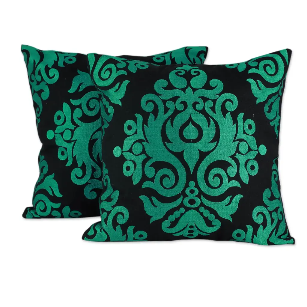 Teal And Black Embroidered Cotton Cushion Covers (Pair)- Teal Beauty
