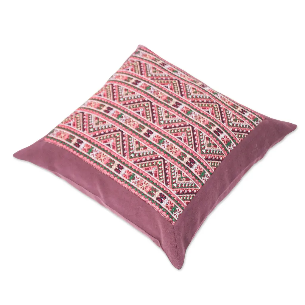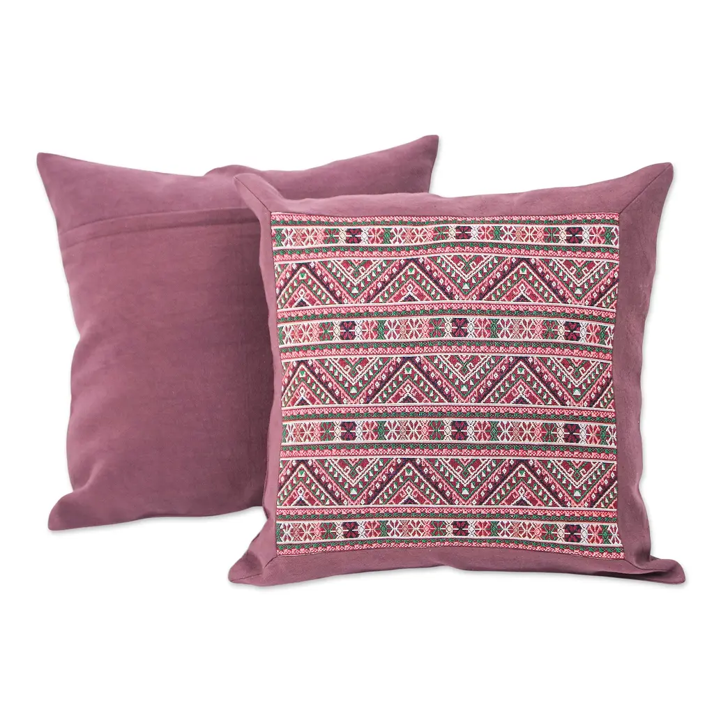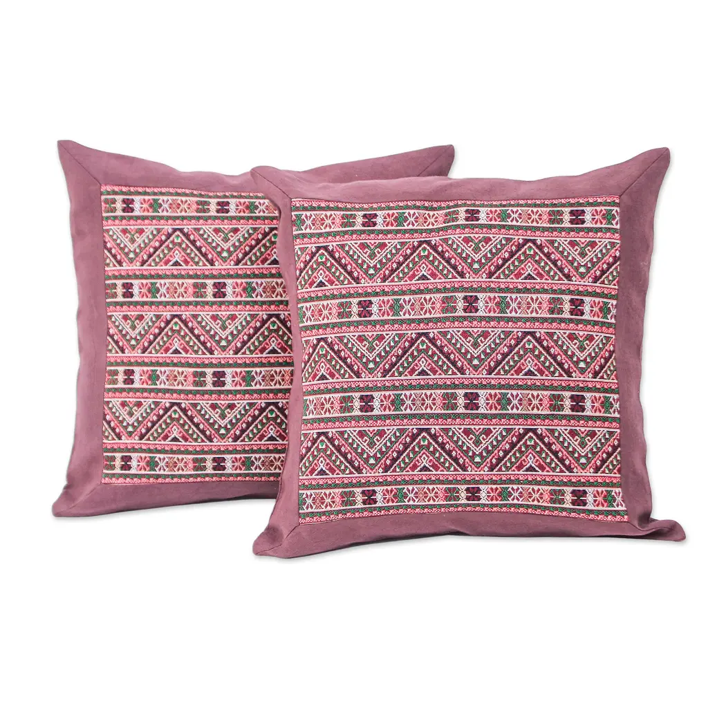Traditional Hill Tribe geometry comes alive in these handwoven cotton cushion covers, where red, green, black, yellow and white threads intersect in mesmerizing patterns. Presented by Thailand's Keawpankanlaya, this dreamy pair showcases intricate motifs across the front while solid plum fabric wraps the backs and borders for a polished finish. The zippered openings make swapping cushions effortless, so you can refresh your favorite reading nook or sofa with these colorful, character-rich accents that honor generations of textile tradition.