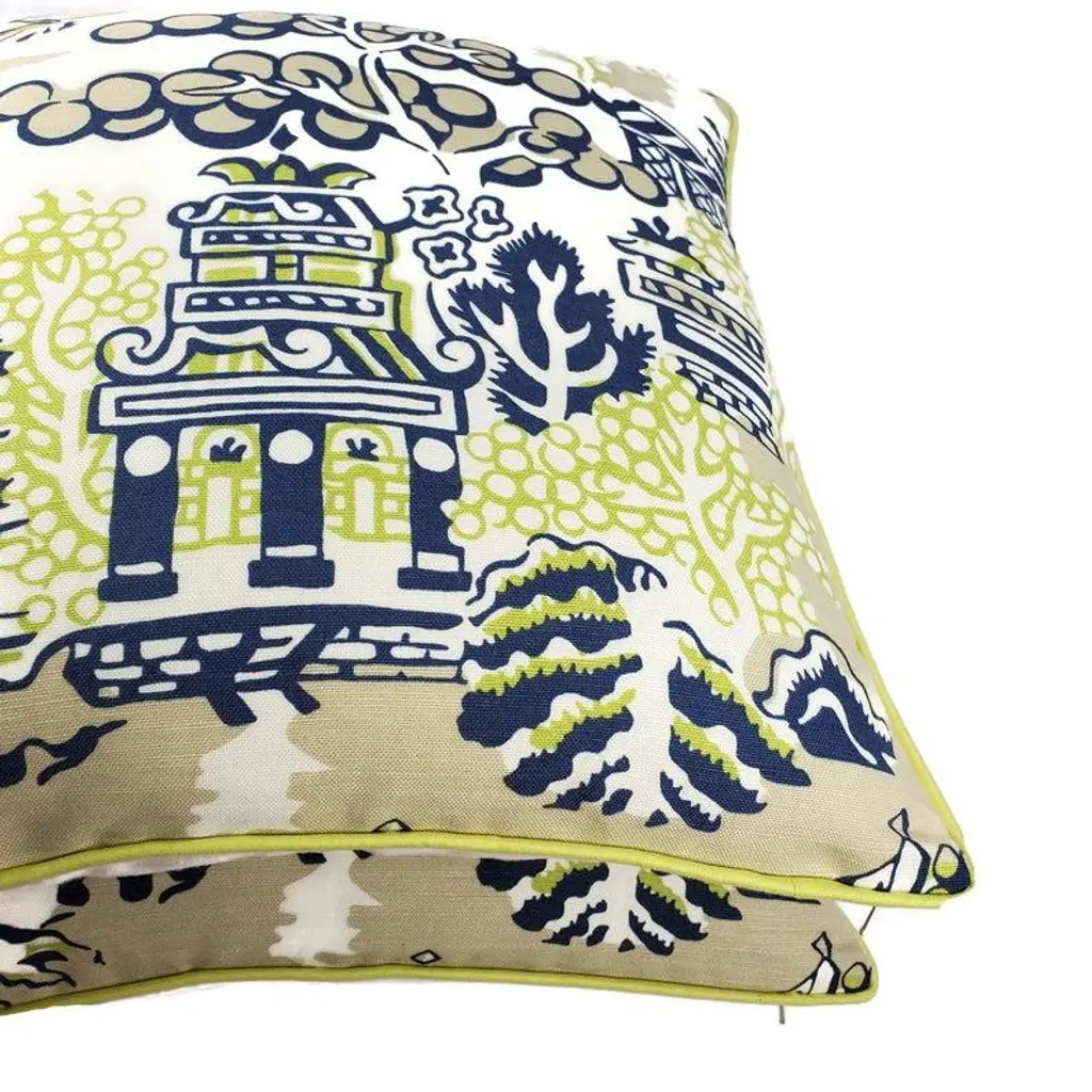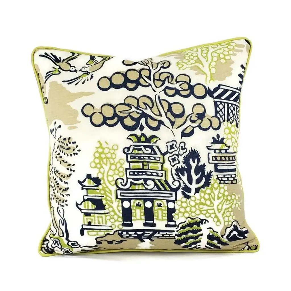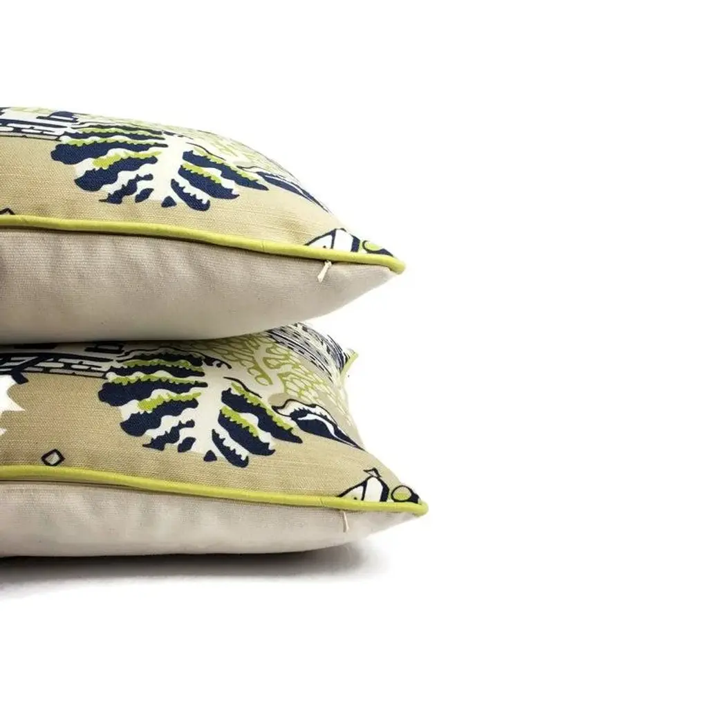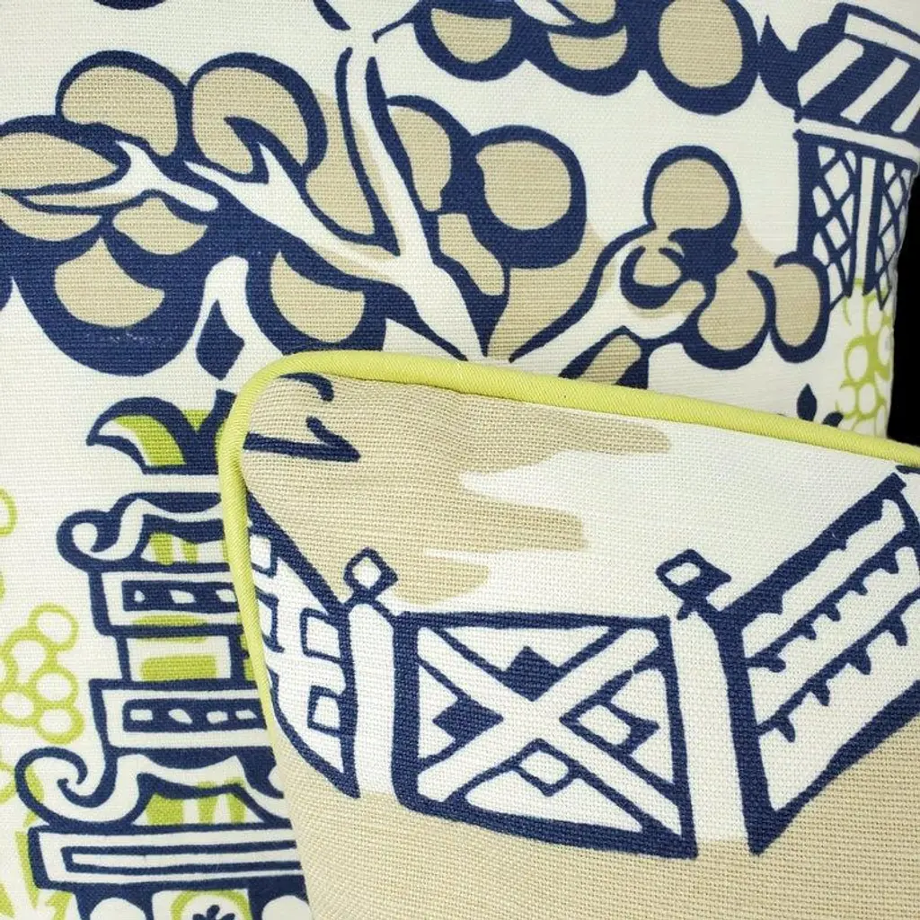 From Thibaut is Luzon in the color Navy on Beige pillow cover. This pillow has colors of beige, cream, navy and lime green. This pillow has been embellished with a lime green welt on the edges that truly enhances the green in the print, giving it a lasting impression. This pillow is made with an invisible zipper and surged edges. Front: Luzon in Navy on Beige Back: Cream linen/cotton blend Welt: Lime green piping Size: 20" x 20" Cleaning method: Dry Clean only Note: This listing is for ONE pillow cover only. Pillow insert NOT included. The recommended pillow insert size is 22" x 22" for this cover.