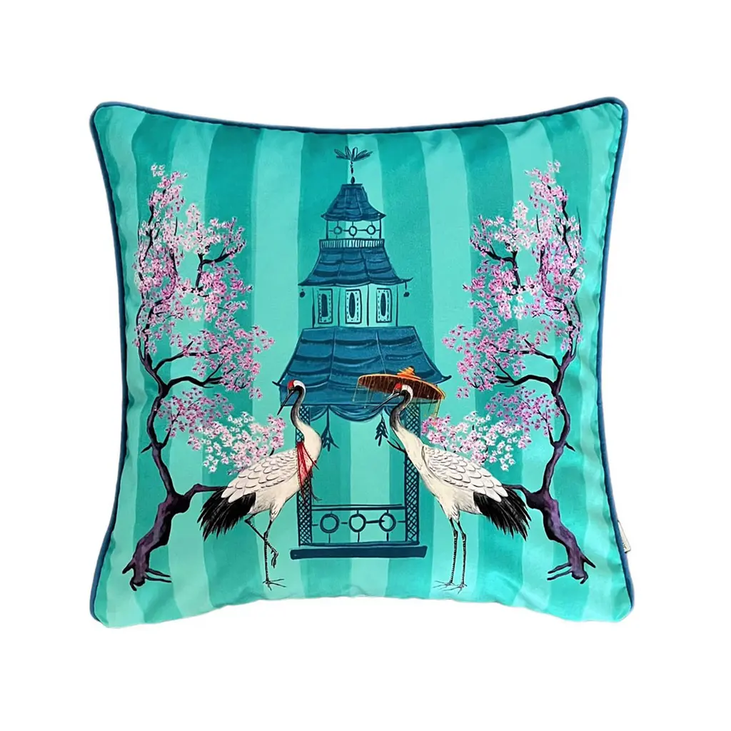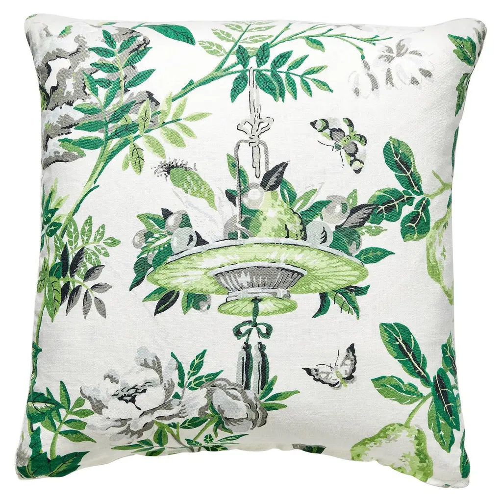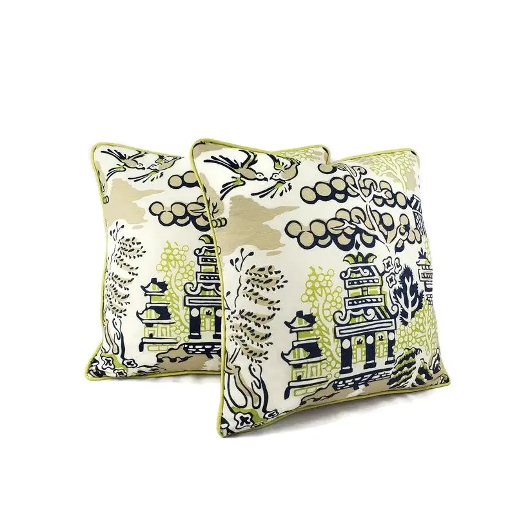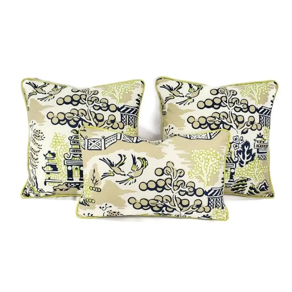 From Thibaut is Luzon in the color Navy on Beige pillow cover. This pillow has colors of beige, cream, navy and lime green. This pillow has been embellished with a lime green welt on the edges that truly enhances the green in the print, giving it a lasting impression. This pillow is made with an invisible zipper and surged edges. Front: Luzon in Navy on Beige Back: Cream linen/cotton blend Welt: Lime green piping Size: 20" x 20" Cleaning method: Dry Clean only Note: This listing is for ONE pillow cover only. Pillow insert NOT included. The recommended pillow insert size is 22" x 22" for this cover.