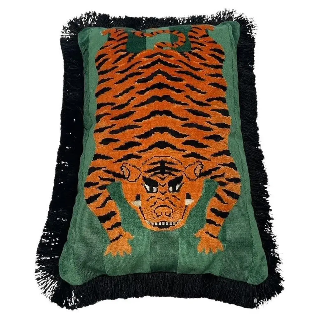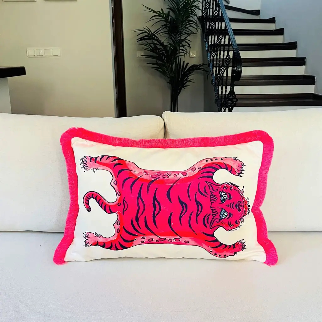Add vibrant charm and positive energy to your living space with this striking Tiger Skin Throw Pillow. Featuring hot pink tassels and inspired by artisan handmade paintings, it blends bold design with cultural artistry. Part of the World Heritage Series, this cushion celebrates heritage and creativity. Both sides feature different high-resolution patterns, offering versatile style. Crafted with first-class craftsmanship for lasting quality. 📏 Size: 16'' x 24'' (40x60 cm). Pillow cover only (insert not included). A unique statement piece for sofas, beds, or accent chairs.