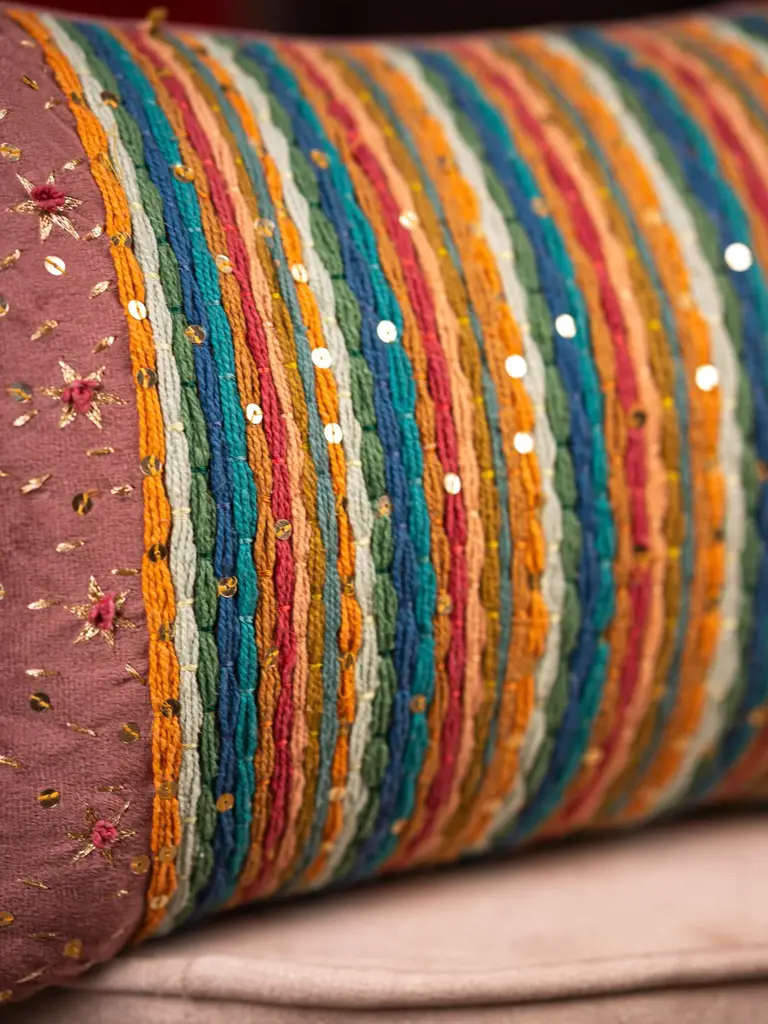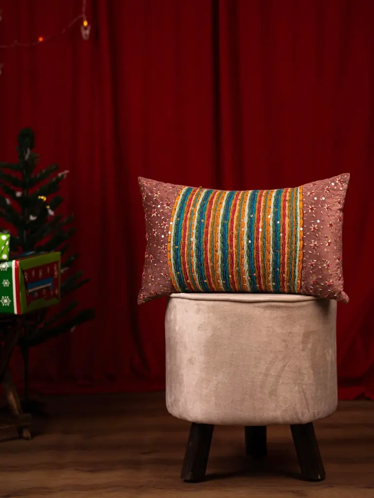 "Add a burst of color to your home with this striking lumbar cushion featuring vibrant, multicolored stripes on a warm mauve base. Adorned with intricate golden sequins and delicate embroidery, it exudes a festive charm while providing a cozy, luxurious accent to your decor. Perfect for livening up your living room or bedroom during celebrations or any time of the year. Material: Velvet" Care:- "Hand Wash Plain Wash Dry Clean / Spot clean Do not bleach Do not iron print, Do iron on the reverse Do not pull any yarn; trim with a scissor Do not rub the stain" "Please note: All of our products are meticulously handcrafted by artisans. We pay close attention to the product's quality, appearance, and feel. However, because of the participation of humans in the manufacturing process, a little amount of variation in the product's size, color, look, and quality is to be expected; however, this is what makes it unique. “The color of the product may vary depending on the display of your screen. Please note that there will be slight variations in appearance and designs as per the size ordered.”"