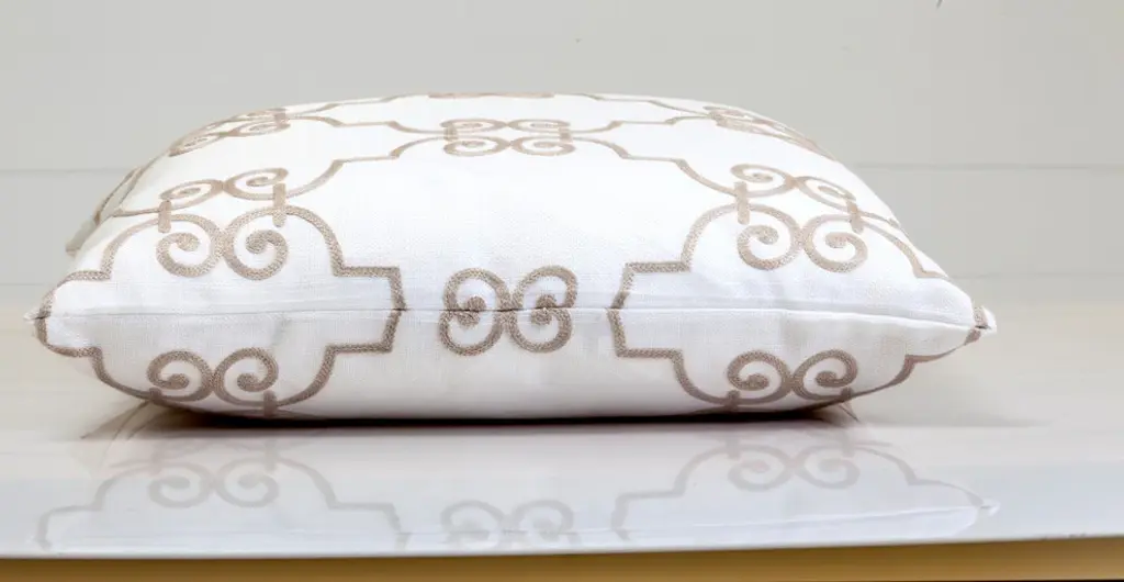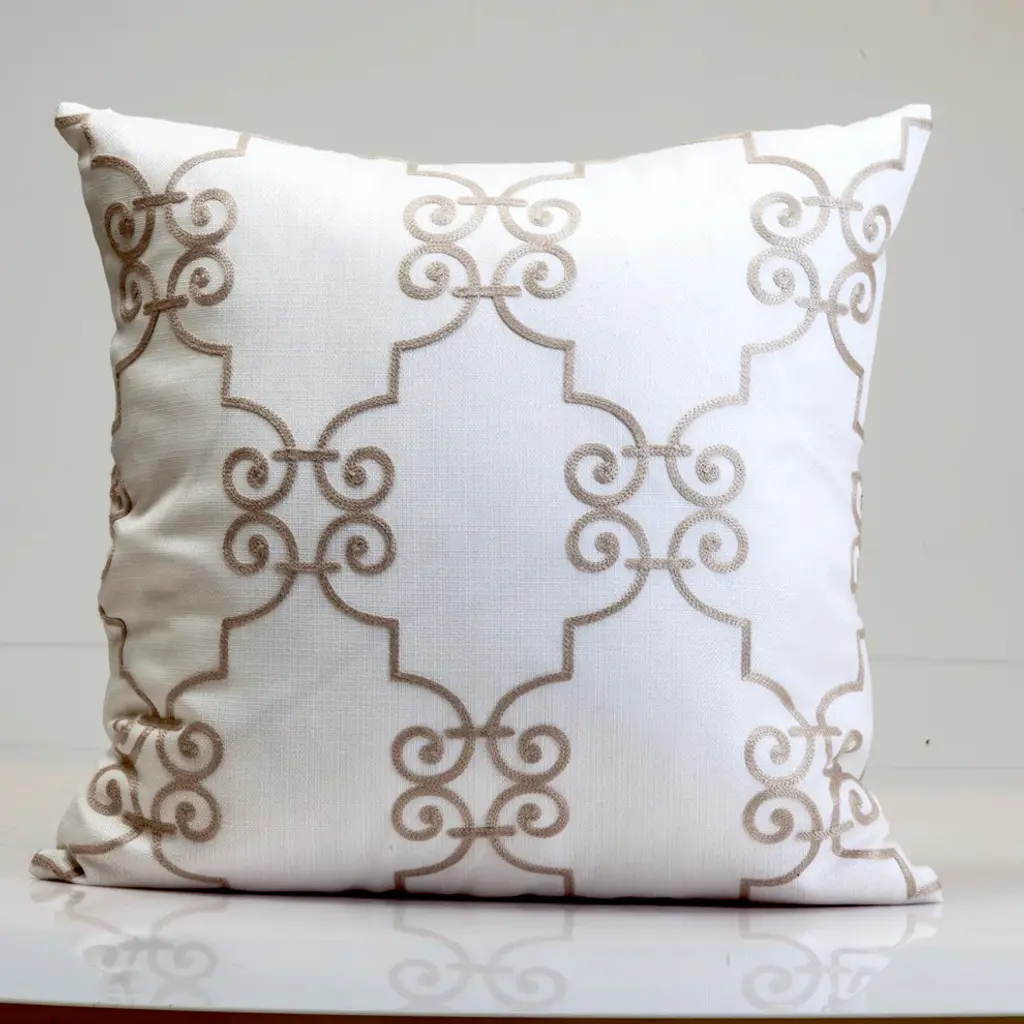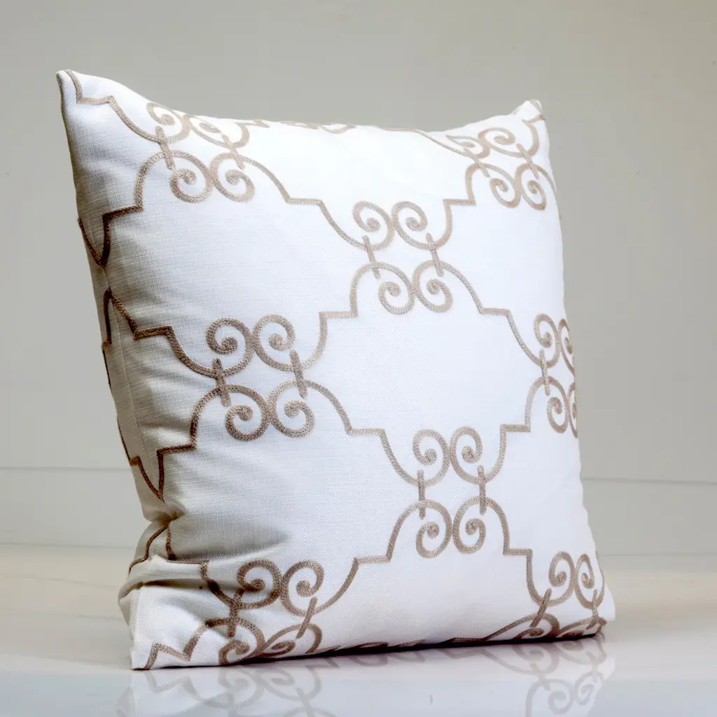 Add a classy element to your room with this great pillow cover by Kasmir fabric. Design is called IONIC SCROLL SNOWFLAKE Fabric and is embroidered in gold. Fabric is on both sides of the cover. Content: 100% PolyesterColors:white, gold. Construction: sergged inner seams and invisible zipper.Size in the image: 20"x20".DESIGN PLACEMENT MAY VARY FROM THE IMAGE SHOW. The sale is for 1 pillow cover and does not include pillow insert. Care: dry clean.