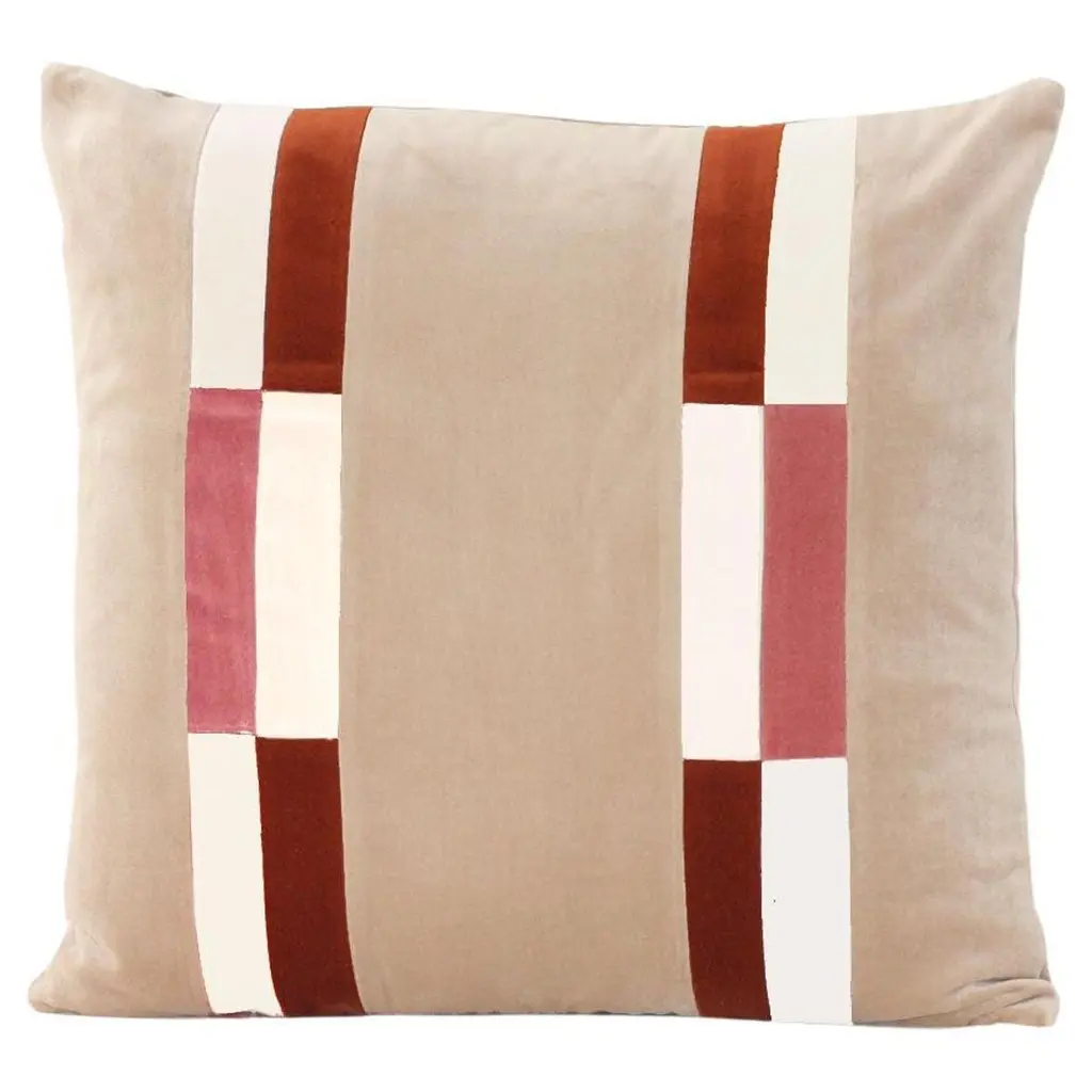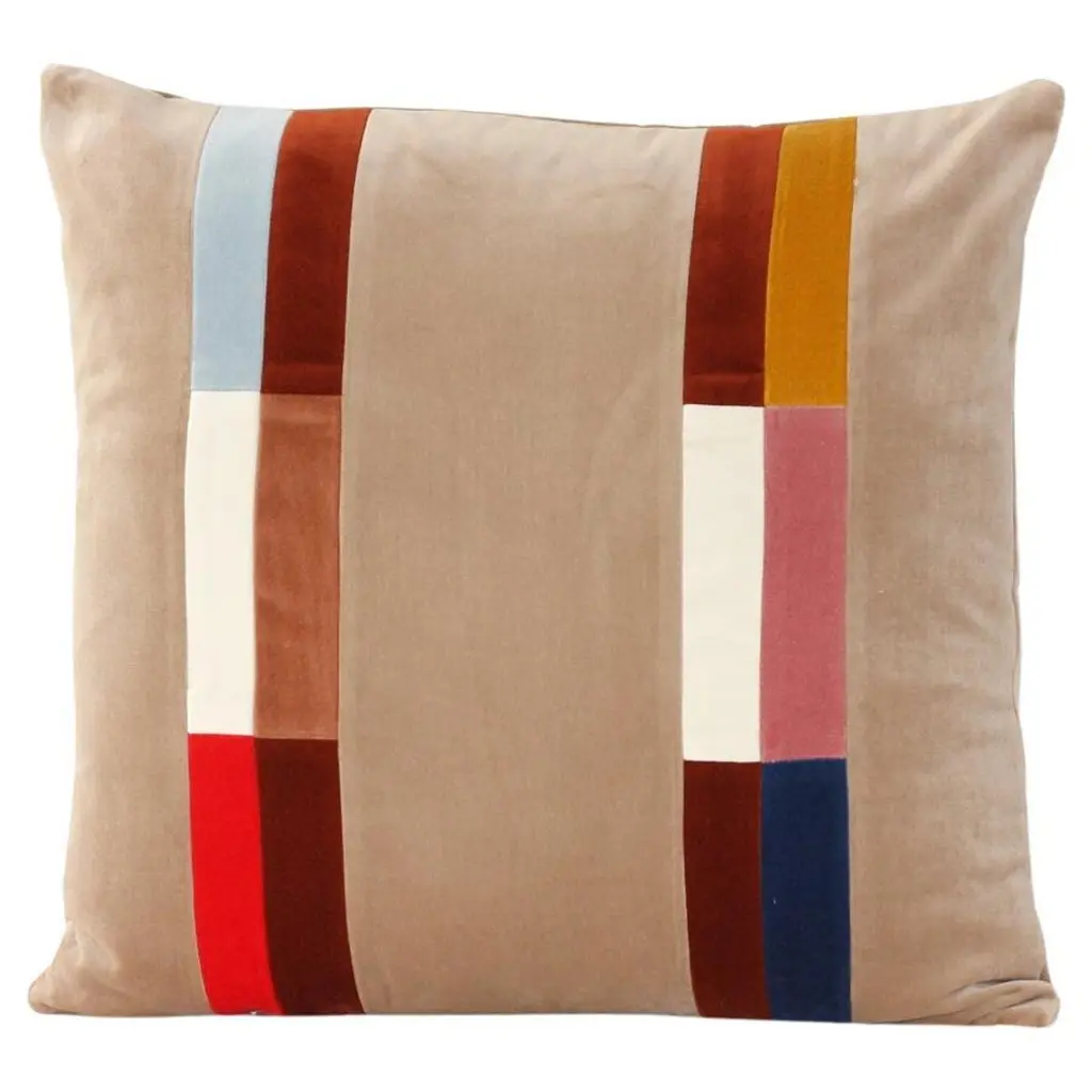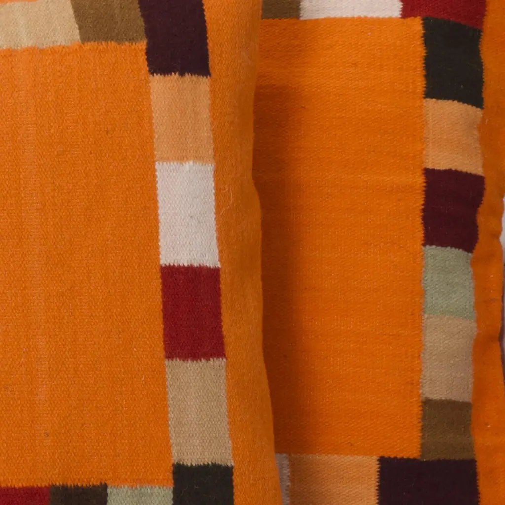 Colorful rectangles surround dazzling cushion covers inspired by the sun. By Zosimo Laura, the pair is superbly crafted of hand-loomed wool. Parallel sunbeams cover the back of the design, and capirona wood buttons complete them.
