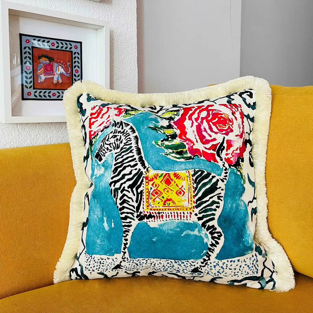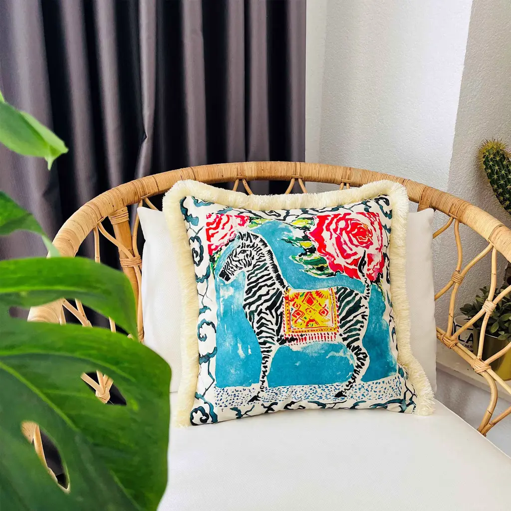 Bring elegance and symbolism into your home with this stunning Zebra Pattern Throw Pillow Cover! Designed for those who appreciate unique, artistic touches, this cream velvet cushion features a bold zebra motif, symbolizing power and individuality.Key Features:Artisan Design: Showcases a zebra print inspired by exclusive watercolor paintingsPremium Quality: High-resolution print on soft velvet with first-class craftsmanship for a truly refined look.