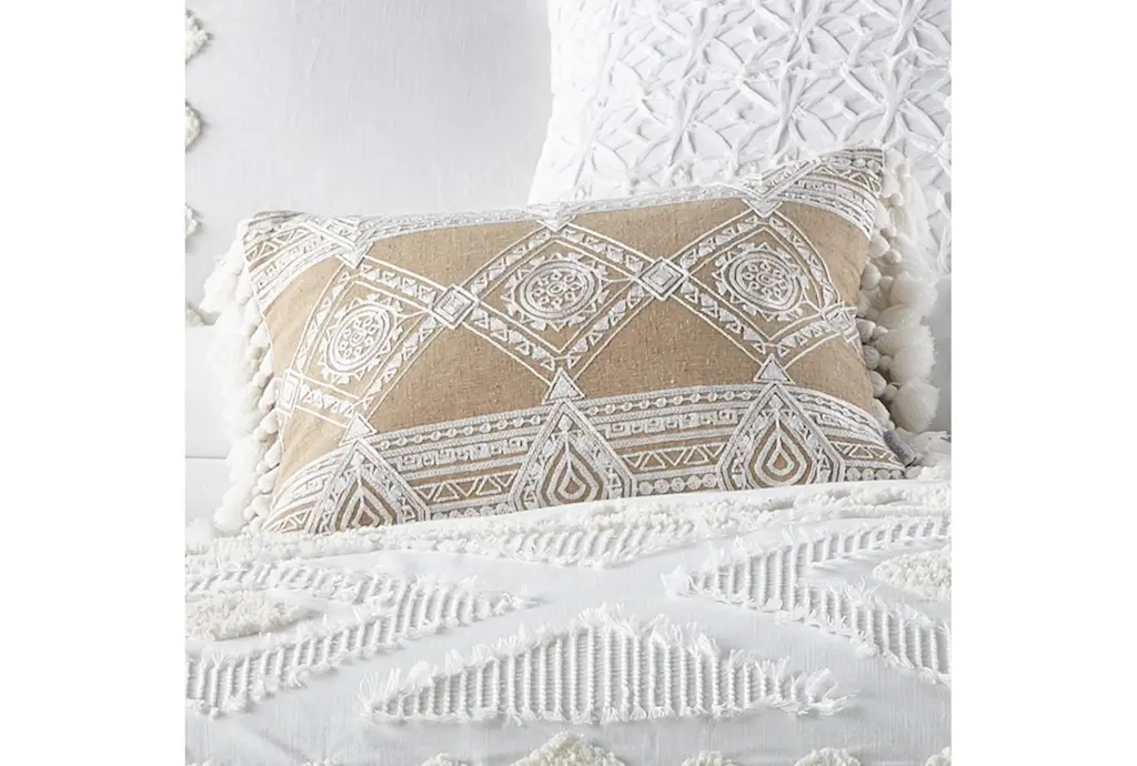 Bring a touch of boho charm to your living space with the 14X18 White Cotton Diamonds Rectangle Pillow. Featuring a stunning Aztec design, this taupe pillow is adorned with playful tassels that enhance its unique look.